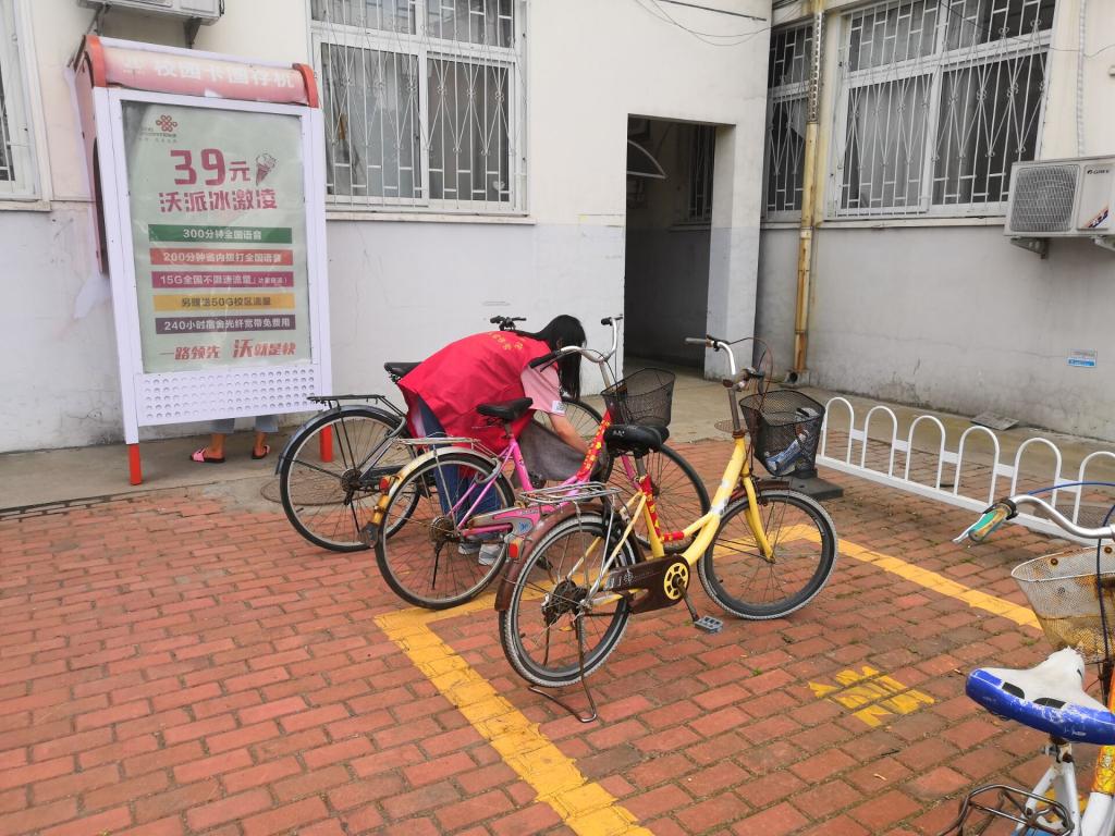 校园是我家,美化靠大家。早上八点集合后,在宿管老师的指挥下,各组小组长带领本组成员到达制定划分范围,开始有序地整理车辆的停放。志愿者按照车的类型,将电动车与自行车分类,整齐地摆放在马路的两旁;同时将废弃车辆搬运到17号宿舍公寓一楼的院子,以便回收整理,以及再利用制作“爱心单车”,供同学们使用。扶起倒下自行车,摆正位置以便节省空间;同时在整理车辆过程中,志愿者们不断向过往路人宣传有序摆放车辆的重要性,以及劝导他们放好自己的车,避免不必要的麻烦。在历时三个小时后,本次整理爱心单车活动在志愿者的合影下圆满结束。