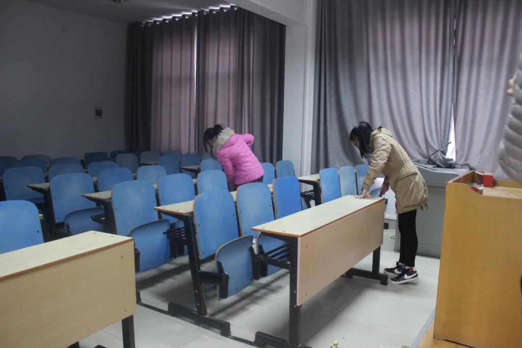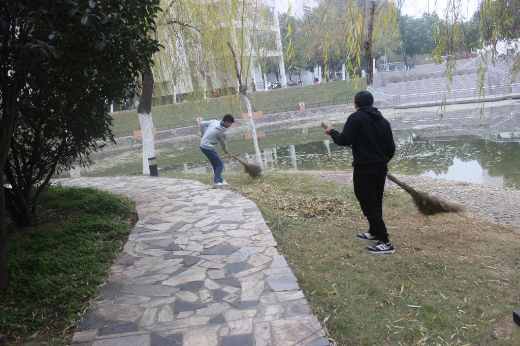 在明亮宽敞的公共课教室里,社员们在后勤工作人员的指点与帮助下,卖力地擦除某些学生涂写在课桌上的字、图;在冷风瑟瑟的毓秀园中,同学们拿着长竹帚和钳子,耐心地清理着园中的垃圾;教学楼安静的楼道中,社员们仔细地清扫着地上的灰尘和小碎屑,一行人与指导他们的阿姨相谈甚欢。下午5点,此次活动在社员们交流感想中结束。