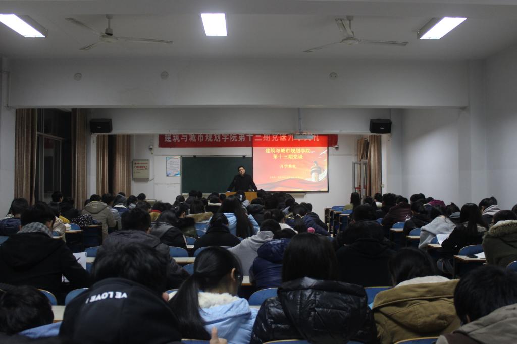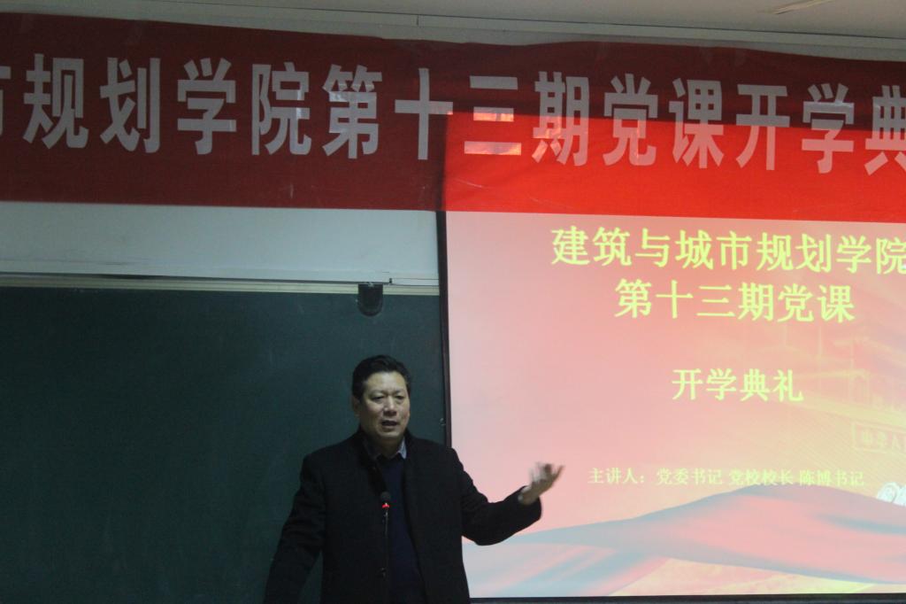 2016年11月25日晚上七点,建筑与城市规划学院第十三期党课开学典礼正式举行。主讲人是建筑与城市规划学院党委书记,党校校长陈博,出席党课开学典礼的老师有我院团学办公室主任杜鹤,第五学生党支部书记马兴波老师及我院申请入党的学生。