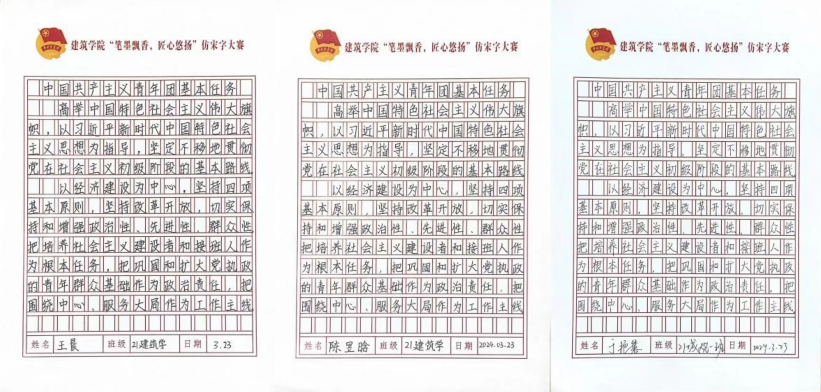 此次仿宋字比赛,旨在传承中国共产主义青年团的光荣传统,弘扬中华优秀传统文化,同时也提高了学生的书写水平,展现了建筑学子积极向上的精神面貌。