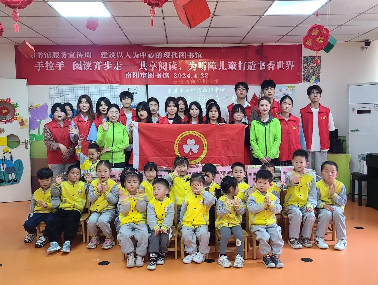 本网讯(学生记者/王菲)为培养幼儿良好的阅读习惯,让他们的成长之路有浓郁书香为伴,4月22日,苜蓿社和南阳未来聋儿听力语言康复中心联合举办“万物复‘书’,阅读同行”特色活动。苜蓿社20名志愿者及康复中心部分儿童、家长和老师参加。