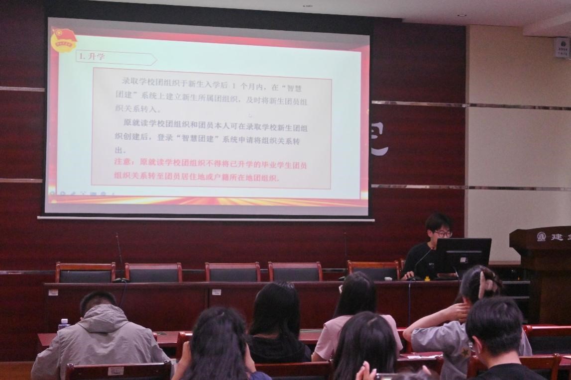 会上,李欣老师首先介绍了毕业生团员组织关系转接的相关流程及分类,并对同学们关心的考公、读博、出国留学等情况对应的组织关系转接事宜进行了解答,随后,学生团委副书记黄科钦为大家做了详细的转接工作培训。