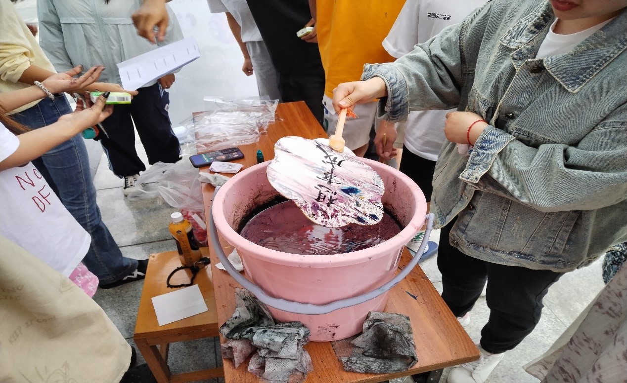 在漆扇制作区,每位参与者都在争先答题,通关后选择心仪的颜色在水面上创作,为团扇创作别出心裁的图案,并前往同苜蓿社合作的书法协会题字。每一把漆扇都是独一无二的艺术品,展现了制作者的个性和审美。