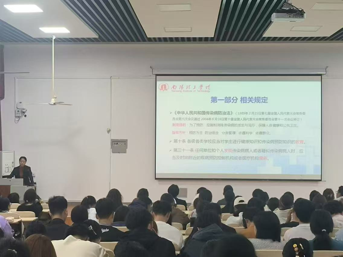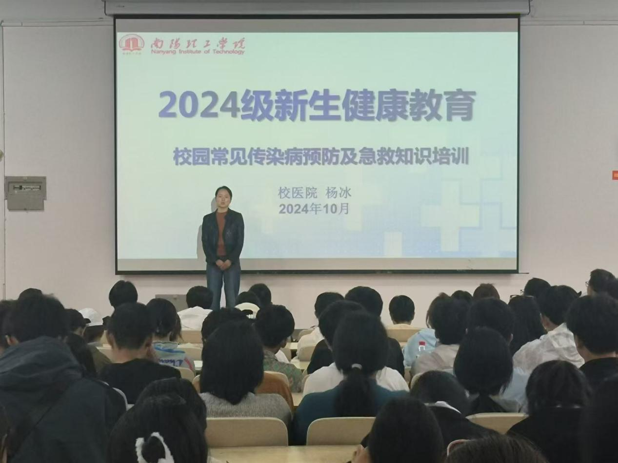 本网讯(学生记者/朱思念)为增强广大师生对秋季传染病的防控意识,提高自我保护能力,普及卫生健康知识,10月17日,6686体育举办2024年秋季健康教育及传染病防治知识讲座。本次讲座由南阳理工学院校医院杨冰医生担任主讲,24级全体学生参加。