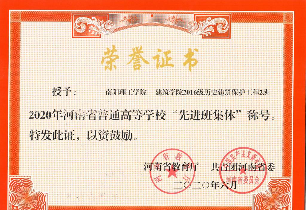 2020年河南省“先进班集体”荣誉证书