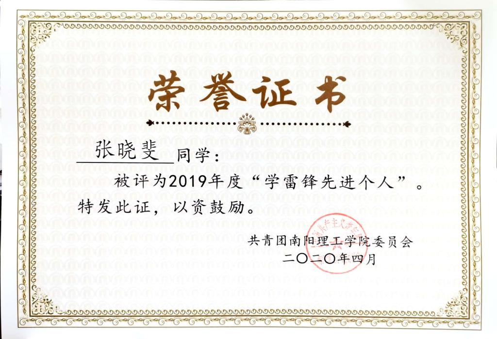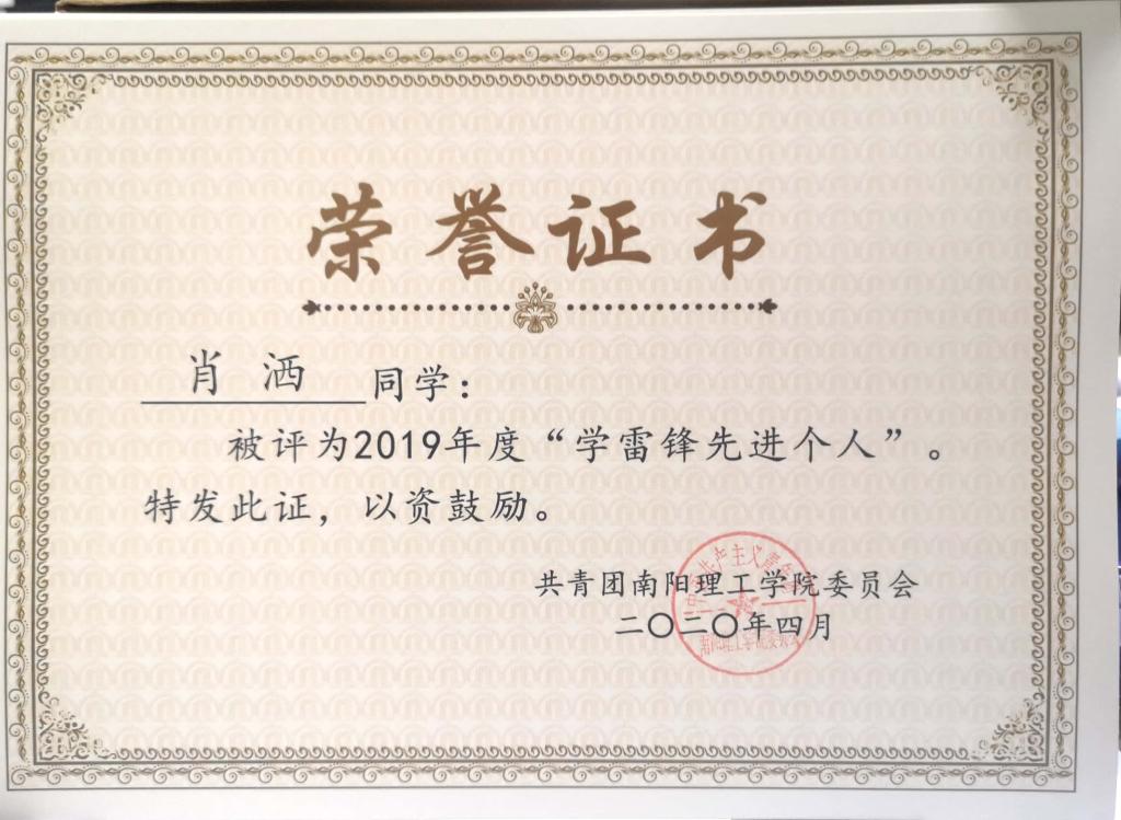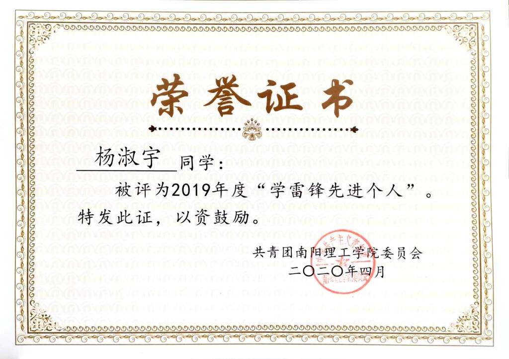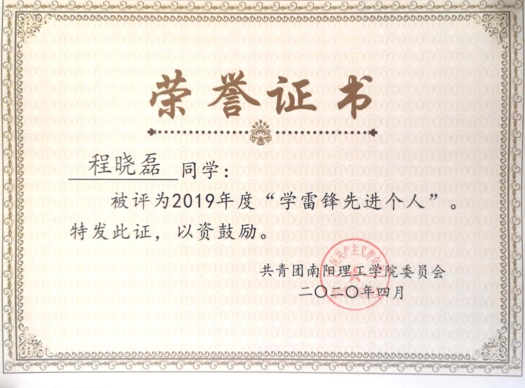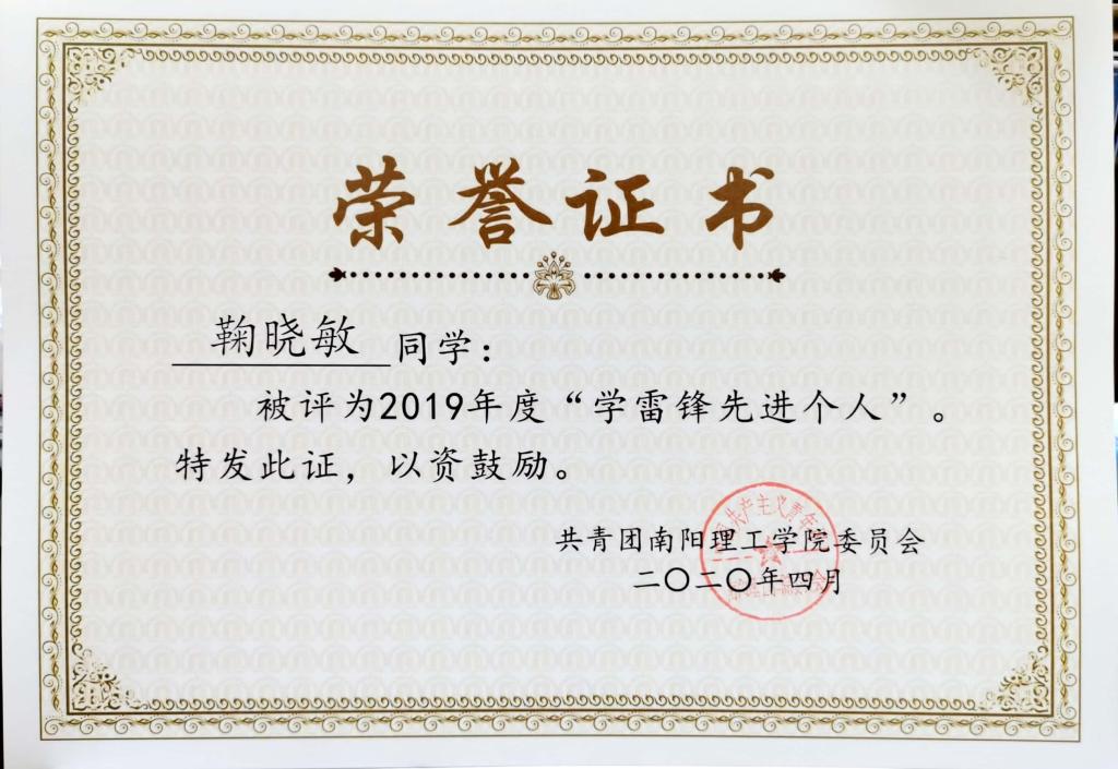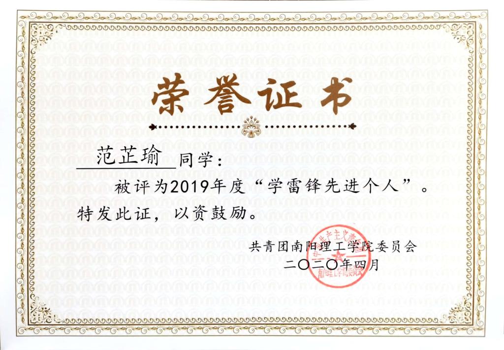 2019年度南阳理工学院“学雷锋先进个人”荣誉证书