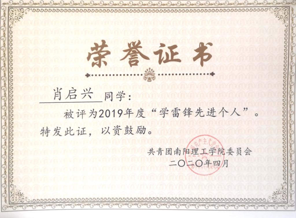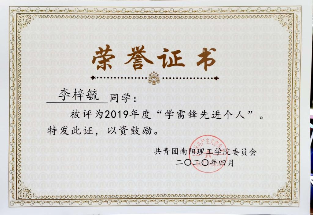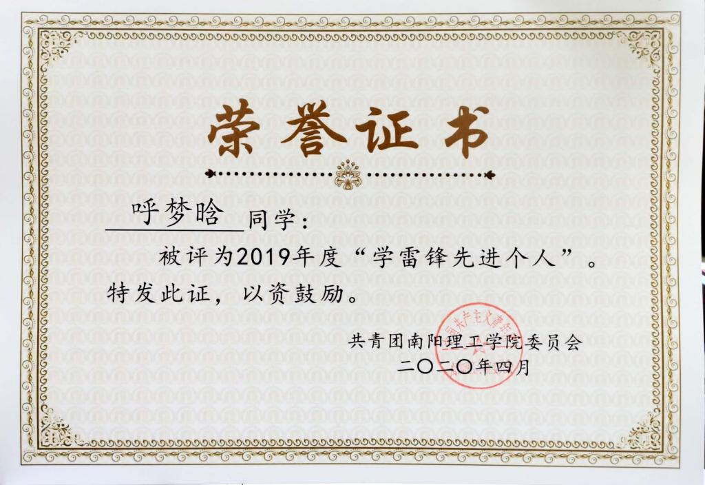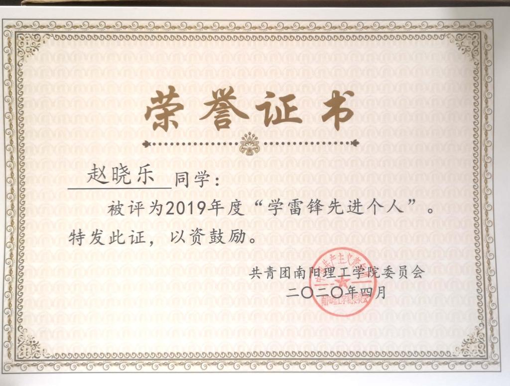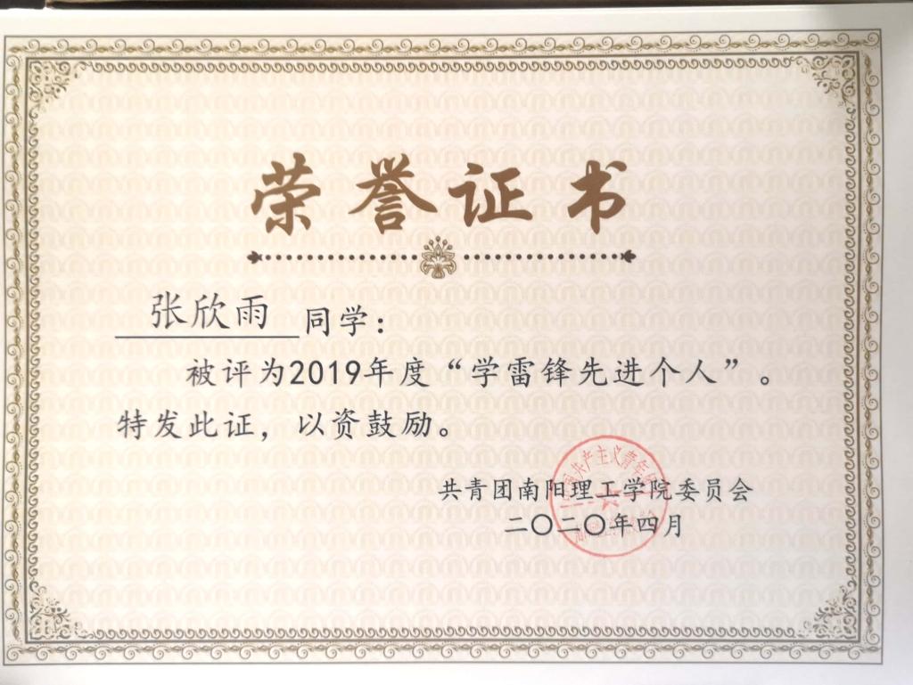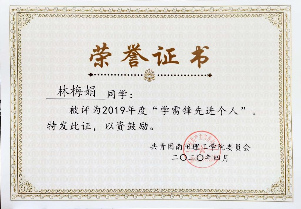 2019年度南阳理工学院“学雷锋先进个人”荣誉证书