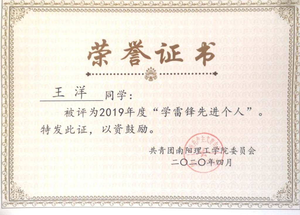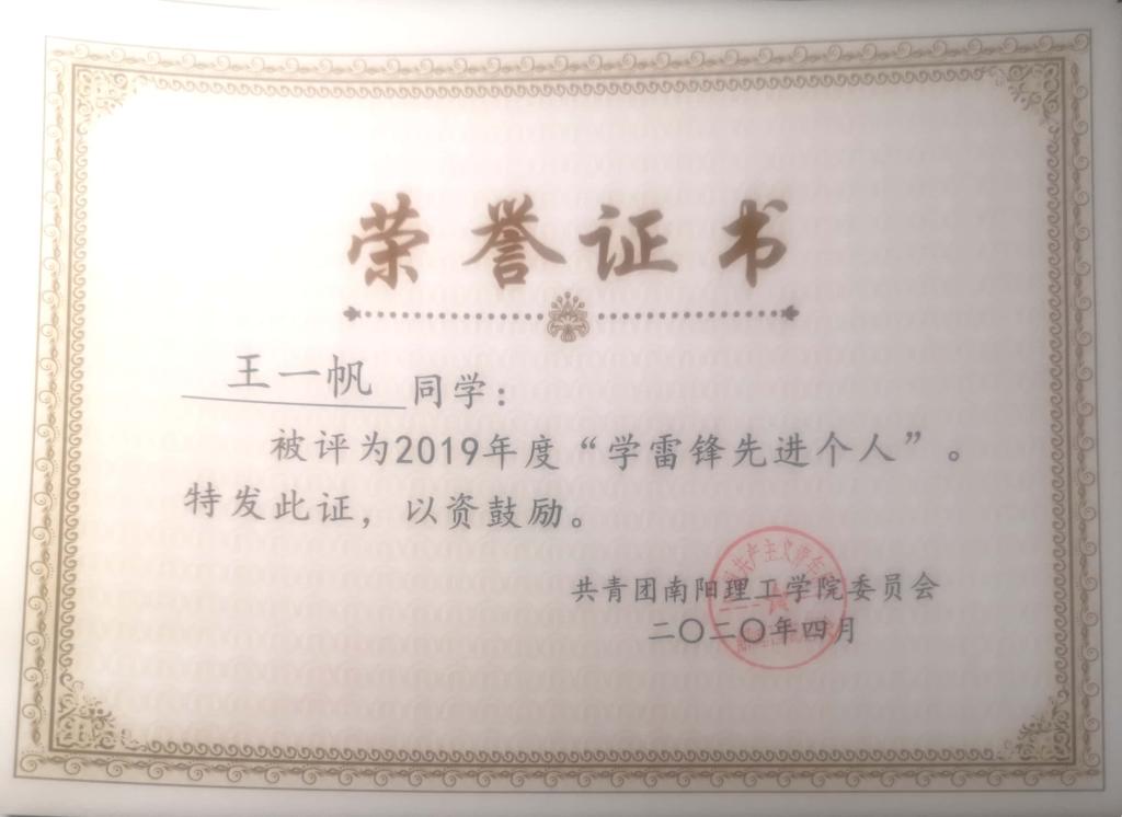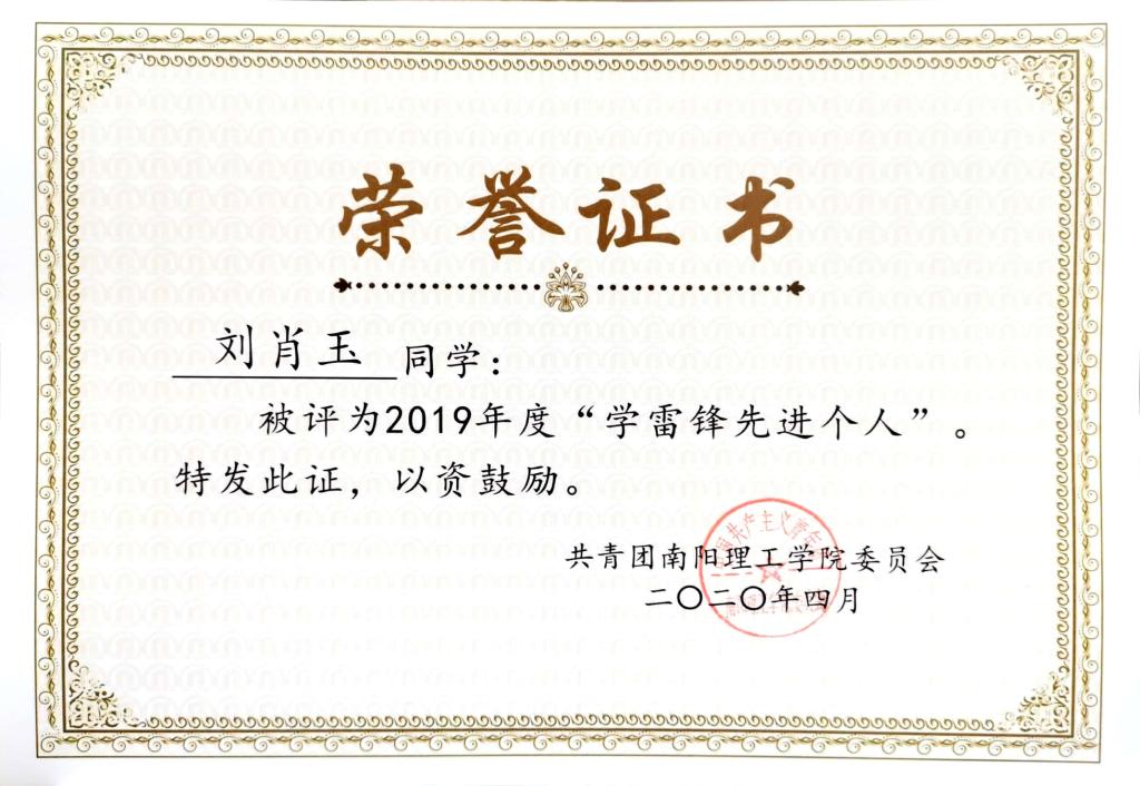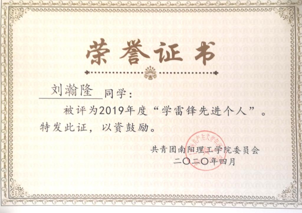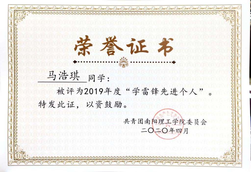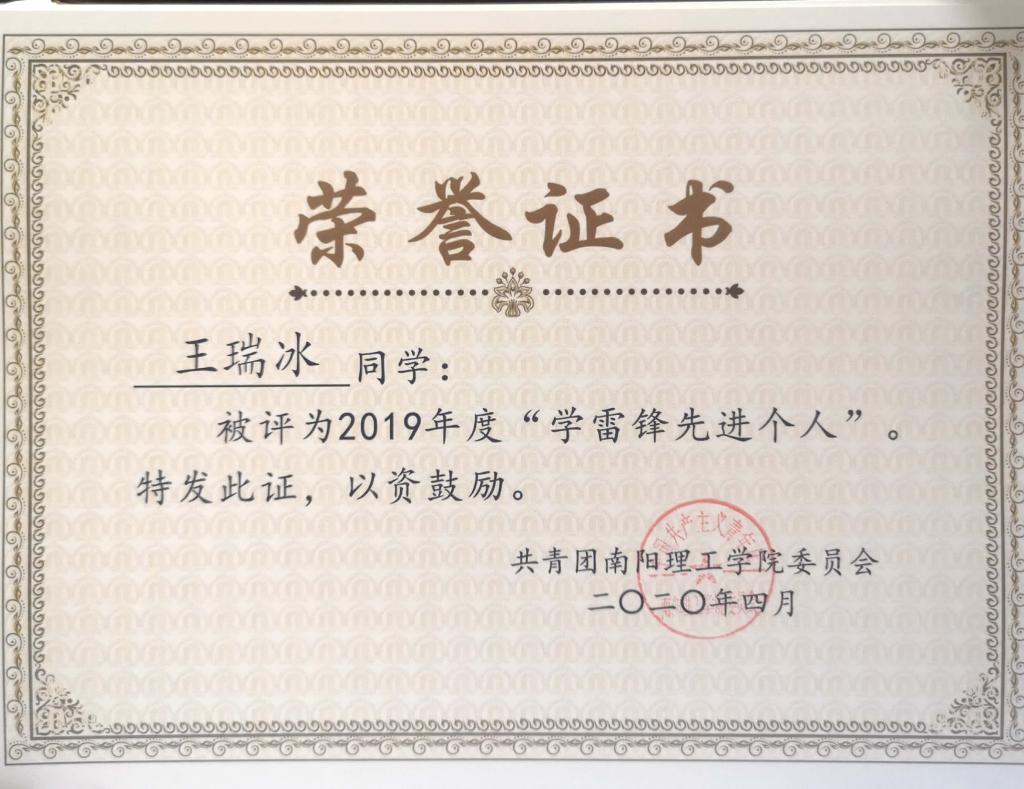 2019年度南阳理工学院“学雷锋先进个人”荣誉证书