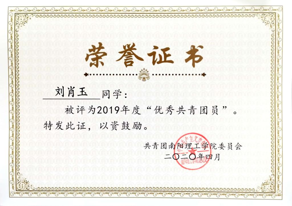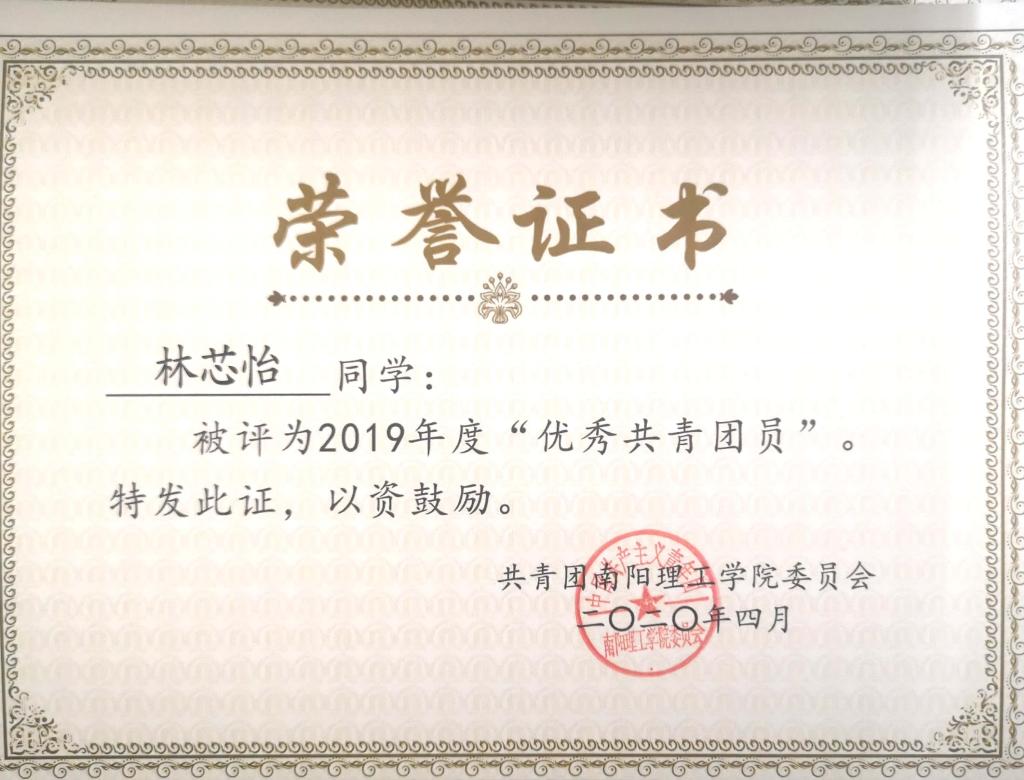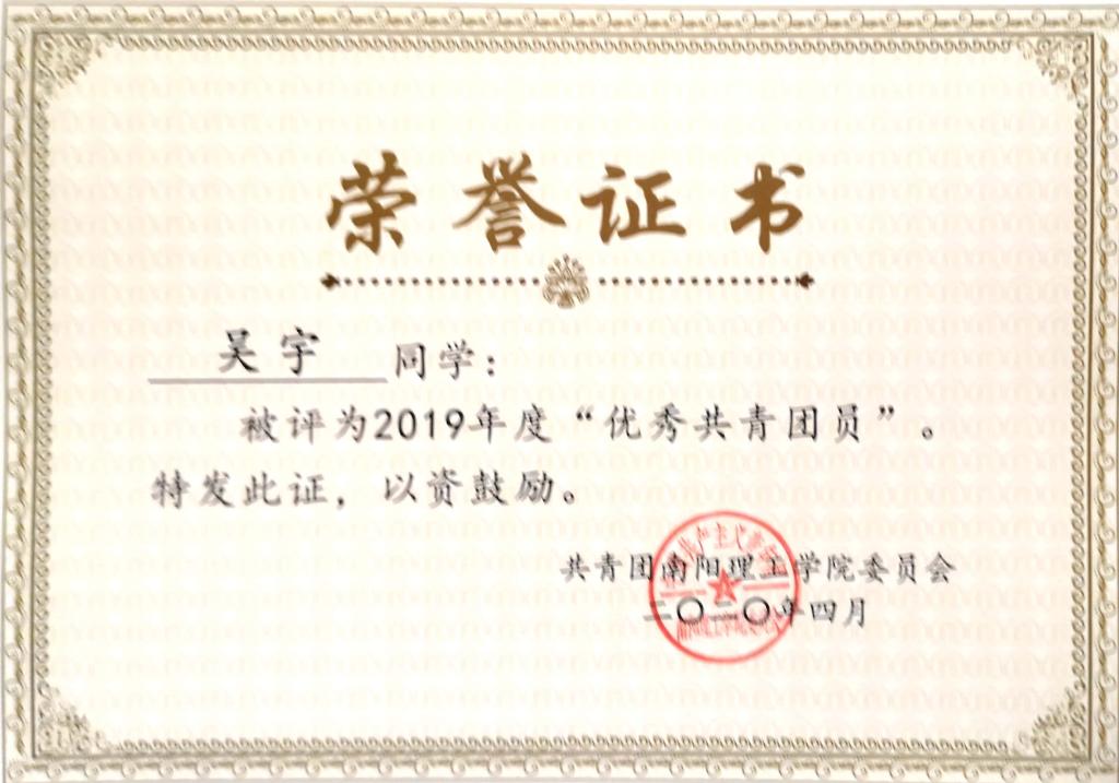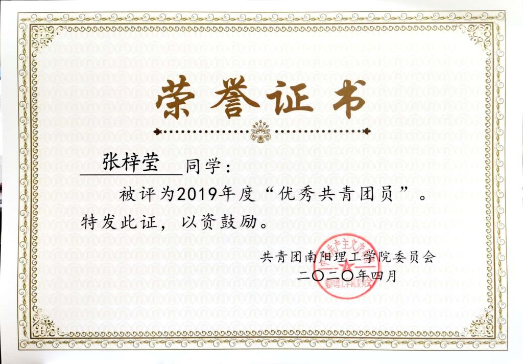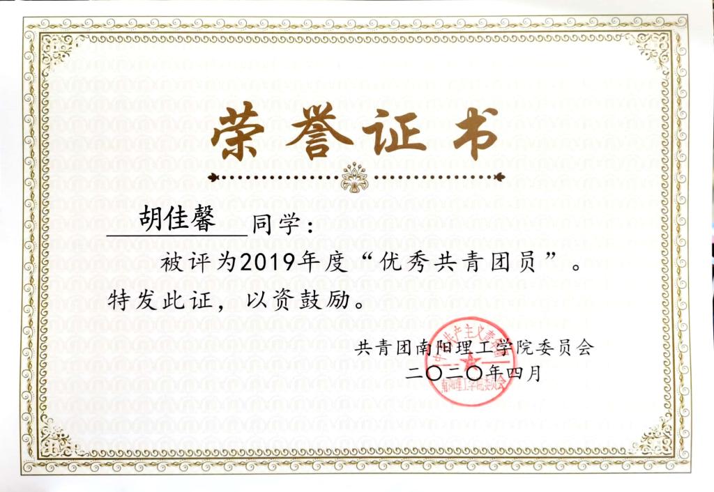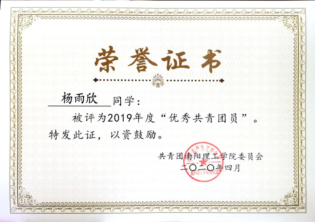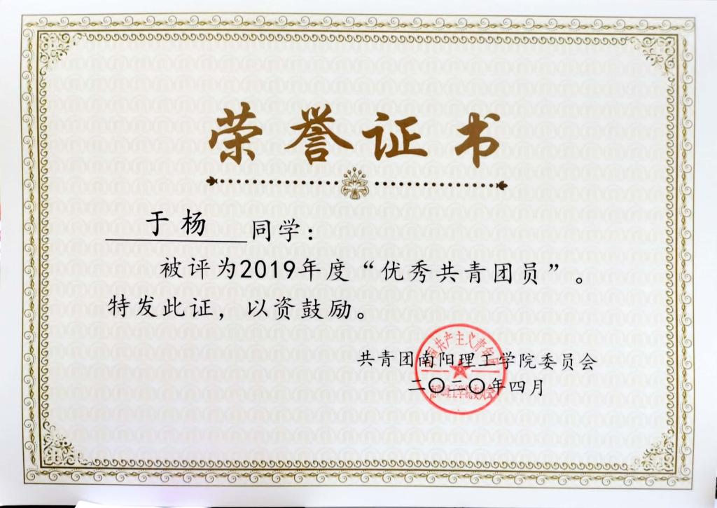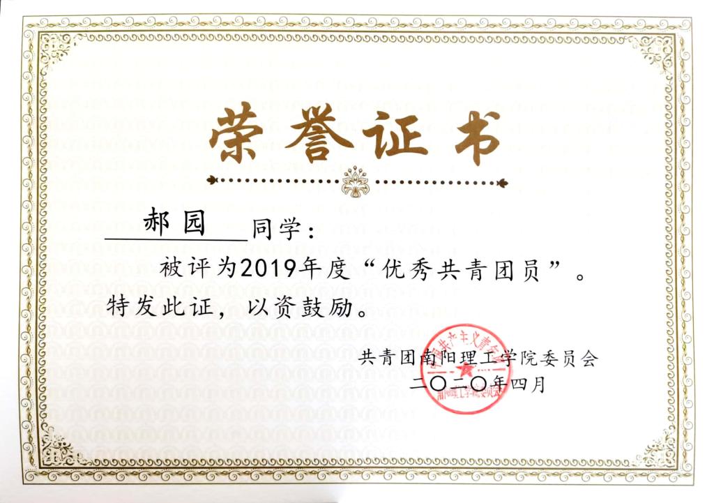 2019年度南阳理工学院“优秀共青团员”荣誉证书