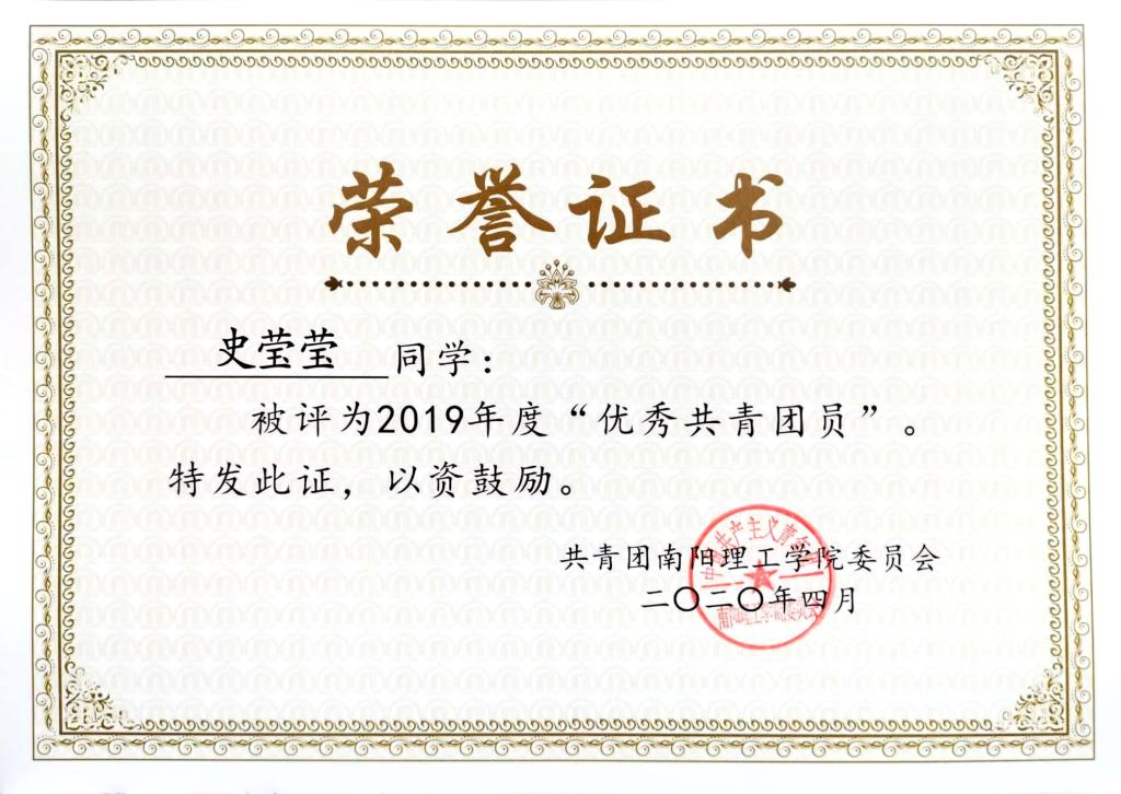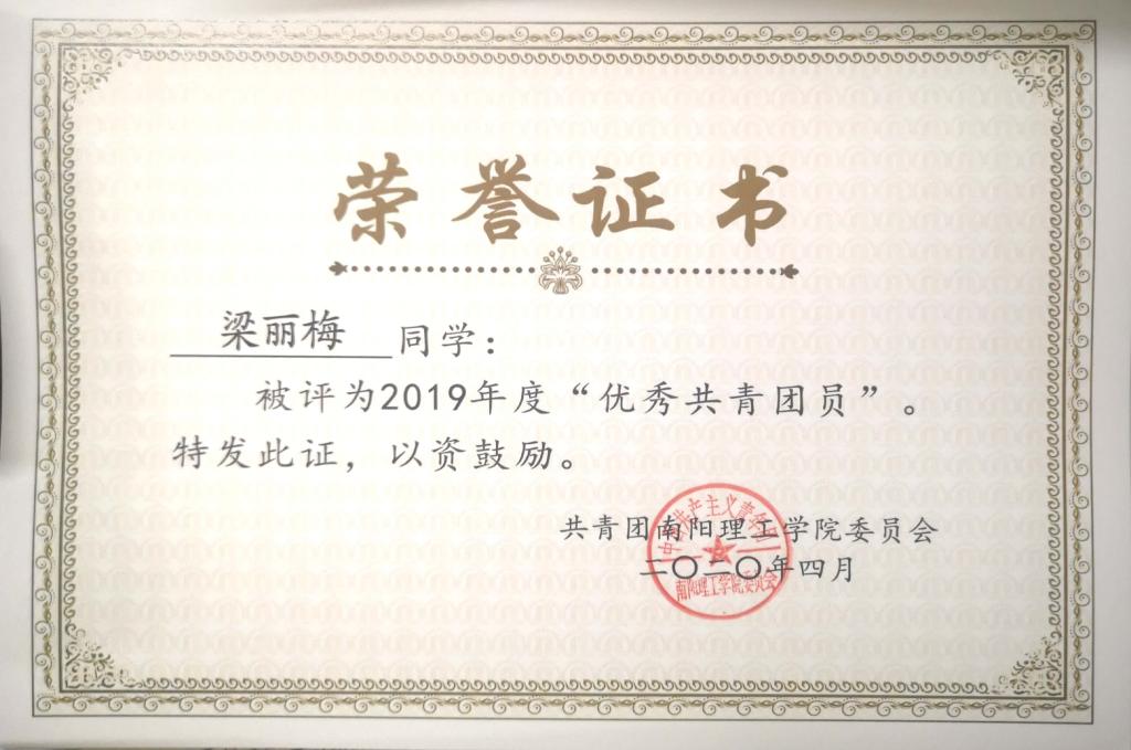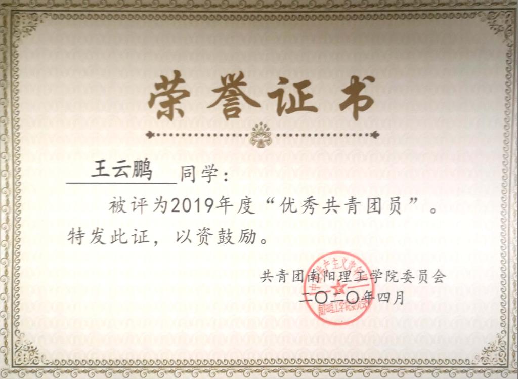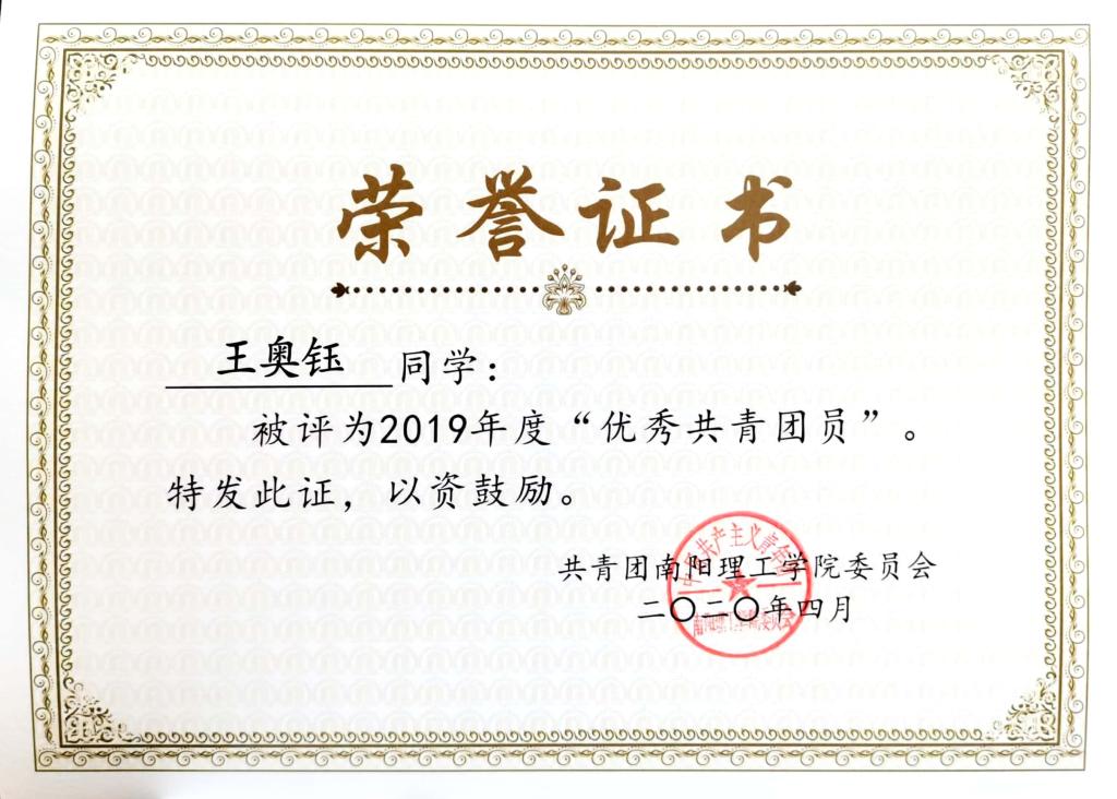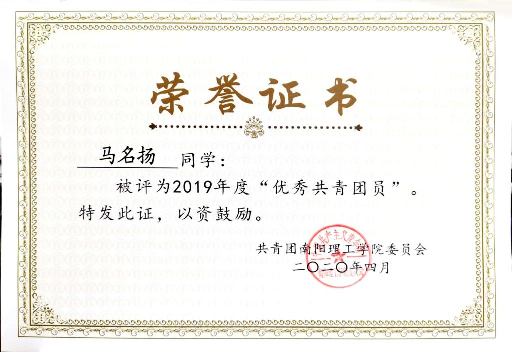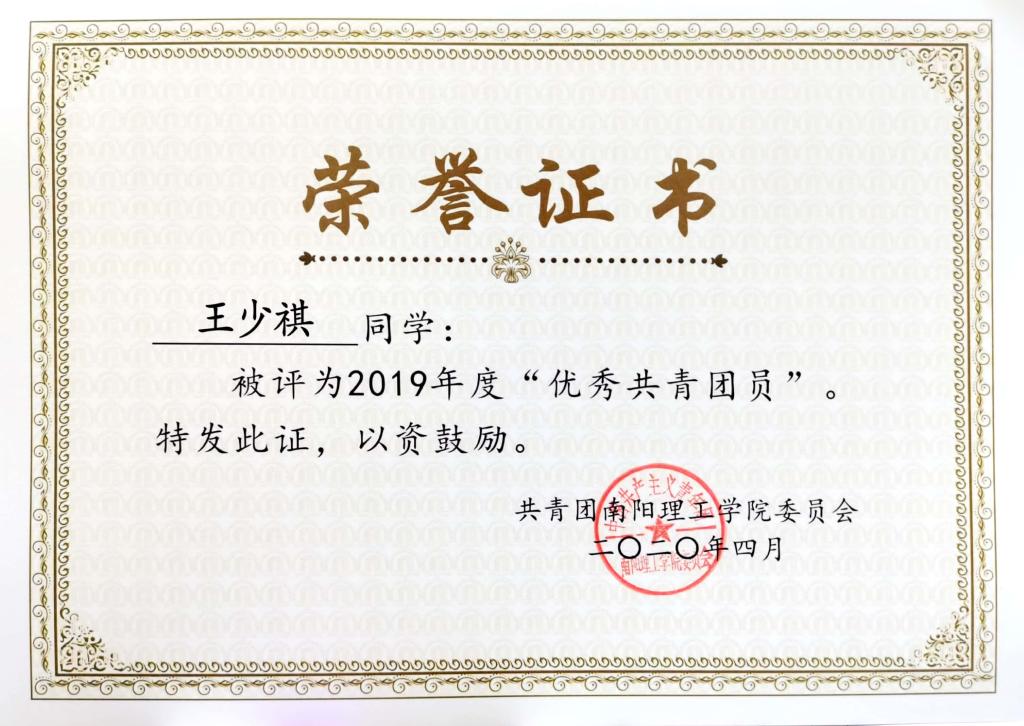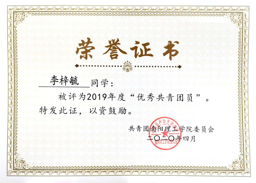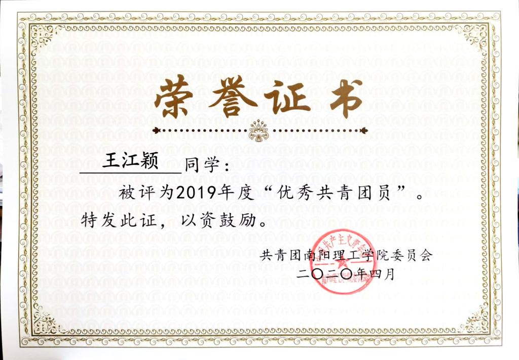 2019年度南阳理工学院“优秀共青团员”荣誉证书