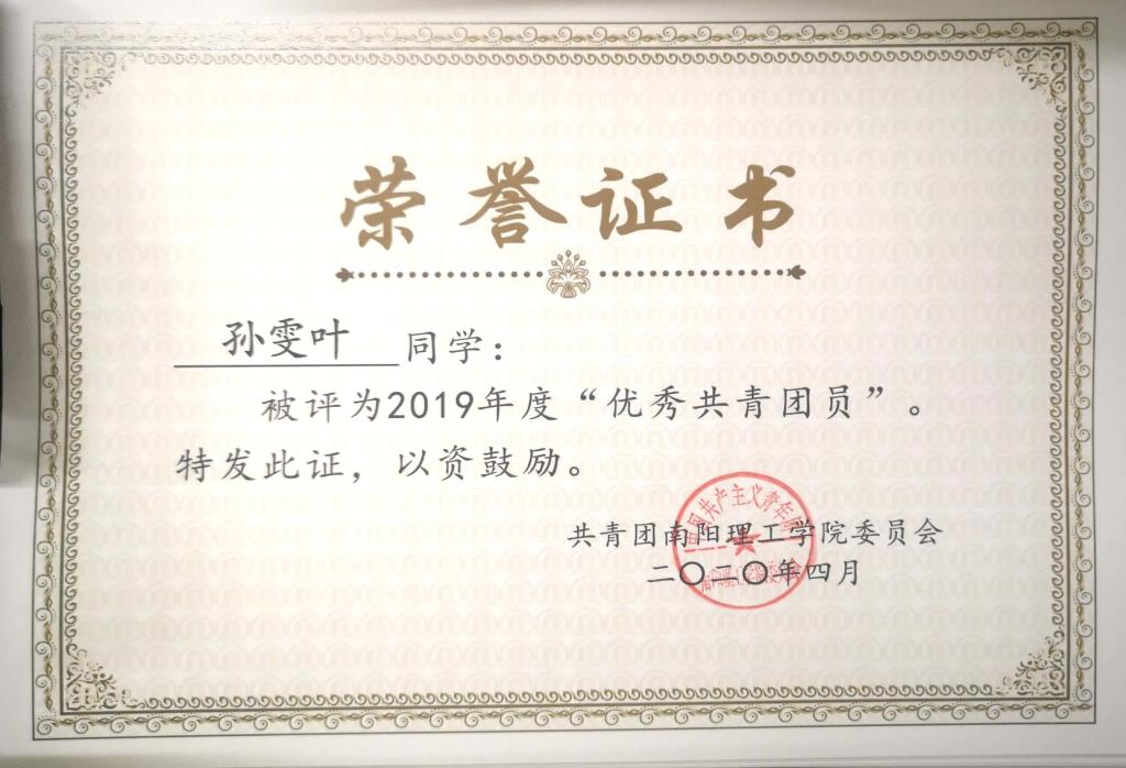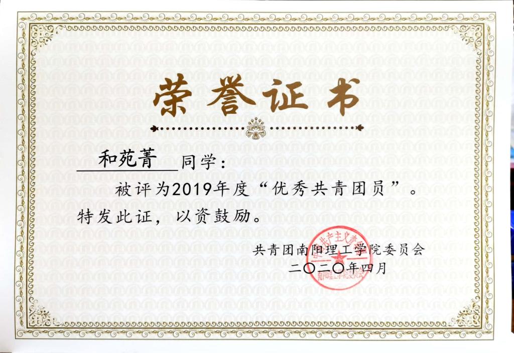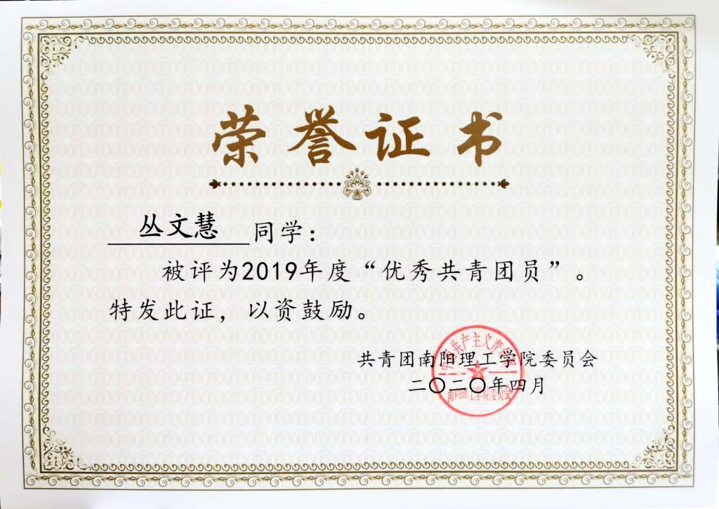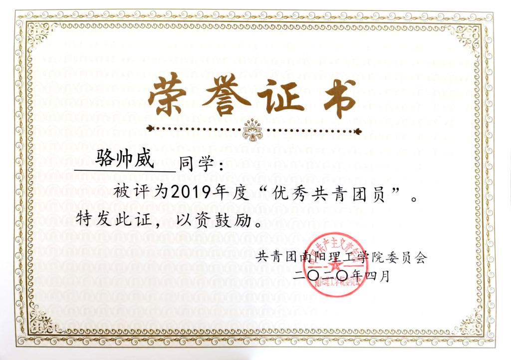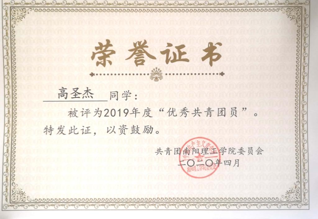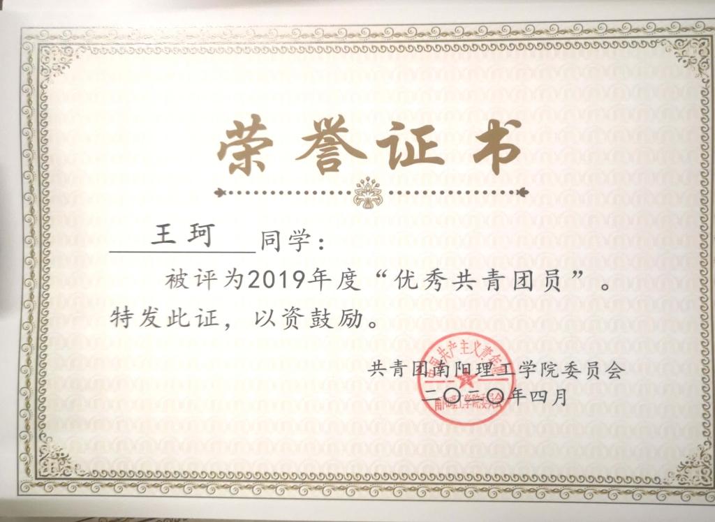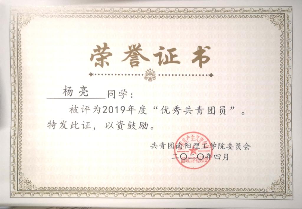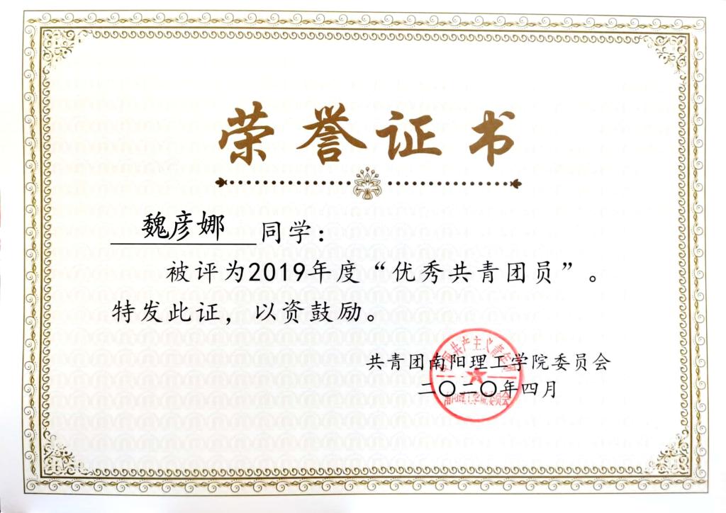 2019年度南阳理工学院“优秀共青团员”荣誉证书