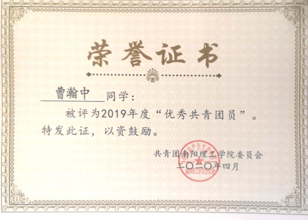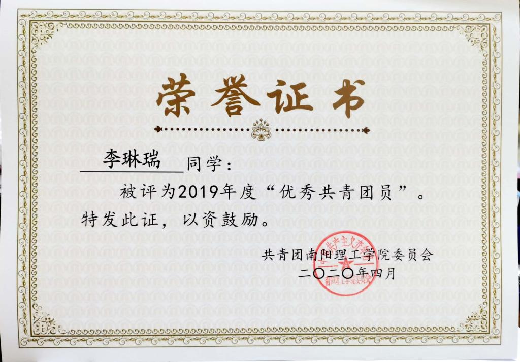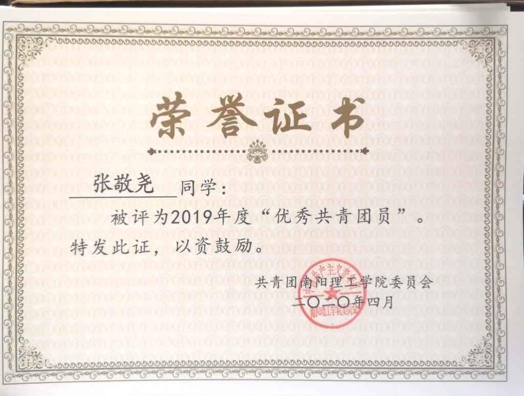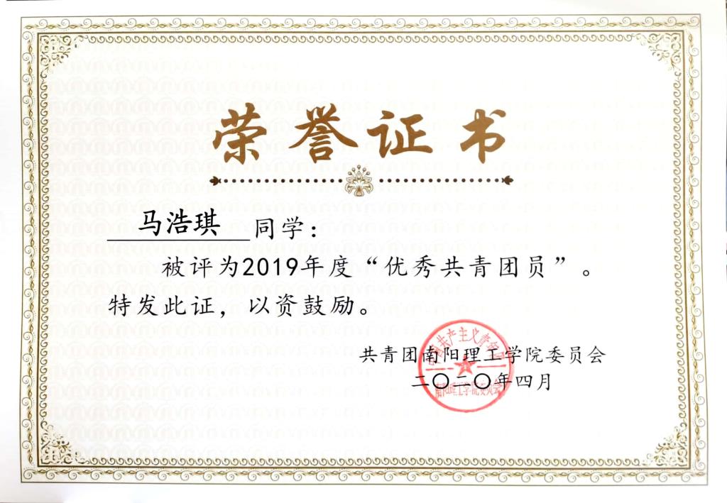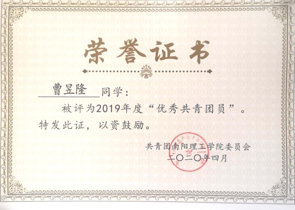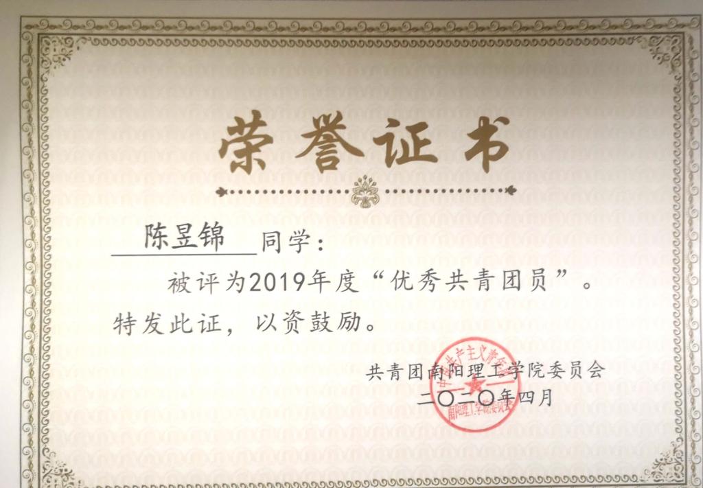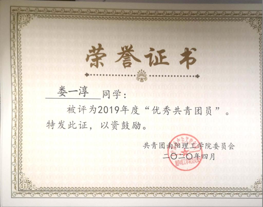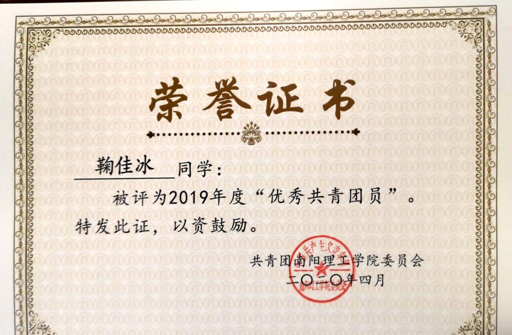 2019年度南阳理工学院“优秀共青团员”荣誉证书