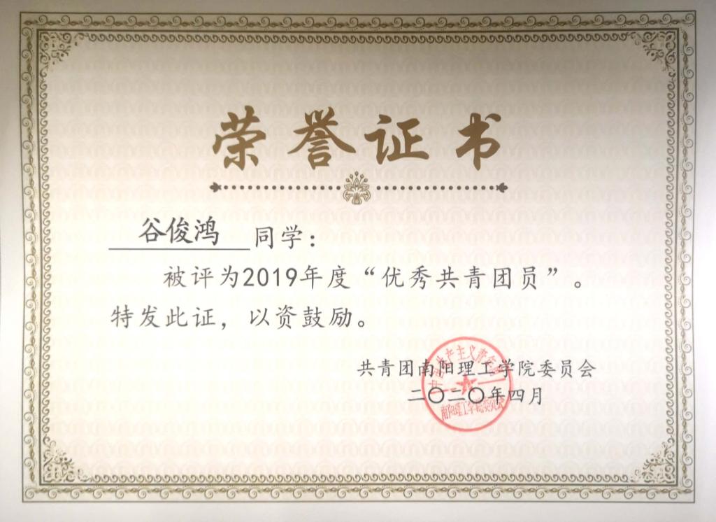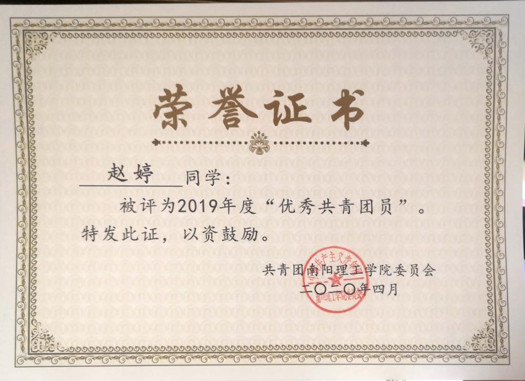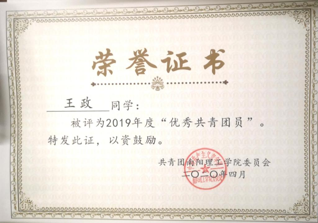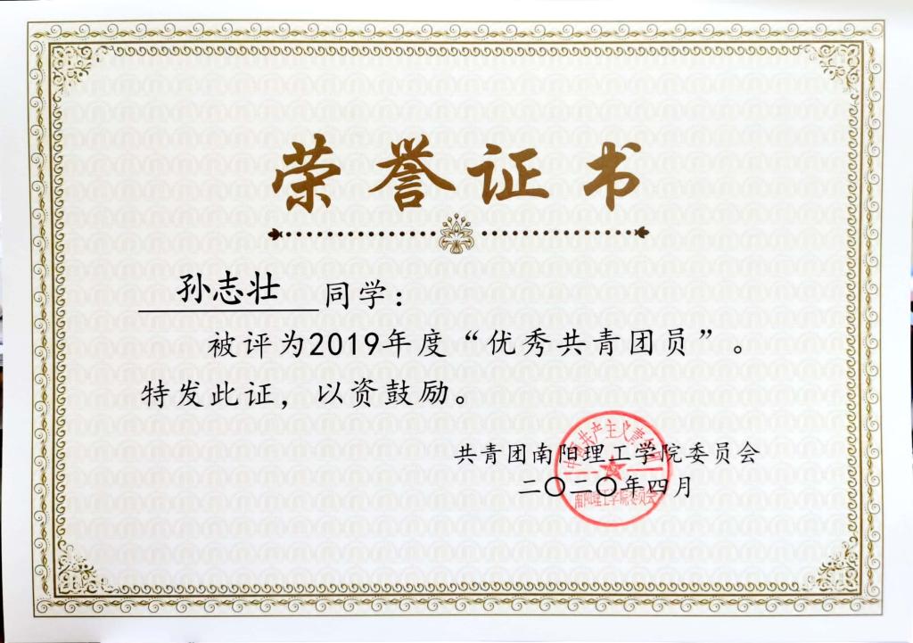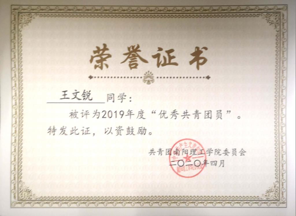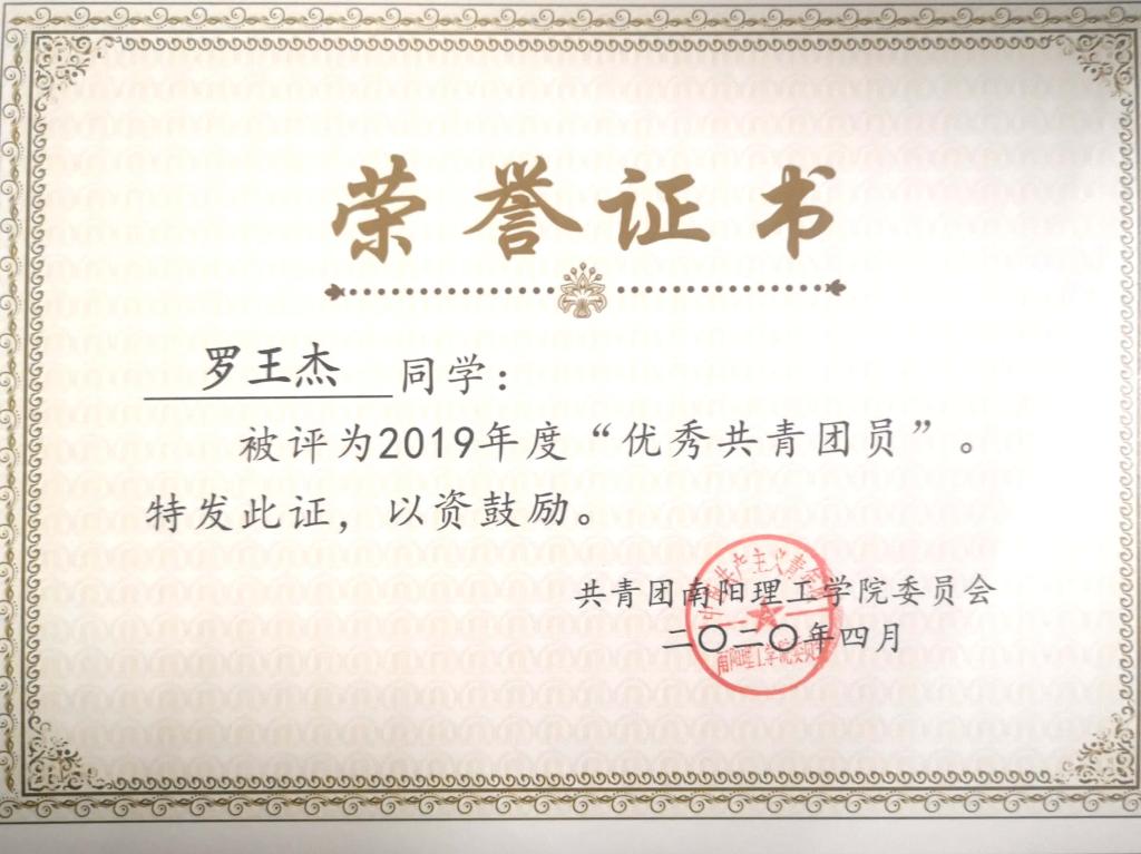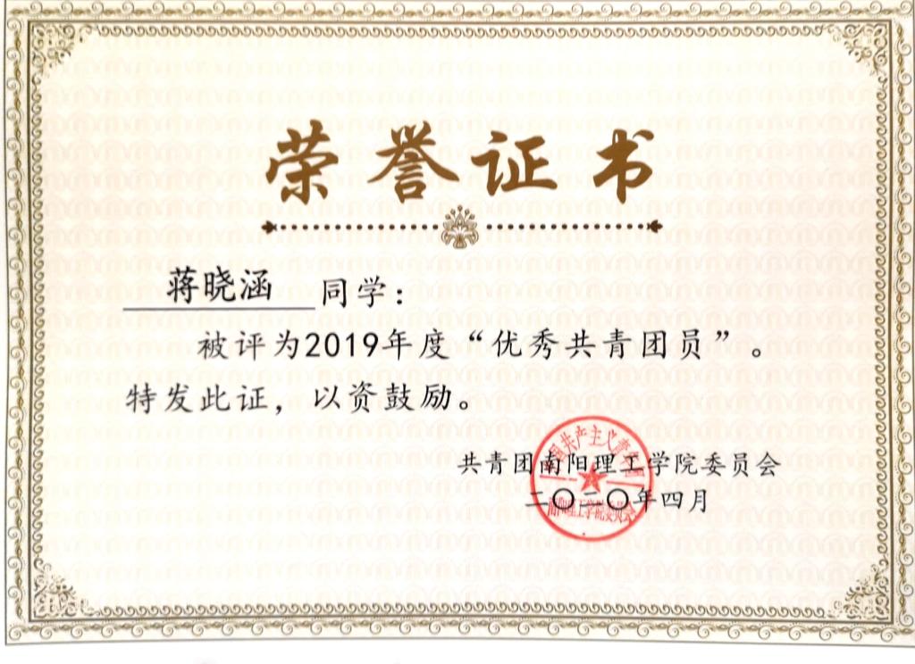 2019年度南阳理工学院“优秀共青团员”荣誉证书