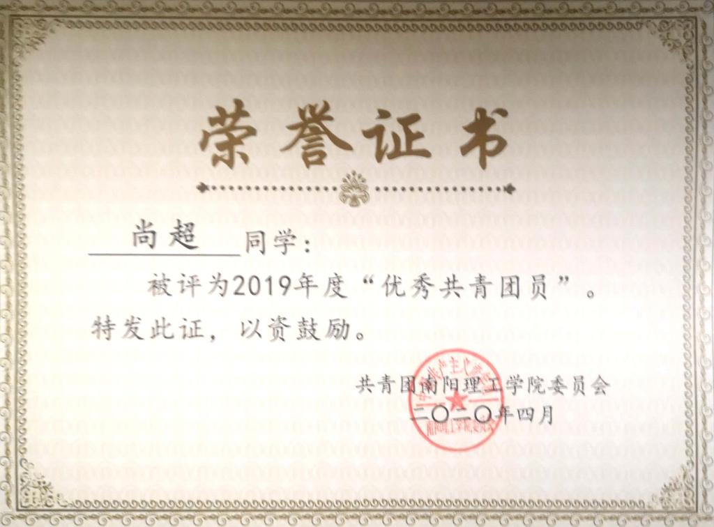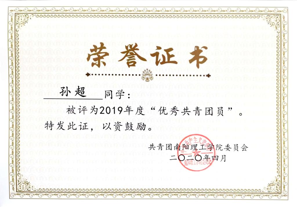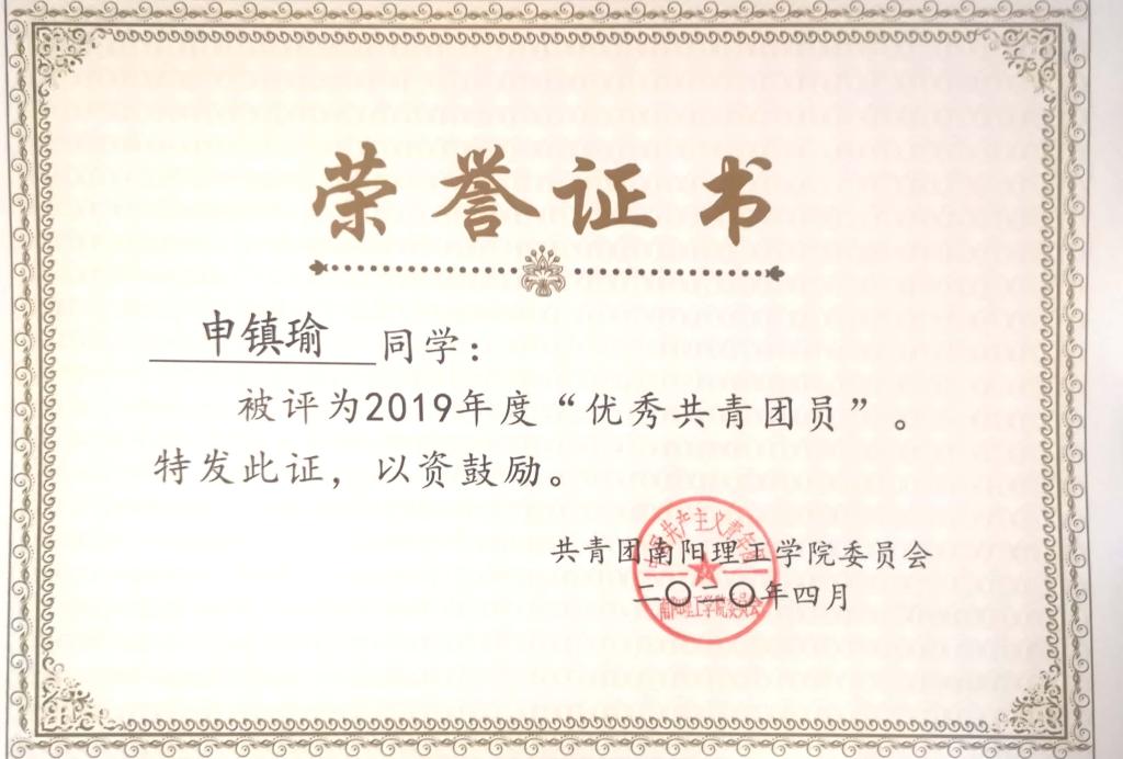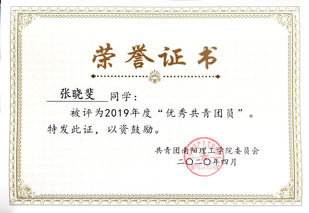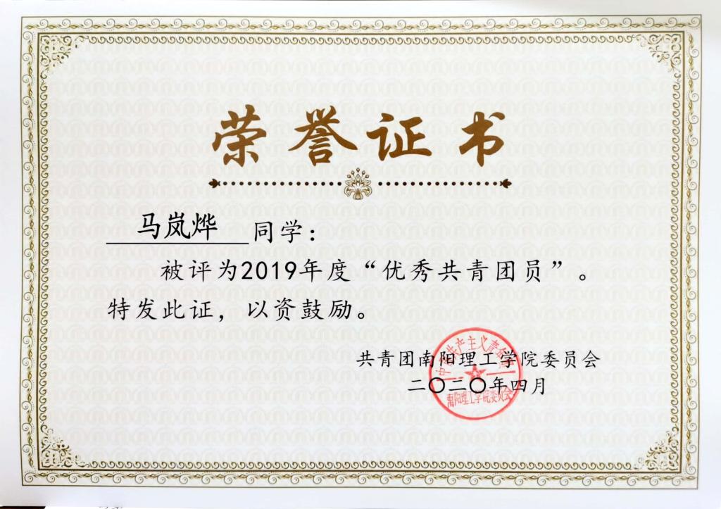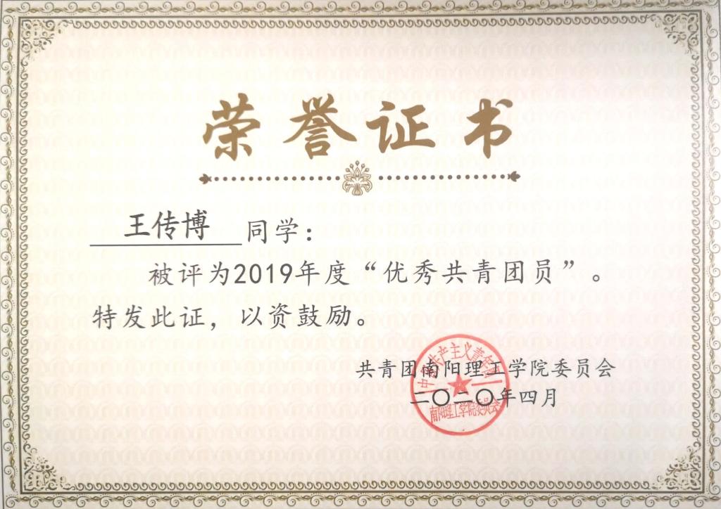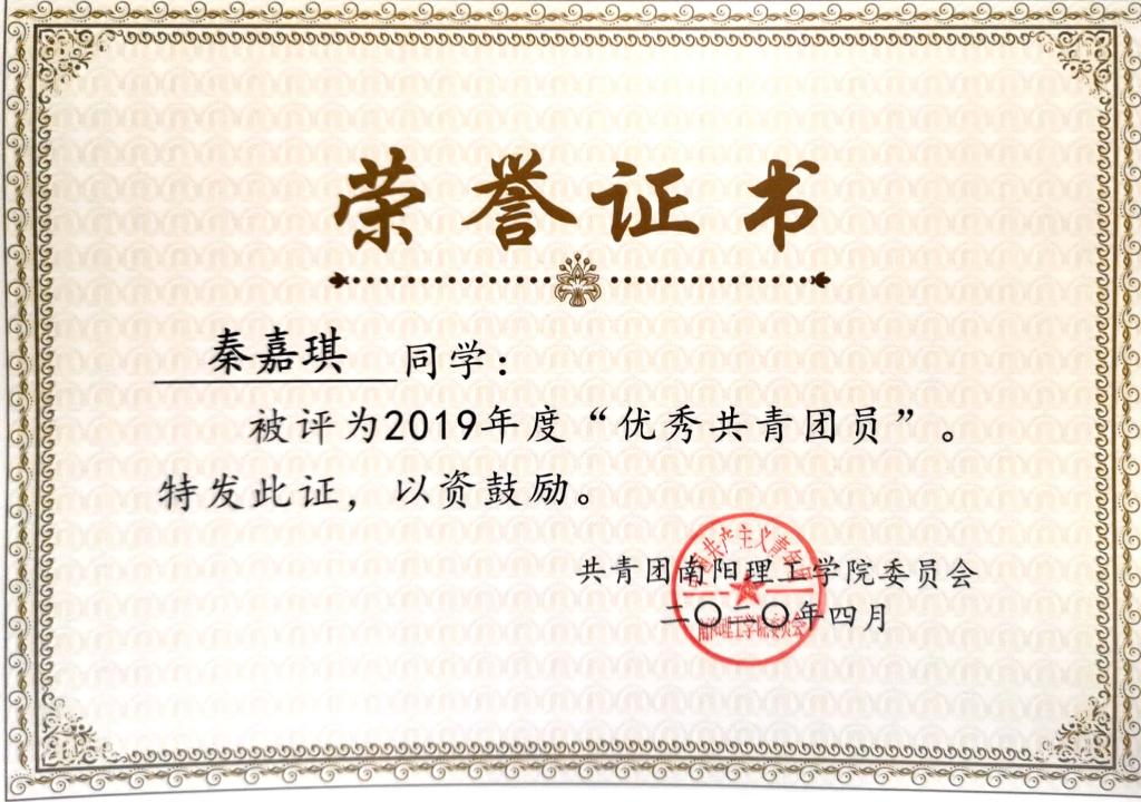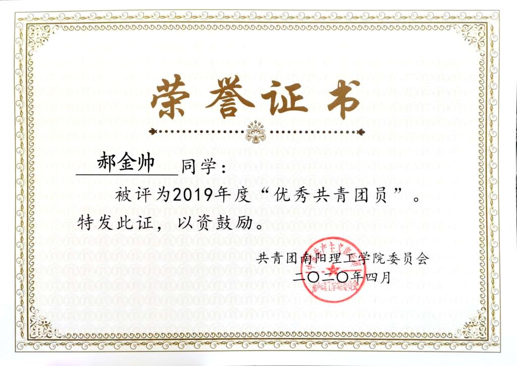 2019年度南阳理工学院“优秀共青团员”荣誉证书