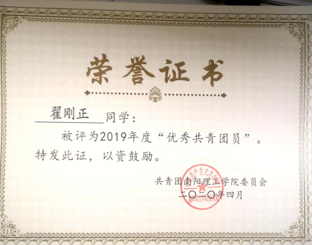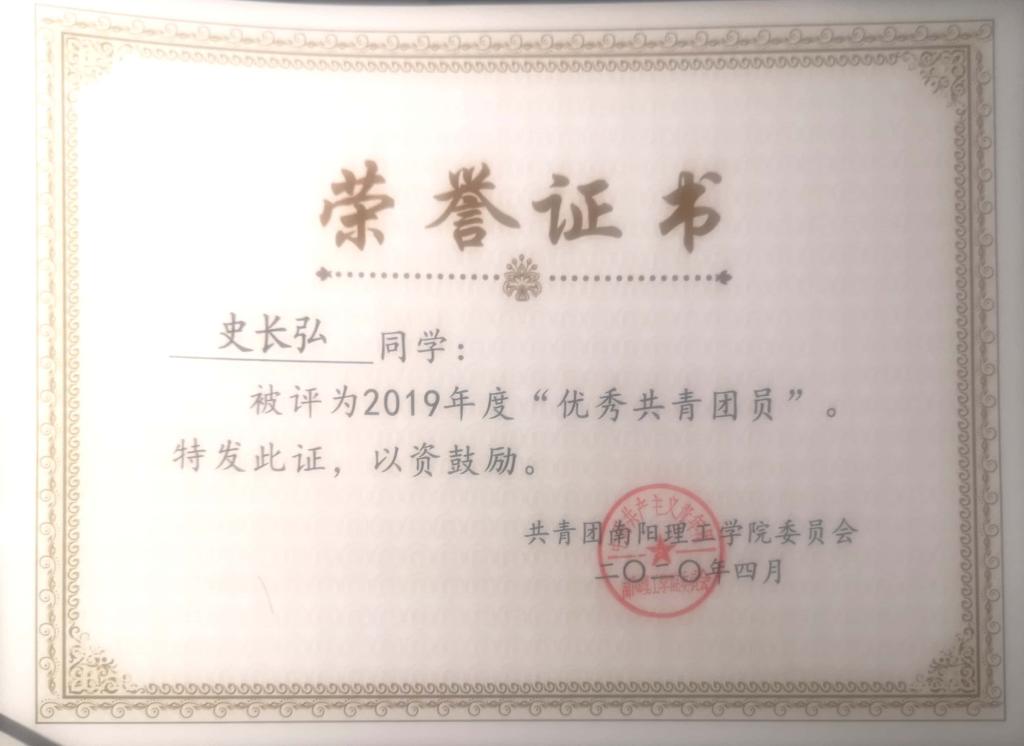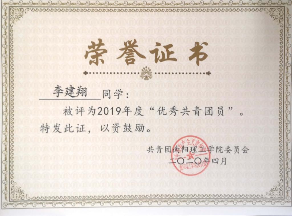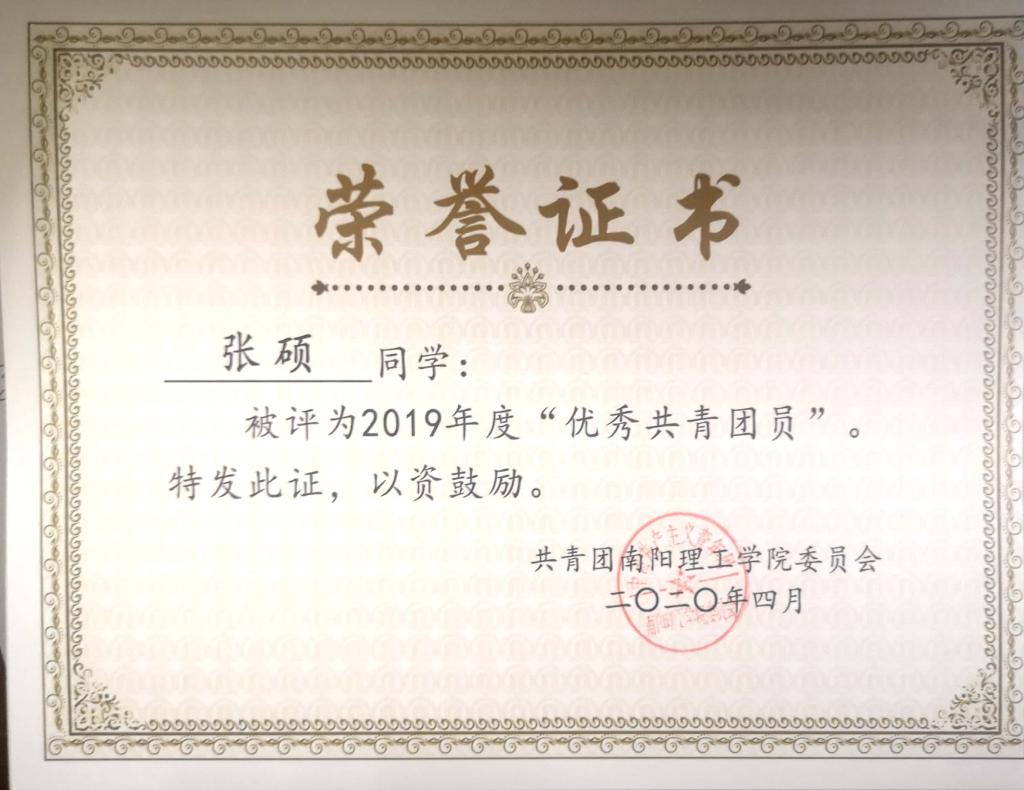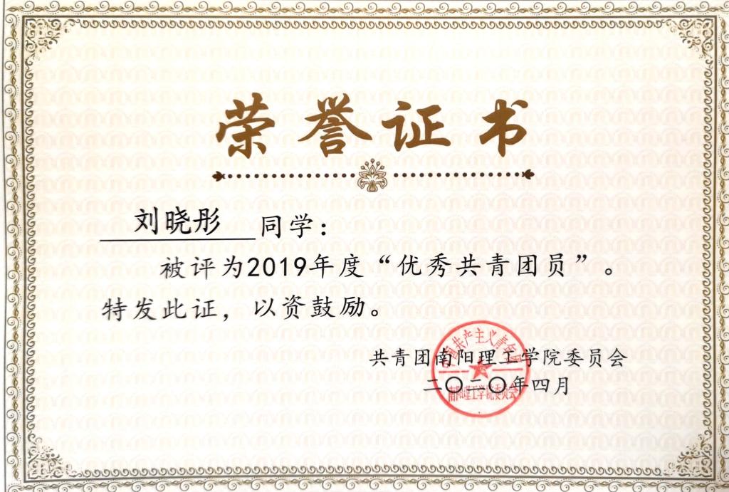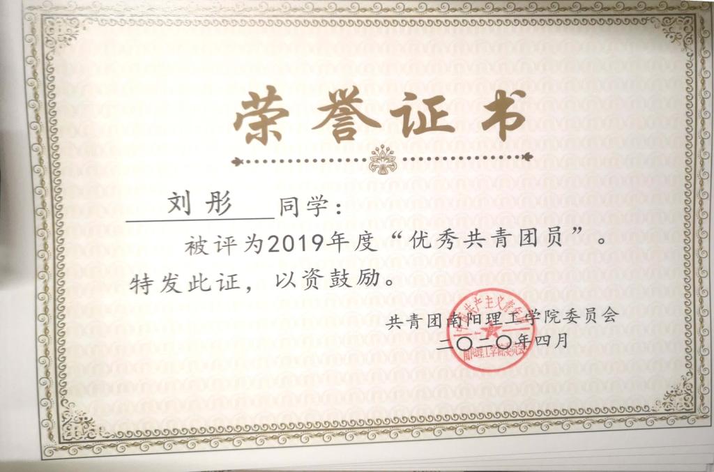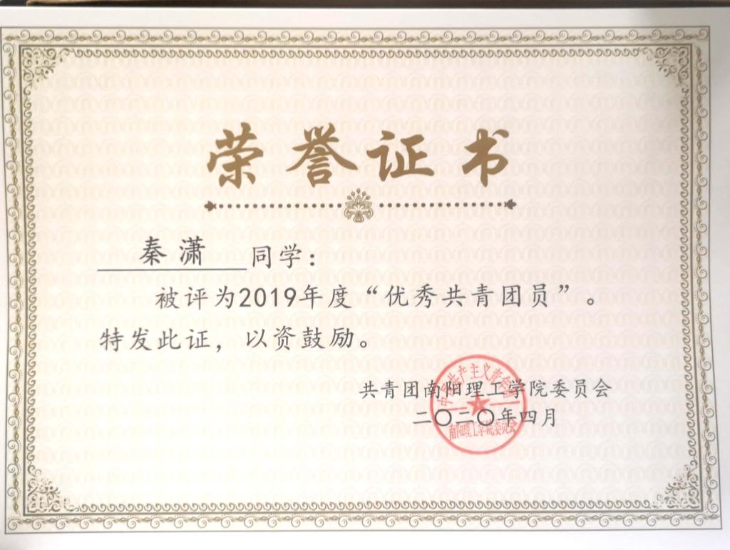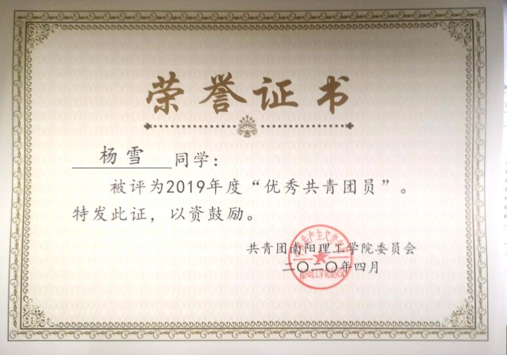 2019年度南阳理工学院“优秀共青团员”荣誉证书