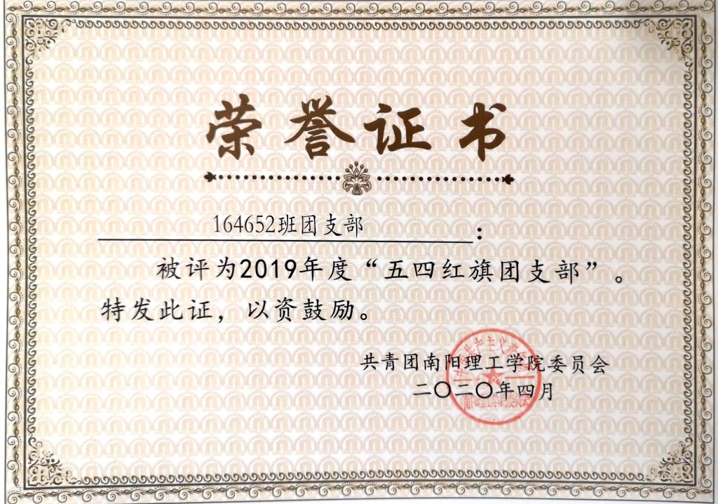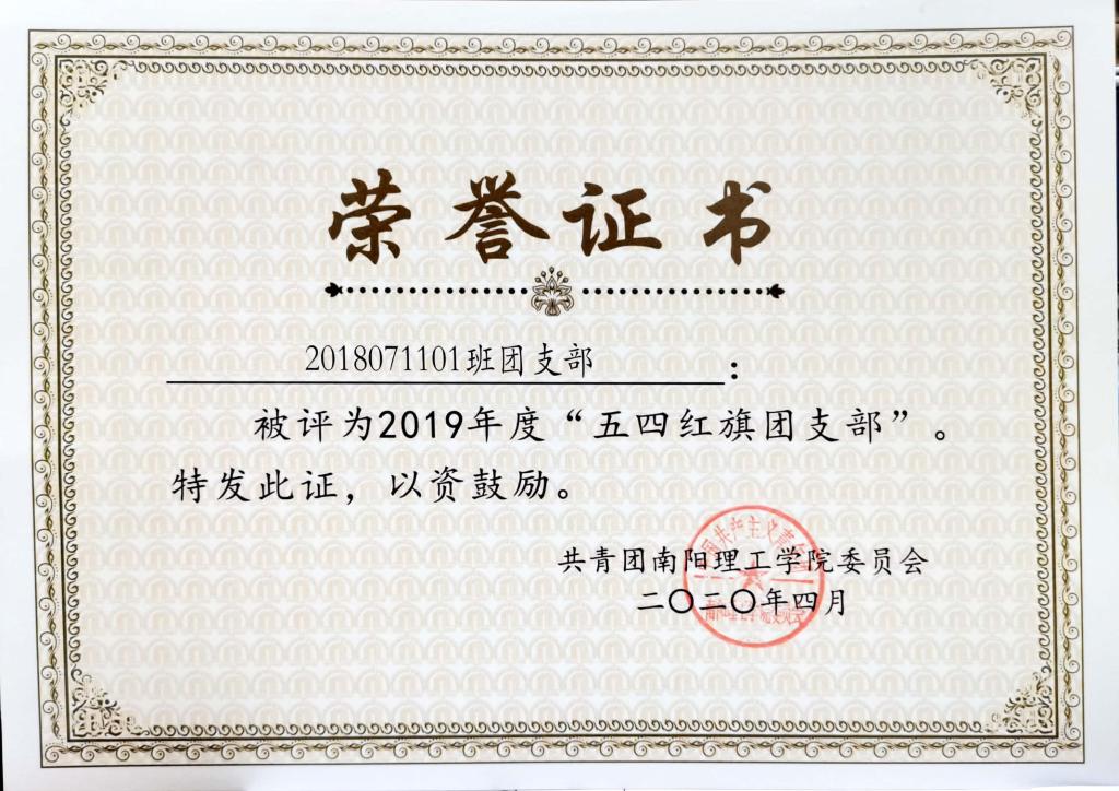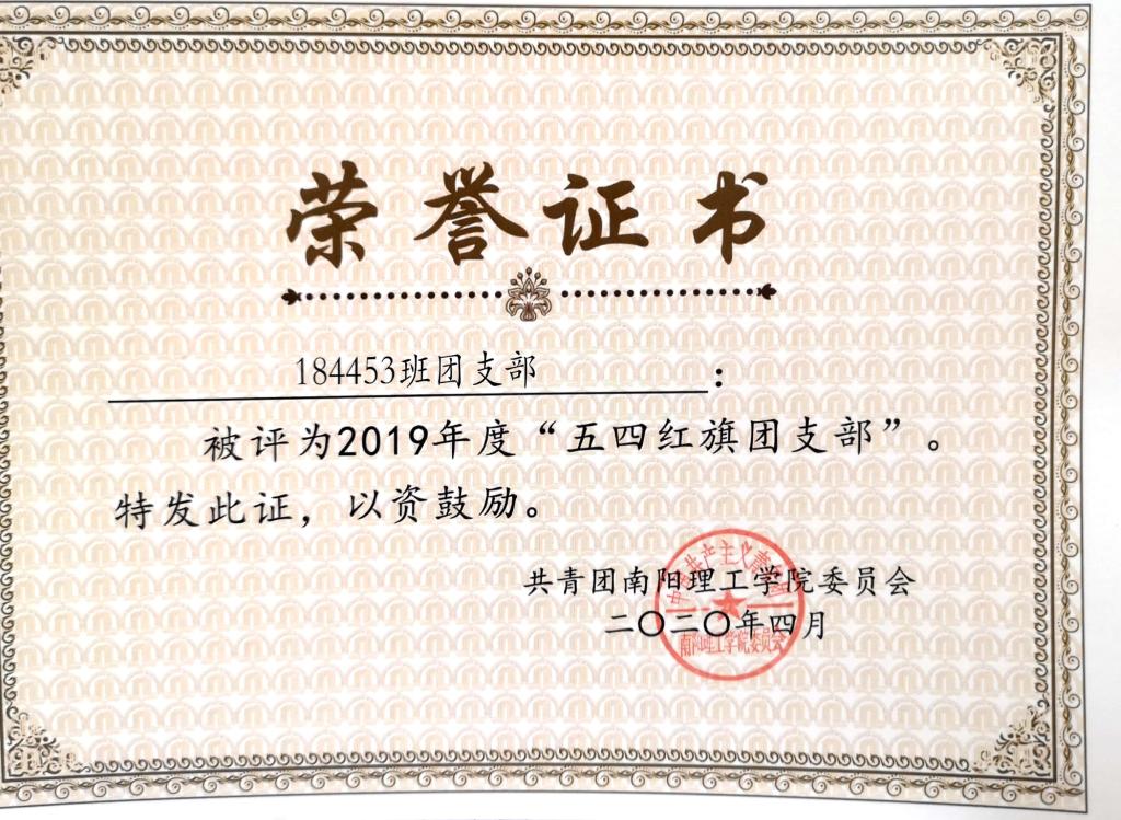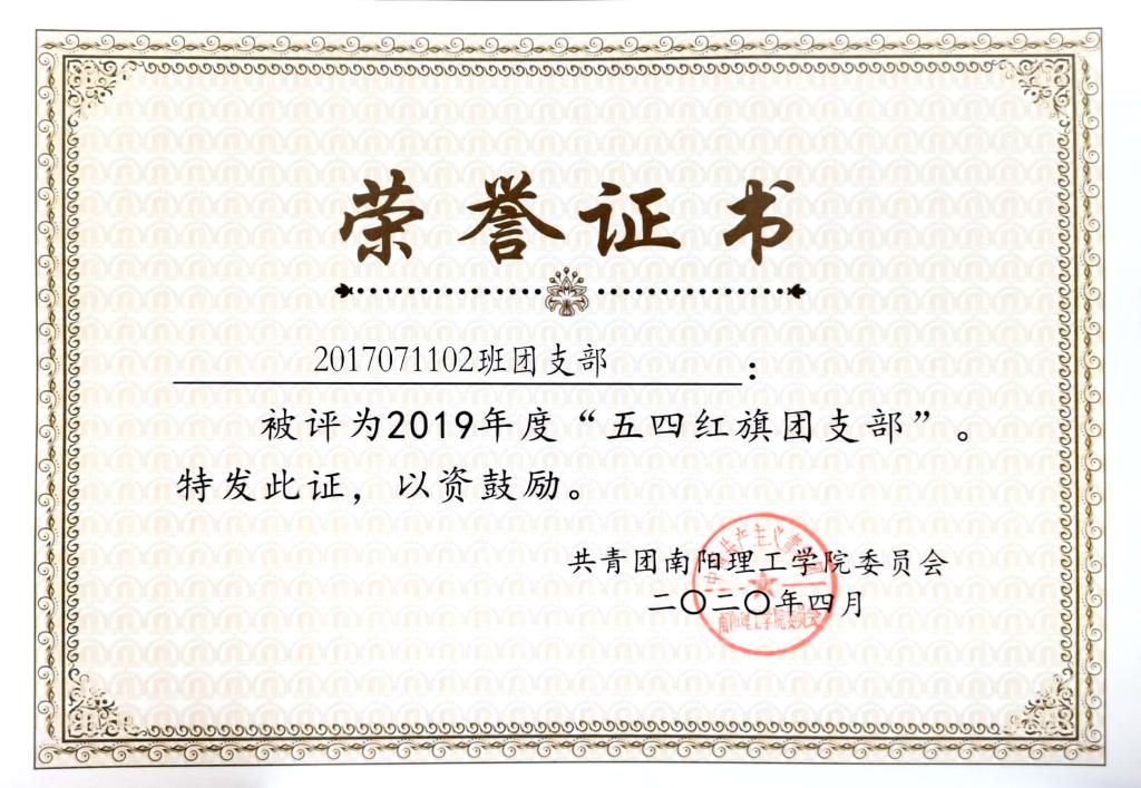 2019年度南阳理工学院“五四红旗团支部”荣誉证书