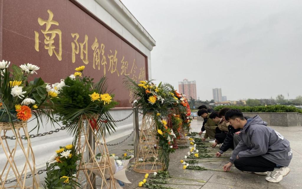 巍峨庄严的纪念碑前,同学们全体肃立齐唱国歌、默哀致敬、进行诗词朗读,并向烈士们敬献鲜花和花篮,怀着无比崇敬的心情凭吊革命先烈。随后,负责人带领全体人员参观纪念碑,重温那段“中原我军占领南阳”的红色经典记忆。