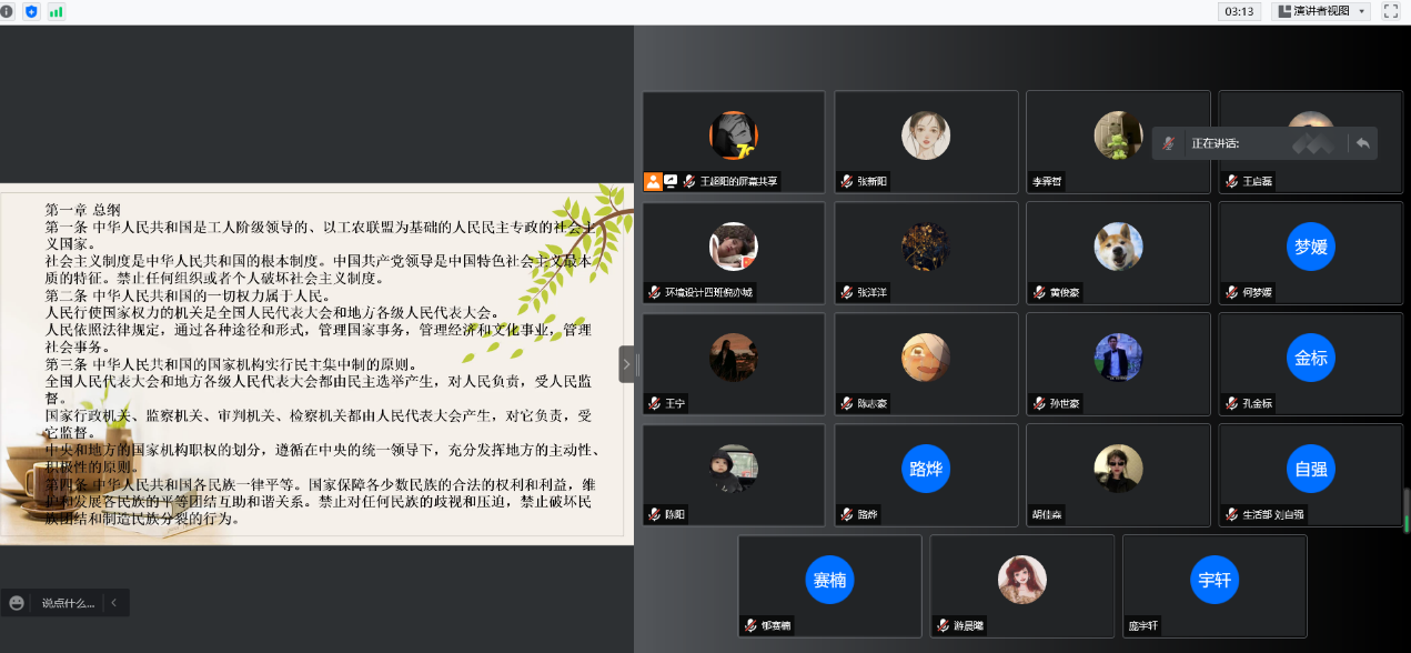 活动伊始,主持人王超阳带领大家学习宪法精神和宪法条例。随后,同学们观看了本期活动视频,进一步学习如何学宪法讲宪法。最后,主持人王超阳带领同学们积极讨论了本次交流会的重要意义,同学们纷纷表示:“了解学习自己国家的宪法,严格遵守宪法,自觉维护宪法的尊严,是每一个公民最基本的素质要求。作为一名大学生,要遵守宪法,维护宪法,做宪法的坚定捍卫者,忠实践行者。”