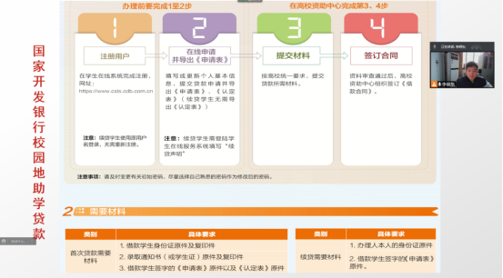 线上走访过程中,学院资助专干李明东老师首先对国家奖助学金、校园地国家助学贷款以及学校各项资助政策进行了详细讲解,并收集了同学们对学院资助工作的建议。学院老师们深入了解了受访学生及其家庭遇到的实际困难和受疫情影响情况,并就假期的学习生活、社会实践和时间规划问题和同学们进行了交流。