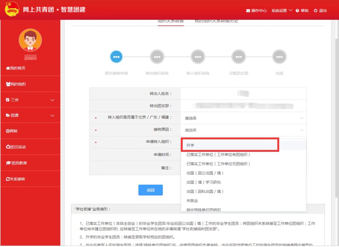 注意:所有团员在网上发起团关系,转入时需注明所录取专业。以上线上、线下两个步骤全部完成,标志团组织关系转接成功。