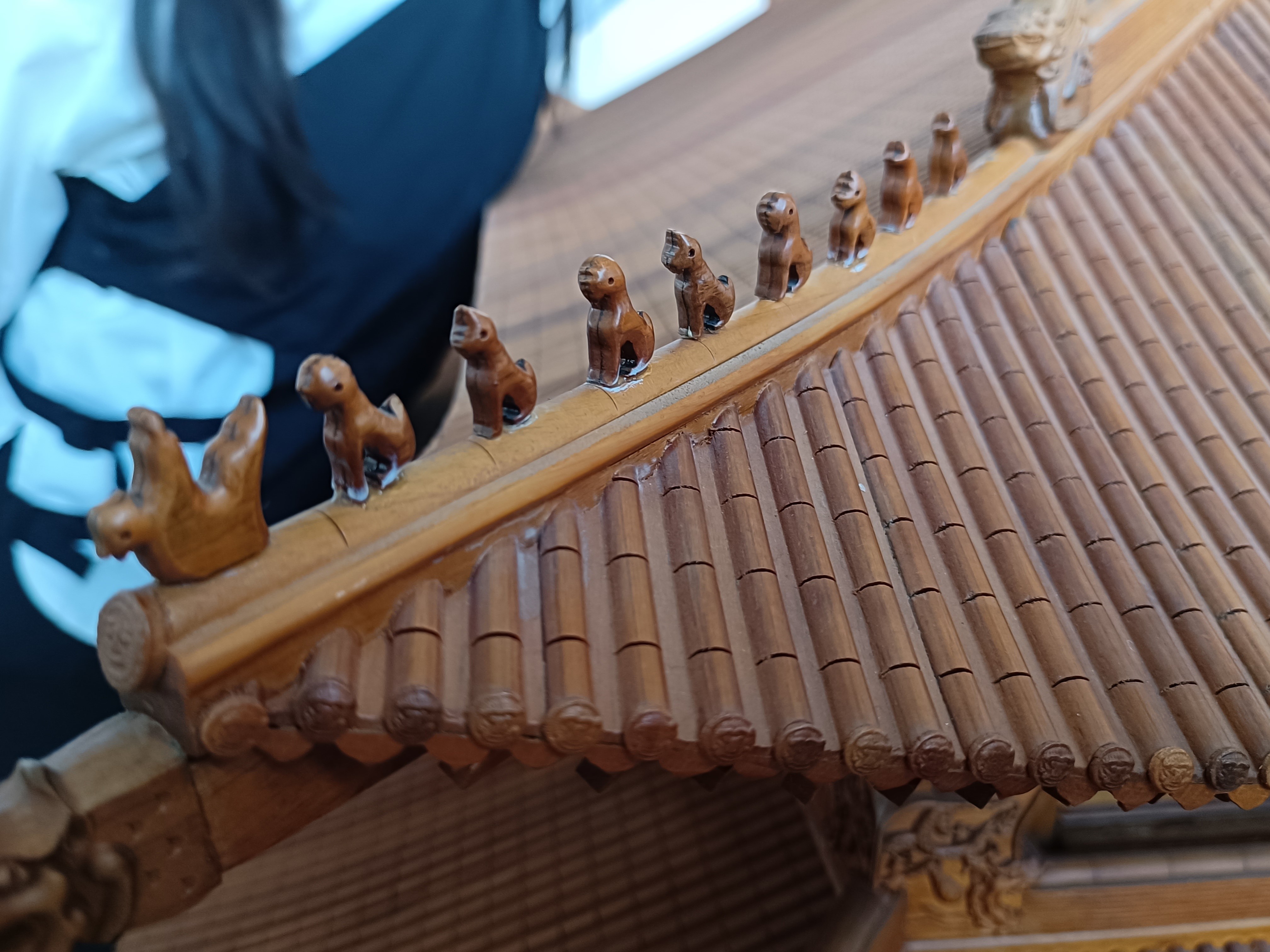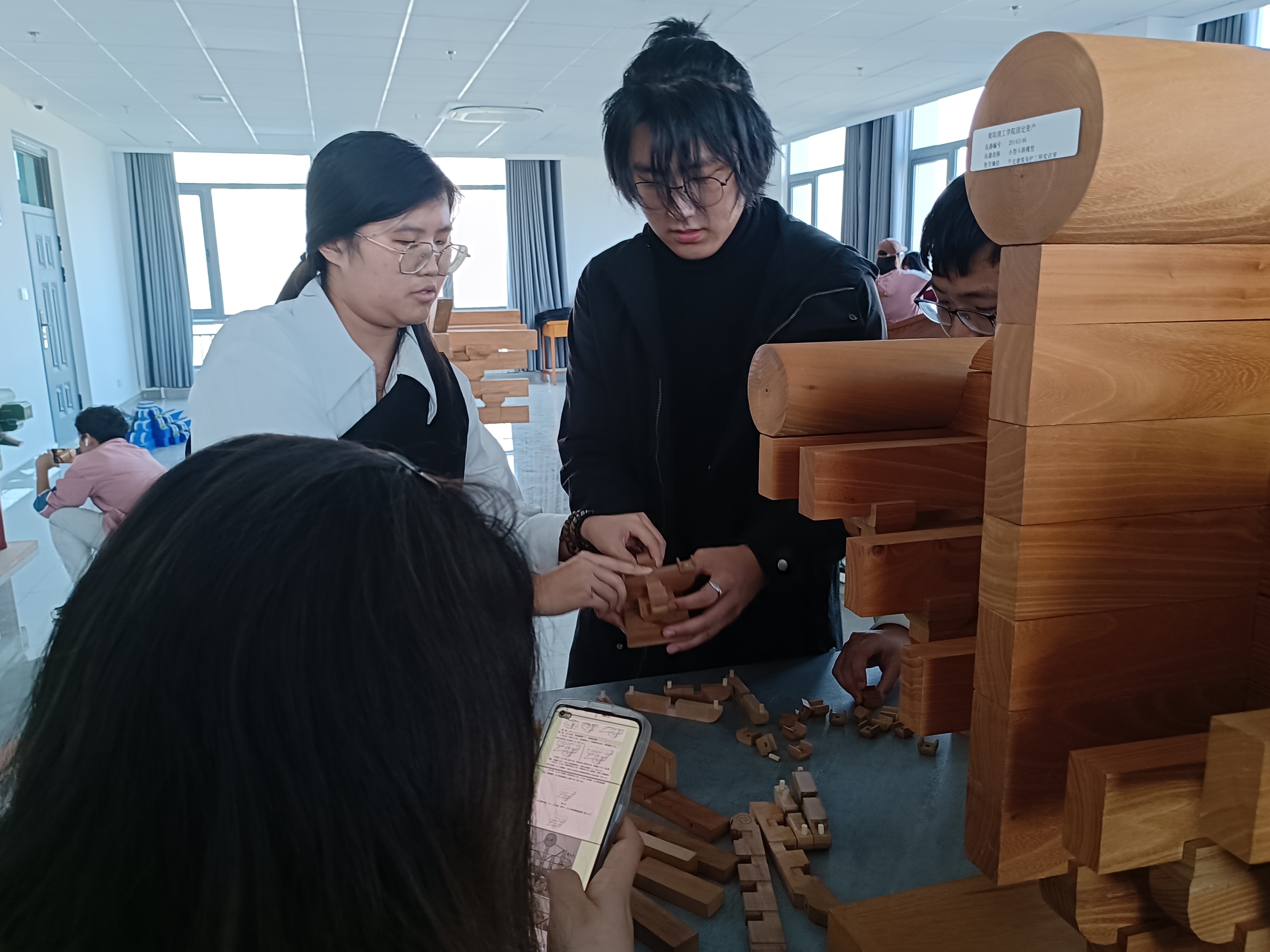 参观现场,文遗社社长刘雨青首先向同学们介绍了中国古代抬梁式建筑模型各个部分的名称,随后又带同学们认识了北京故宫太和殿的模型,并着重介绍了太和殿梁上小兽的种类以及它们所代表的意义。活动中,同学们还进行了拼斗拱模型初体验,大家或独自思考,或在学姐学长的帮助下进行,或三两成群、集思广益,最终都圆满完成了斗拱模型的组装。
