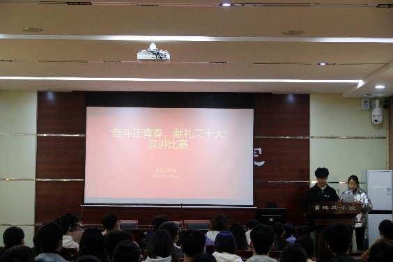 比赛现场,10名参赛选手围绕“奋斗正青春,献礼二十大”的主题,精心准备了宣讲内容。大家激情澎湃的精彩演说展现了新时代青年与党同行、勇担使命的家国情怀,赢得了评委和观众的阵阵掌声。其中,蔡明宇同学以“奋进青春向未来,献礼党的二十大”为主题,带大家重温了抗战巾帼英雄刘胡兰的故事,并表示:“正如中共二十大报告强调的,广大青年要踔厉奋发,努力前行,为全面推进中华民族伟大复兴持续团结奋斗!” 他声情并茂的宣讲感染了在场的每一名观众。