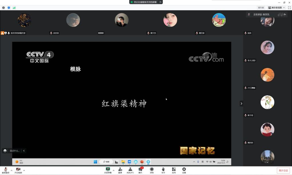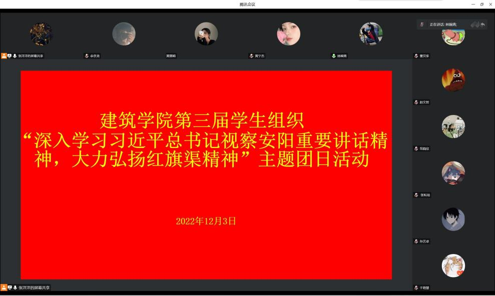 本网讯(学生记者/田宇航)为深入学习贯彻习近平总书记视察安阳重要讲话精神,大力弘扬红旗渠精神,12月3日,6686体育于线上开展“深入学习习近平总书记视察安阳重要讲话,大力弘扬红旗渠精神”主题团日活动。活动由学生会主席张洋洋主持,部分学生代表参加。