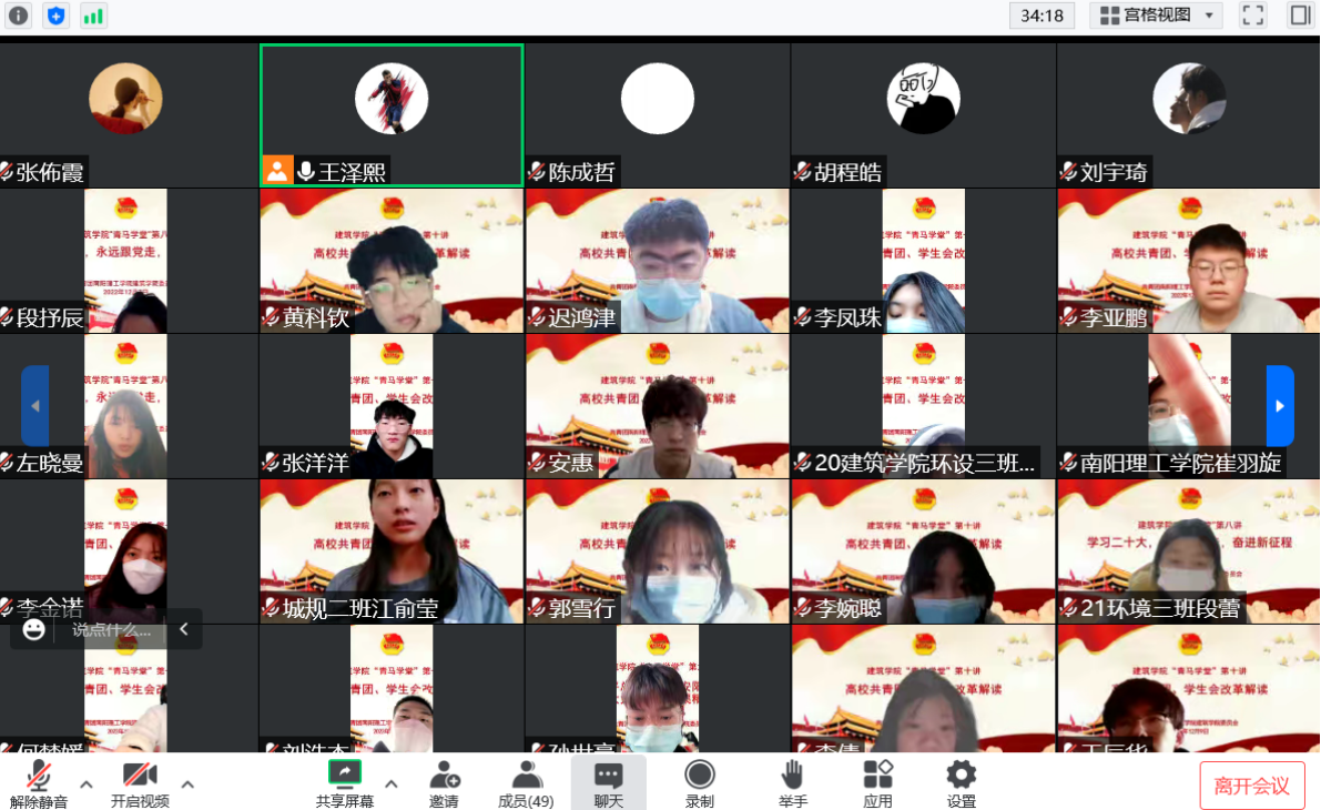 课堂上,青马学员们在主持人的讲解下对高校共青团、学生会改革有了更加深刻的了解,认识到在“两个一百年”交汇的历史性时刻青年学生的重要性。通过学习,大家表示,要紧跟时代步伐,以点带面,积极调动身边的同学投身到校园活动中去,成为德智体美劳全面发展的社会主义建设者和接班人,奋力开启新篇章。