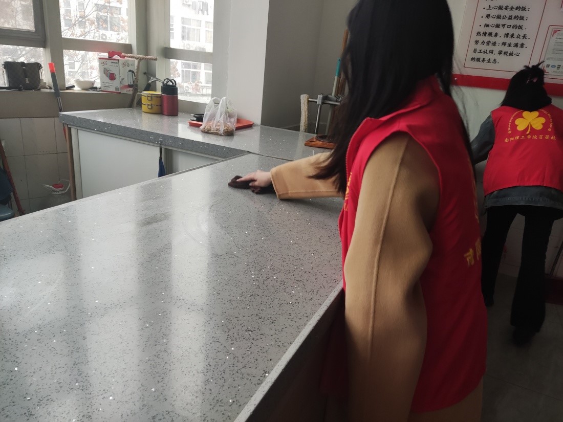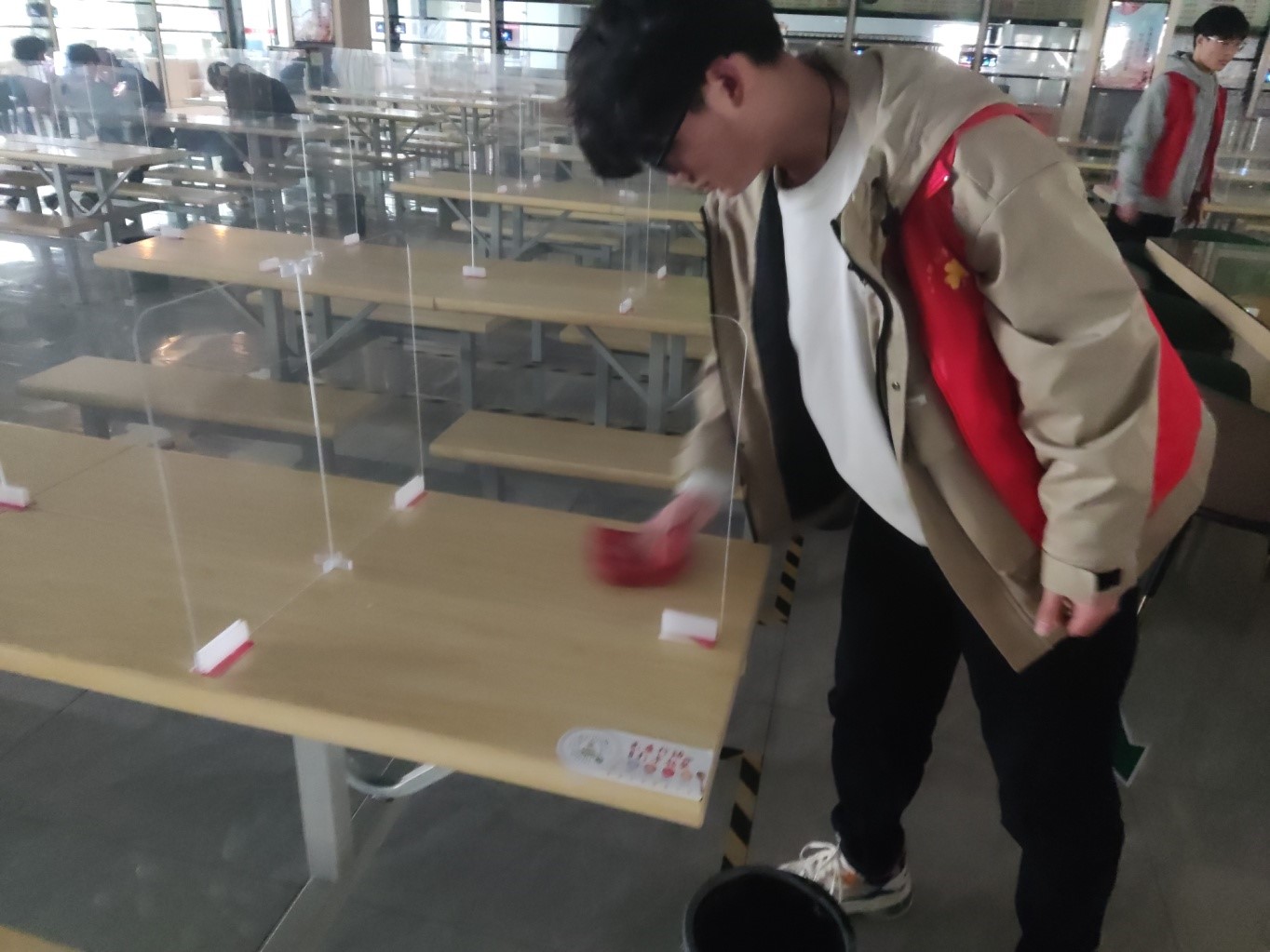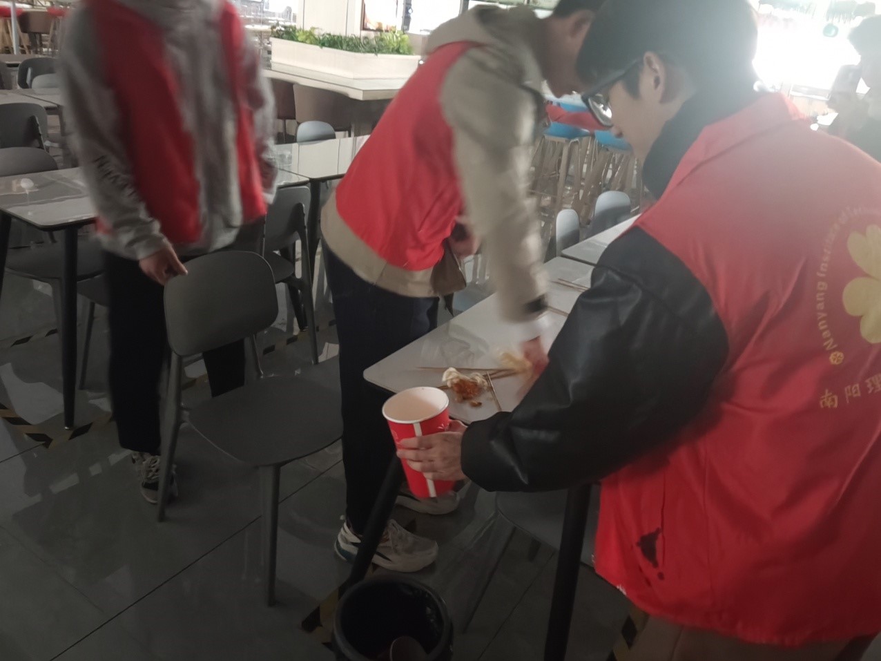 食堂里,志愿者们身穿红马甲,和阿姨们一起打扫着餐厅卫生,大家忙前忙后地帮忙擦桌子、扫地,并倡导前来就餐的同学践行光盘行动,号召同学们学习用餐礼仪、科学合理饮食、发扬文明餐桌文化,摒弃不良恶习,拒绝资源浪费。