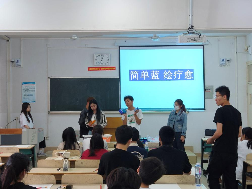 在活动的第一阶段,同学们在了解了“简单蓝”绘画技术的操作方法之后,运用水彩纸和蓝白水粉开始了自由创作。通过在充满治愈力量的蓝色画纸上随心画出心中所想,同学们看到了自身的积极力量,并用心感受到了绘画疗法的心理疗愈作用。