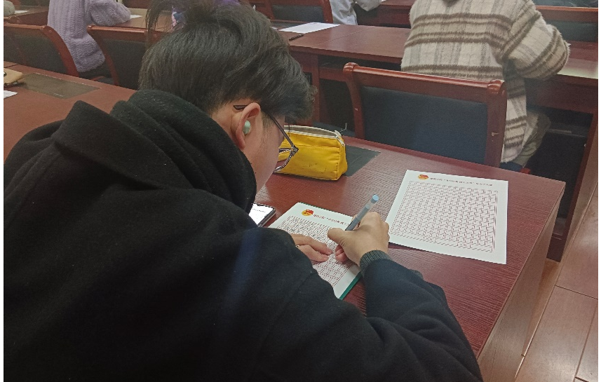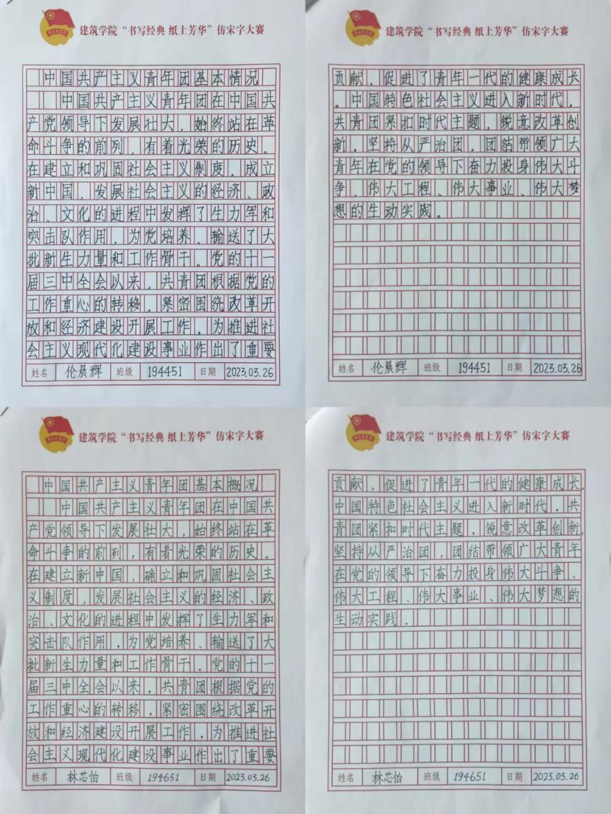 本次比赛的规定书写内容是《中国共产主义青年团章程》的相关章节。比赛现场,参赛选手个个凝神聚气,心无旁骛,争分夺秒又有条不紊,经过充分的赛前准备,每位同学都充分展现了自身的仿宋字书写技能和闪亮风采。最终伦晨辉、林心怡两位同学夺得本次比赛的第一名。