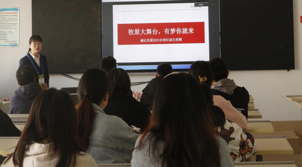 招聘会上,牧原盛达发展有限公司主讲人王品向在场的同学放映了公司宣传片,并为大家介绍了公司的基本情况。同学们了解到,该集团自建立以来,一直秉持着“给家人一个安心、高质量的家”的发展理念,致力于将集团精心打造为一流的企业。随后,主讲人就公司的规章制度、福利待遇、企业文化、组织架构、人力资源政策等方面为同学们做了讲解,并现场解答了同学们的疑问。
