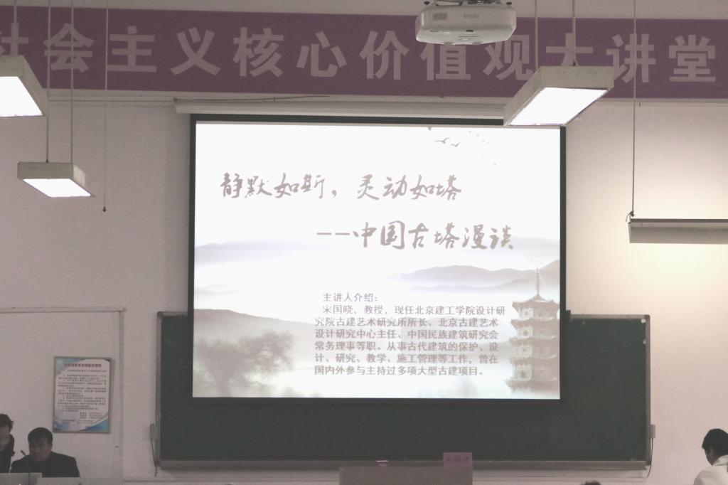 讲座伊始,宋国晓教授就强调,塔是古建筑中非常重要的一类,在全国各地分布广泛。随后分别从古塔的源流、世界各地的古塔、古塔的功用及造型艺术、古塔与壁画等几个方面介绍了中国古塔的相关知识。最后,宋老师以襄城首山文峰塔重建工程为例,详细介绍了文笔峰塔从建造地宫、塔基、塔身、塔刹的全过程及后期的壁画装饰。在宋教授的讲授中,同学们被参与古塔建筑修建者们的大国工匠精神深深地打动,现场响起了阵阵掌声。