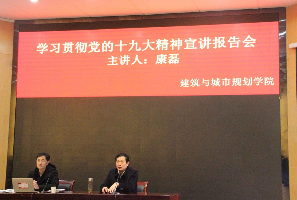 3月20日下午,建筑与城市规划学院在领创空间二楼学术报告厅举办主题为“新时代、新思想、新征程、新青年、新目标”的十九大精神宣讲报告会,邀请学校十九大精神宣讲团成员、校团委书记康磊担任主讲。学院领导班子、全体教职工、学生党员、学生干部和17级全体学生共同参与学习,会议由党委书记陈博主持。