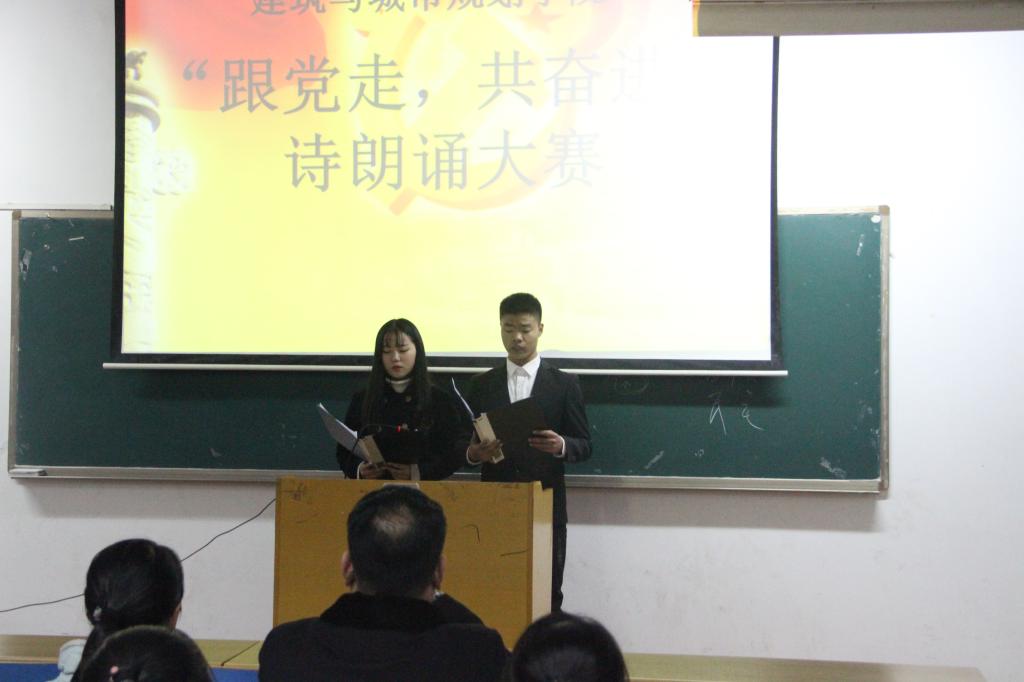 永远跟党走,献礼十九大。12月19日,建筑与城市规划学院在14#105举行“跟党在,共奋进”诗歌朗诵大赛,出席本次活动的有党委书记陈博、团学办主任杜鹤和17级全体学生。