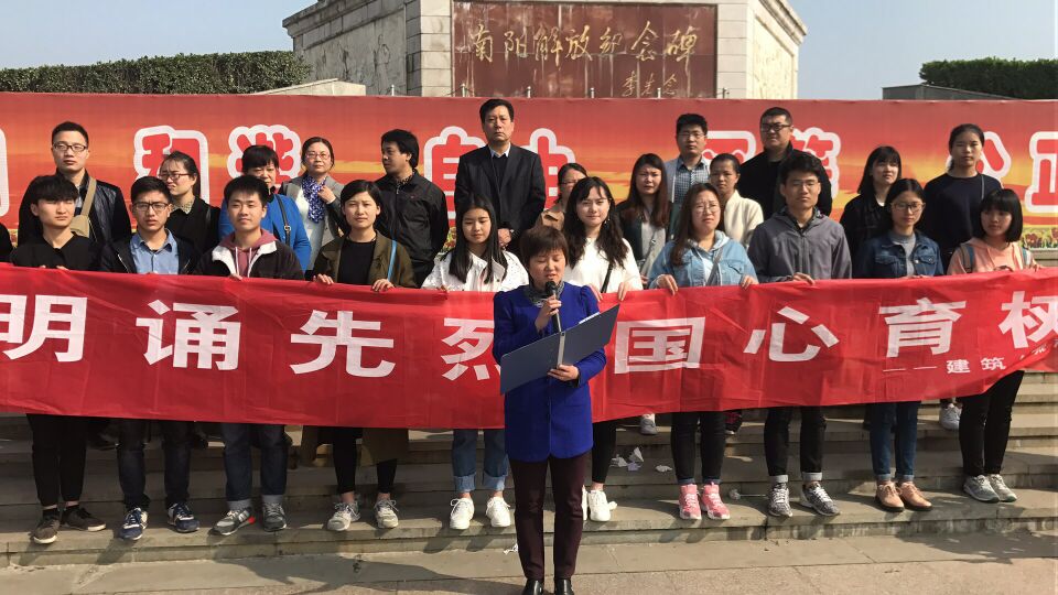 这矗立在我们面前的英雄纪念碑,诉说着为了南阳解放的革命先烈们光荣的事迹,在陈书记平实的讲述中,师生们更深刻地感受到无数英雄儿女在那段峥嵘岁月中的付出和牺牲,从而由衷的对为保卫家乡而献出青春热血的革命英烈表示深深的钦佩。随后师生代表们分别诵读缅怀先烈诗词《我骄傲,我是中国人》、《清明颂先烈》、《我的自白书》等,让师生感受革命先烈们为了人民的解放事业,为了国家的前途,赴蹈汤火,前仆后继,抛头颅、洒热血,献出宝贵生命的爱国精神。最后,师生们通过默哀、敬献白花等多种形式向革命先烈致敬,在默哀过程中,师生们保持安静,神色肃穆,表达着对烈士的缅怀。