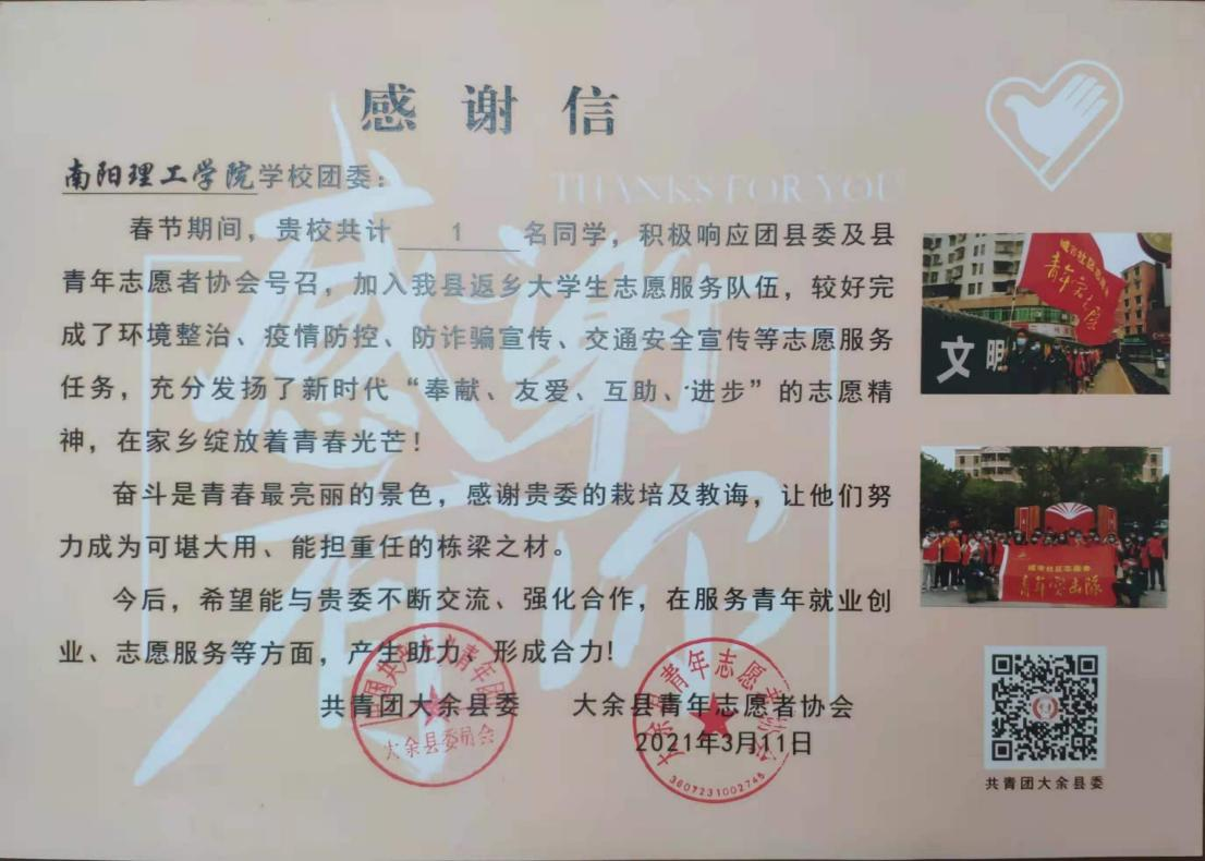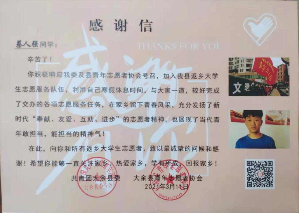 2021年3月,一封感谢信寄到了校团委,落款为共青团大余县委员会和大余县青年志愿者协会。信中对6686体育蔡人强同学寒假期间的志愿服务工作进行了表彰,并对我校团委的栽培表达了敬意和感谢。