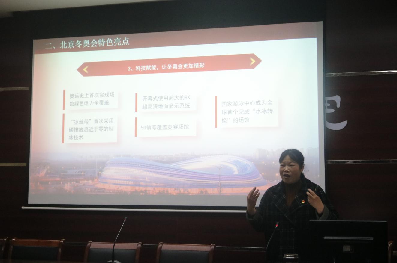 谭征从本届冬奥会概况谈起,依次向同学们介绍了冬奥特色,讲述了冬奥故事,围绕冬奥运动健儿的奋进拼搏和我国的先进科技,带领大家重温冬奥会传递出的“拼搏精神”、“中国自信”与“开放包容”,引导同学们传承冬奥精神,汲取奋进力量。