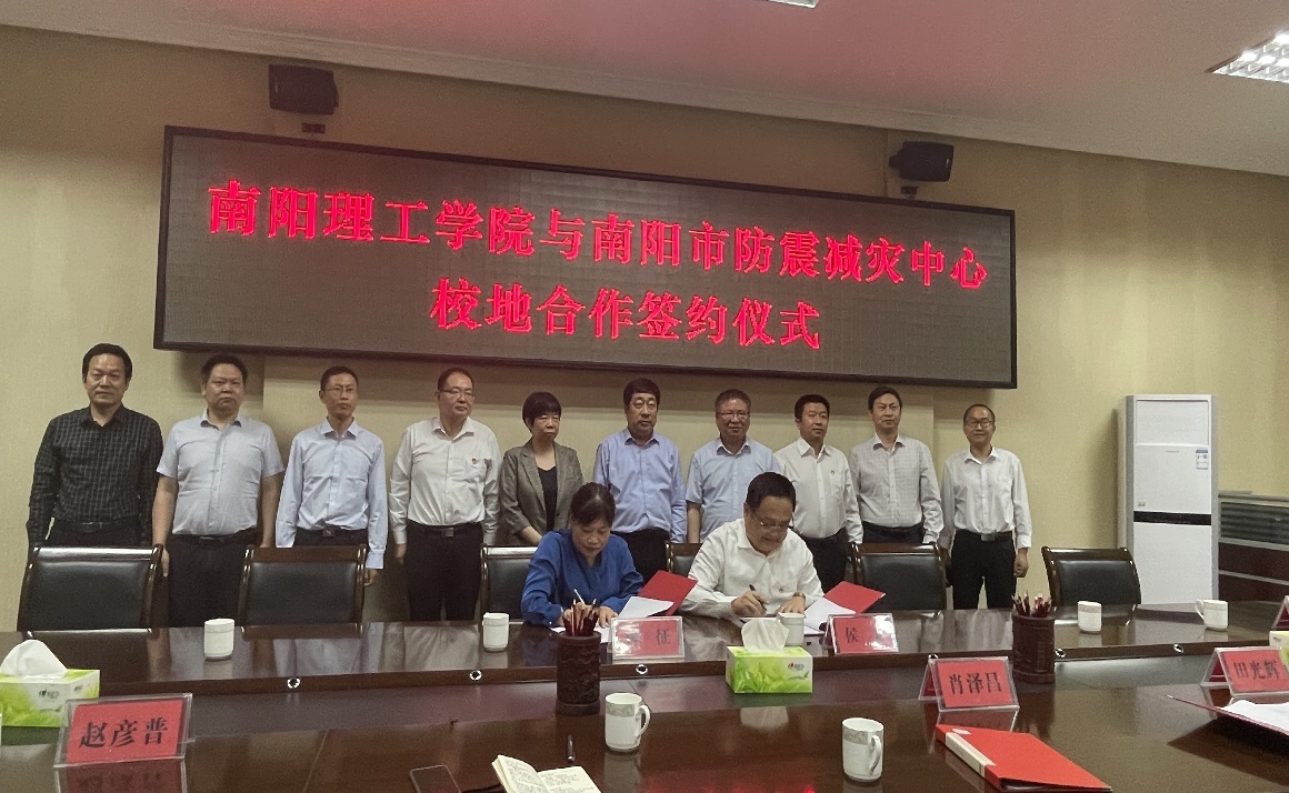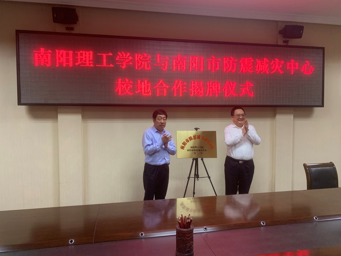 签约仪式上,肖泽昌和侯卫共同为“南阳市防震减灾研究中心”揭牌,谭征与侯卫分别代表双方签订校地合作协议。