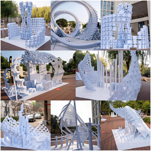 本次大赛的主题为“奋进”。参赛选手需要通过指定材料、规定的有限空间和时间,运用建筑学语言表达出“奋进二十大,启航新征程”的设计意境,并使用中空板搭建出1:1:1 的实体模型。各参赛队伍围绕大赛主题,在深入学习领悟党的二十大精神的基础上,创新设计理念,精心创作出“合筑”、“共弦”、“鸿”、“拾级而上”等模型作品,寄托“齐心共筑美好中国”、“众人拾柴火焰高,中国人民万众一心,中华民族向阳生长”的美好寓意,致敬风雨砥砺中新时代的中国走过的奋进篇章,献礼党的二十大。