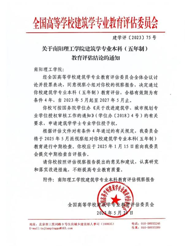 本网讯(特约记者/田真)日前,我校接到全国高等学校建筑学专业教育评估委员会《关于南阳理工学院建筑学专业本科(五年制)教育评估结论的通知》(建学评﹝2023﹞75号),我校建筑学专业顺利通过本科教育评估,合格有效期为有条件4年,自2023年5月起至2027年5月止。