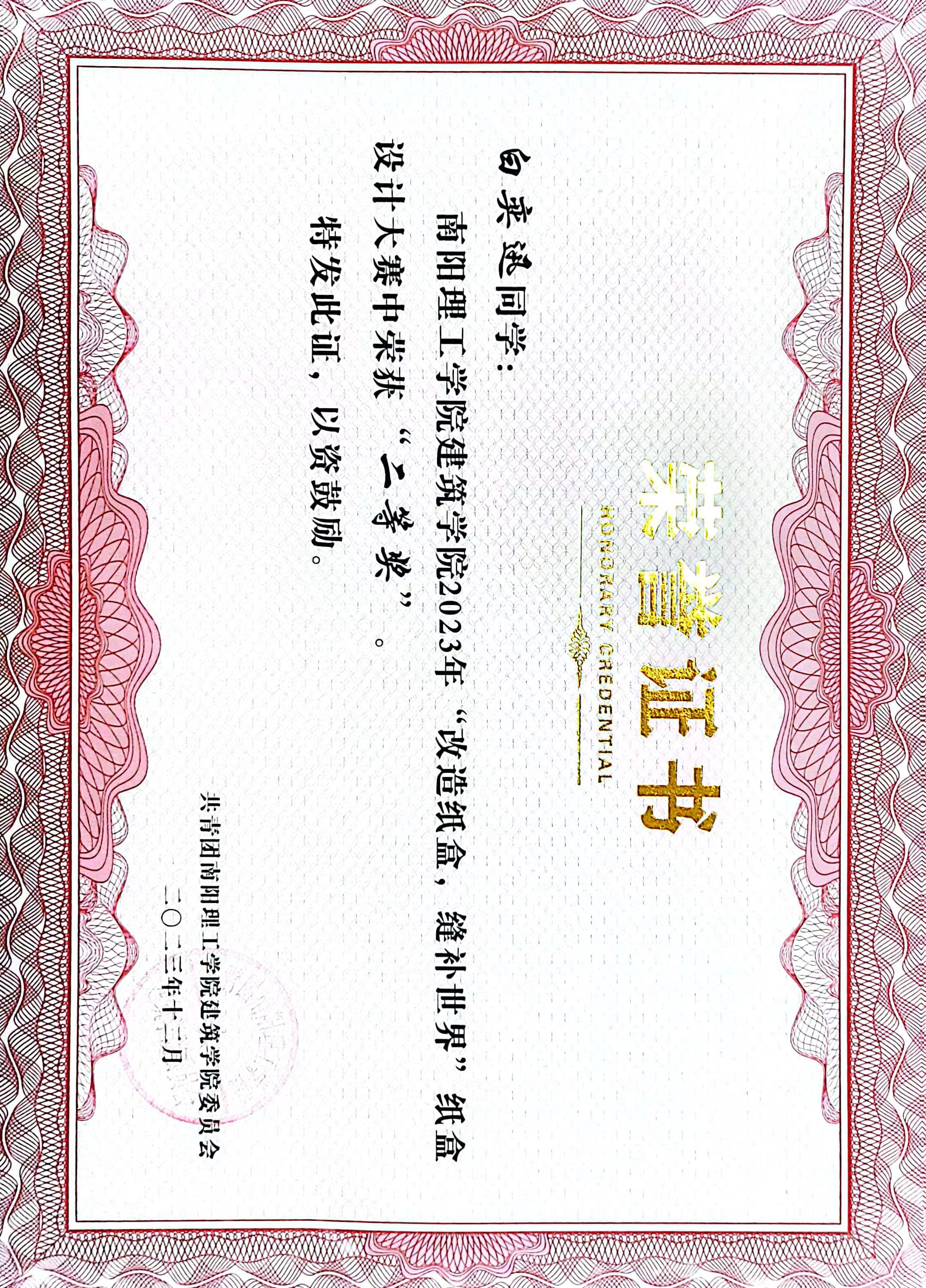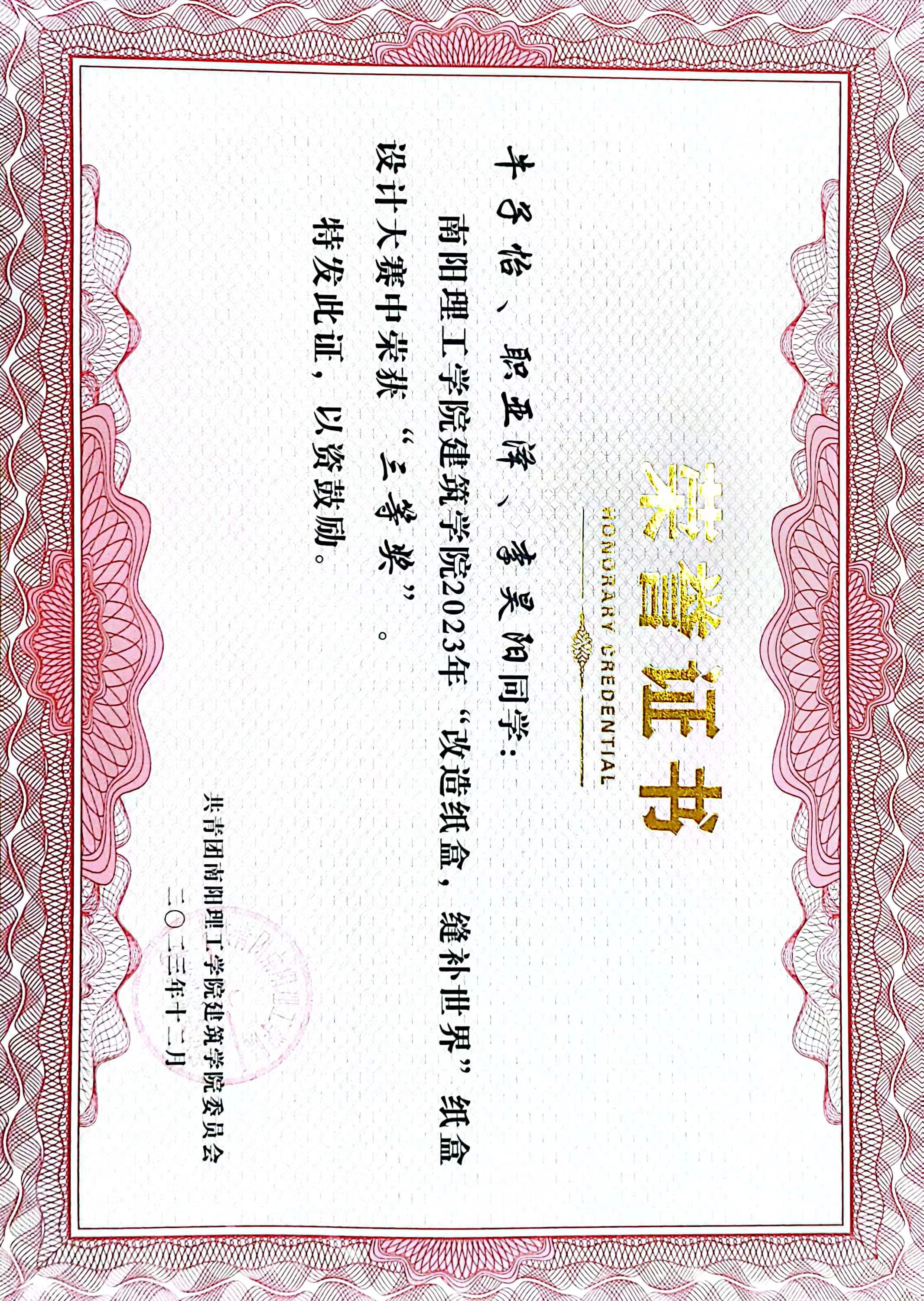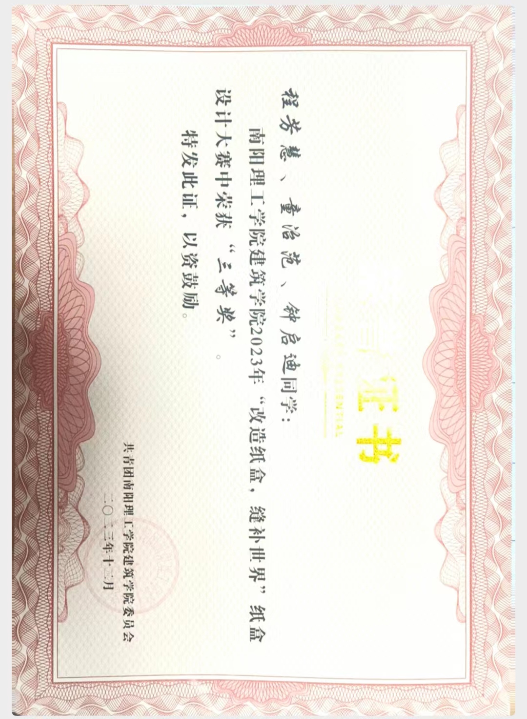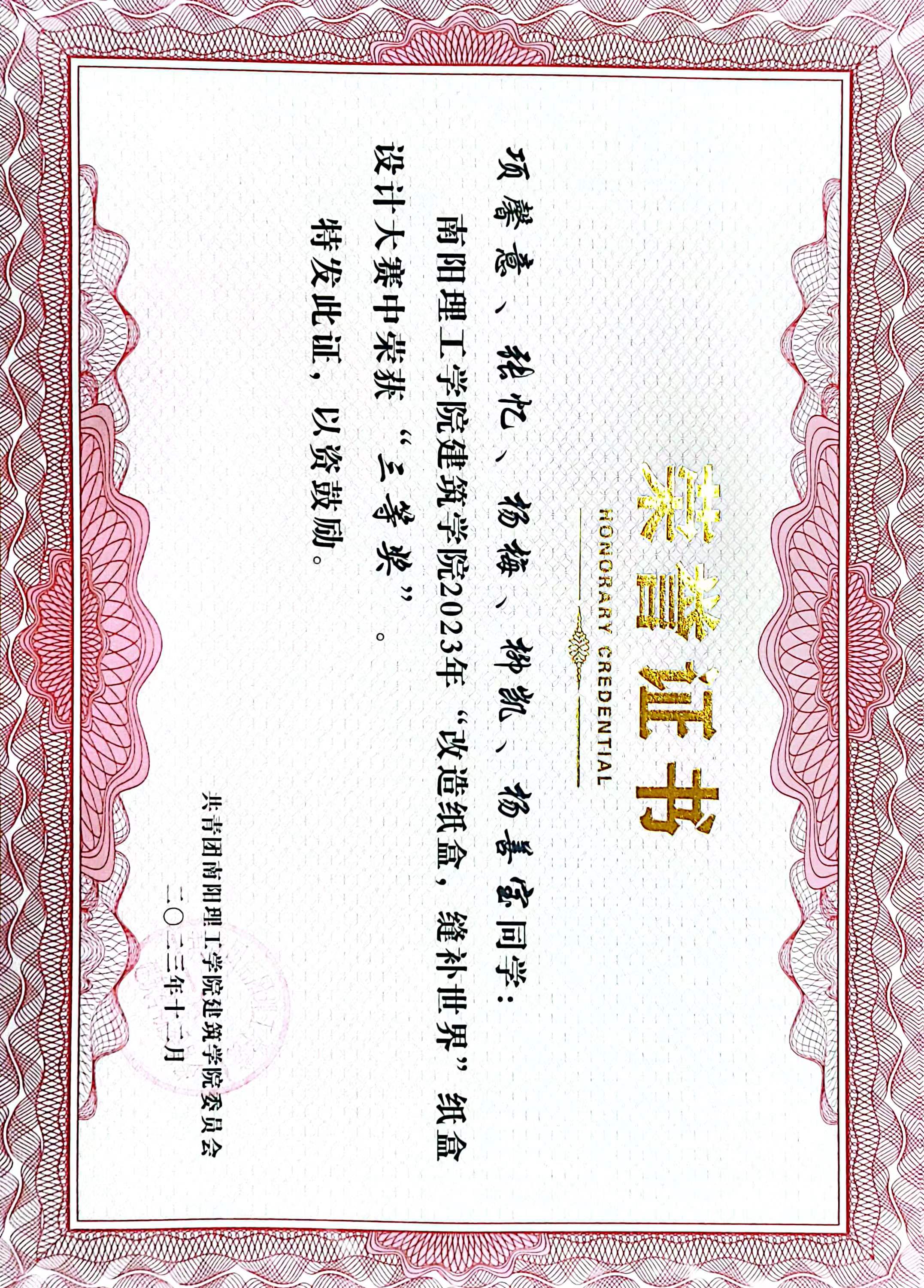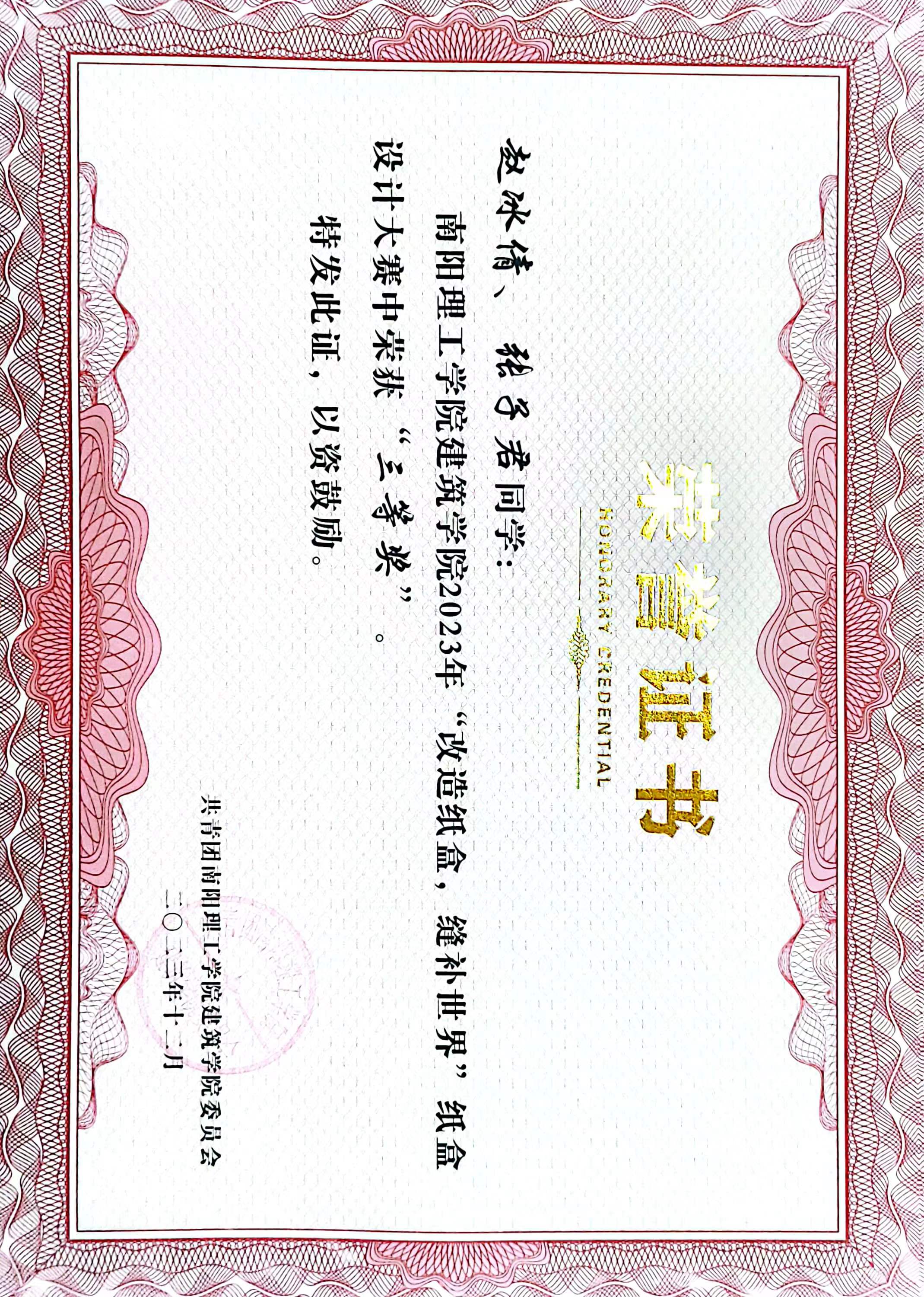 6686体育“改造纸盒,缝补世界”纸盒设计大赛获奖证书