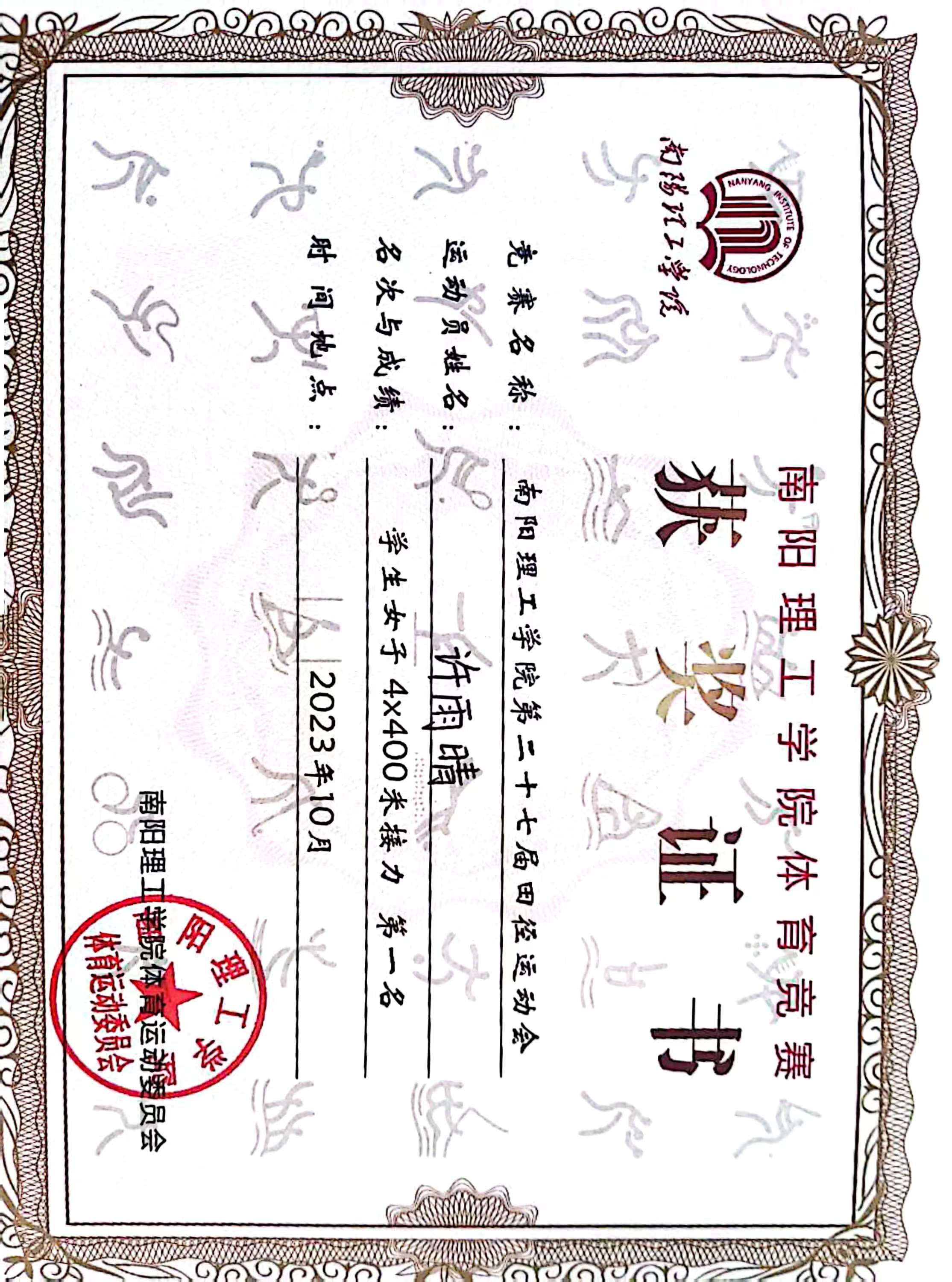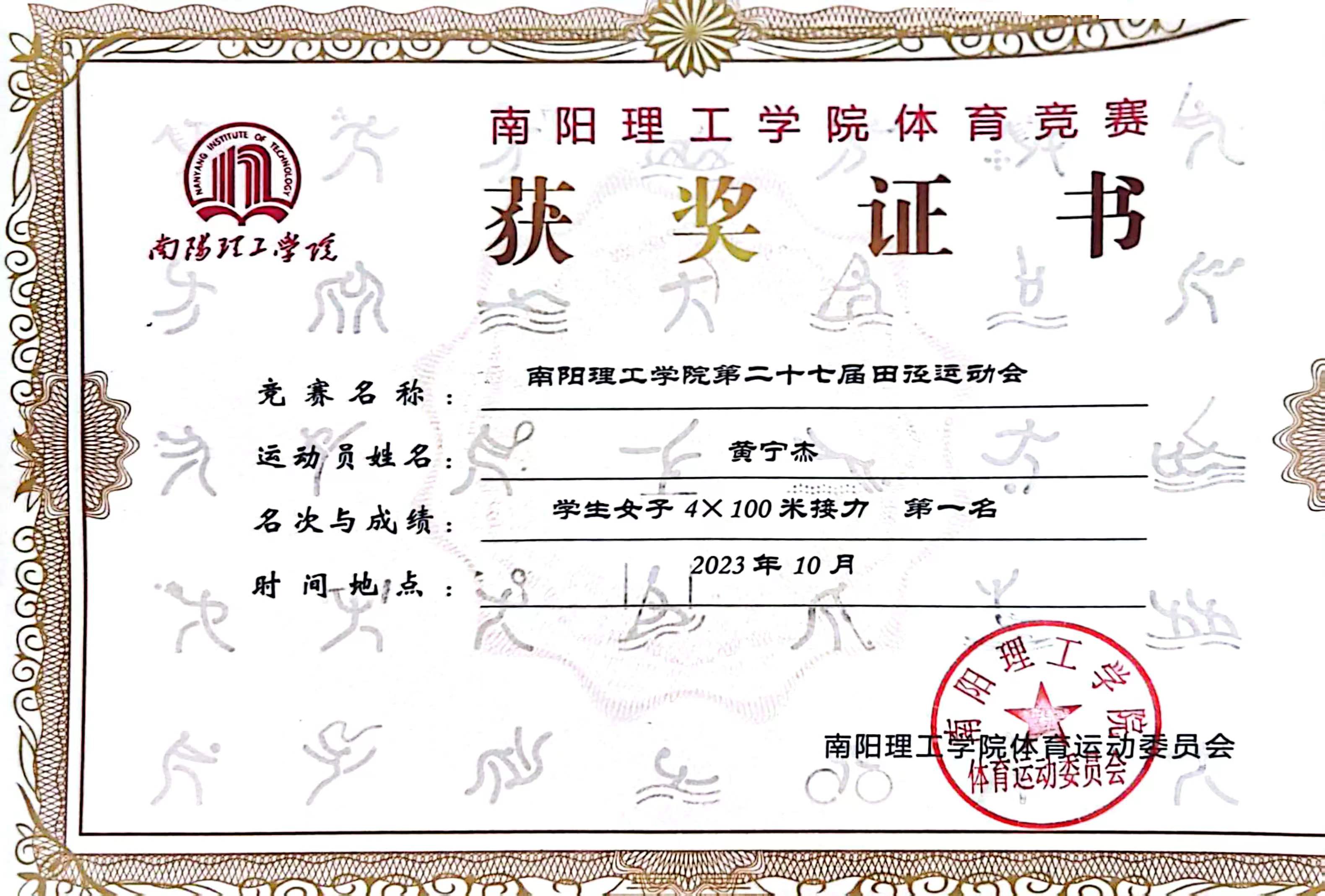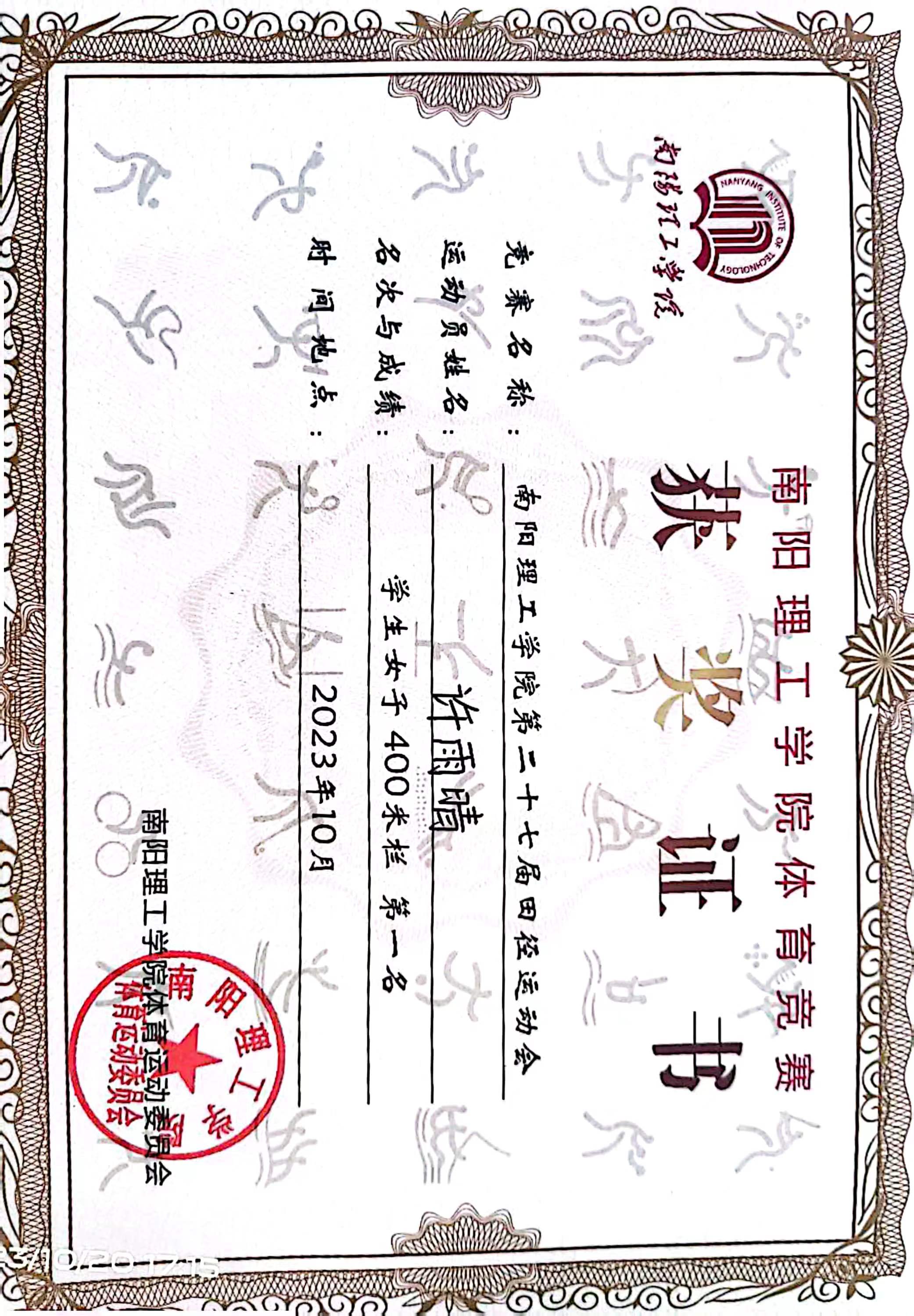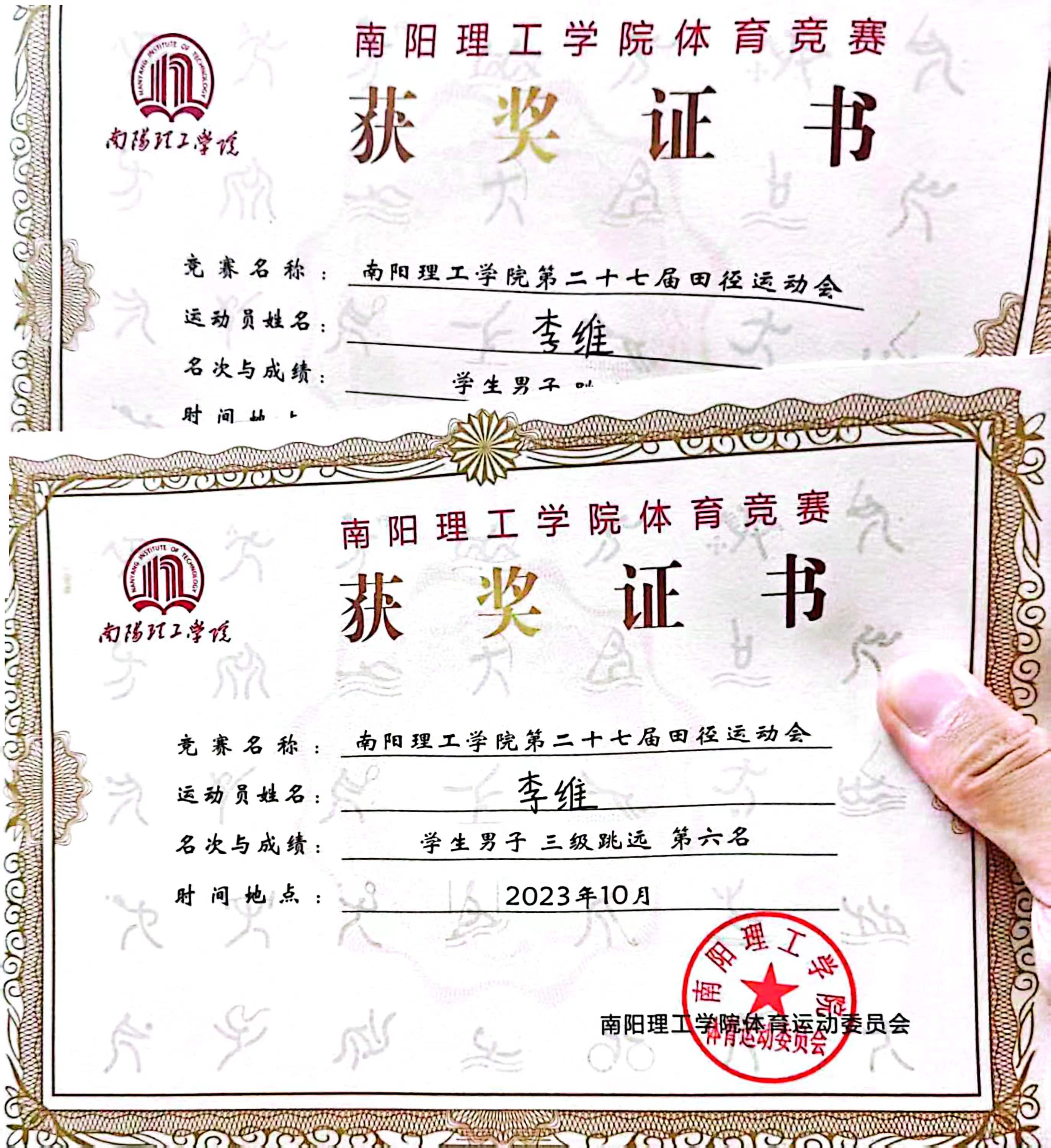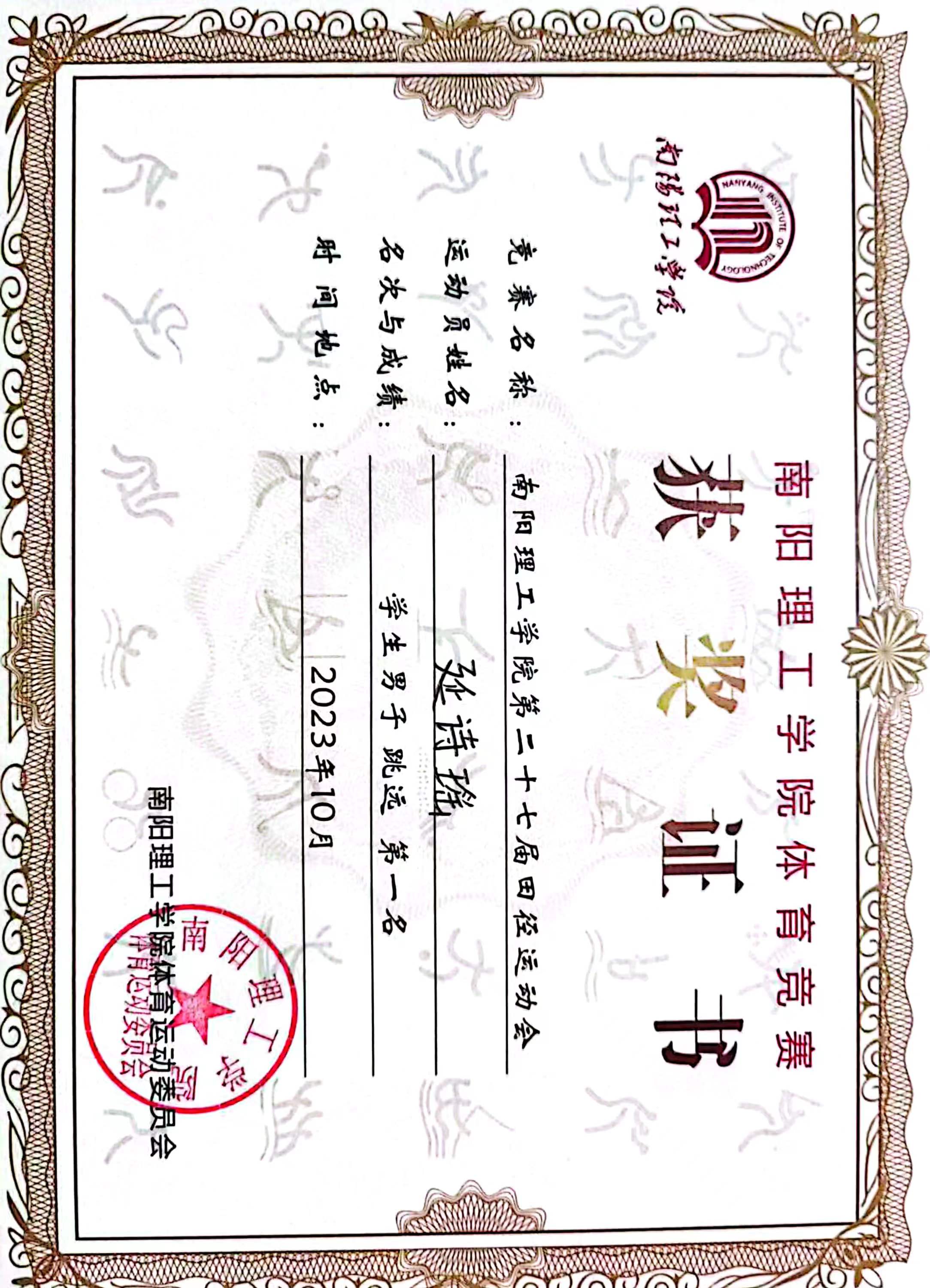 南阳理工学院第27届田径运动会6686体育获奖证书