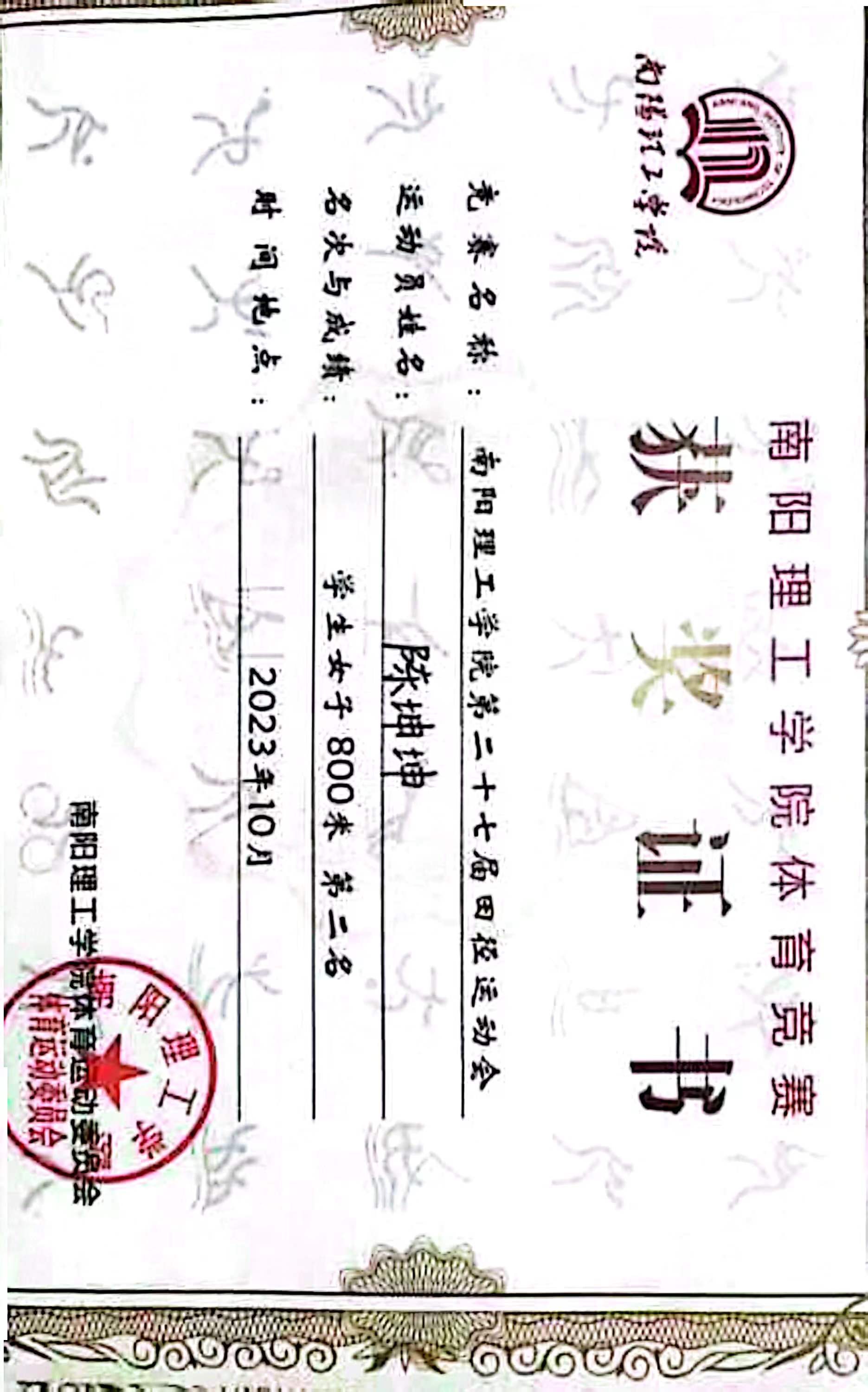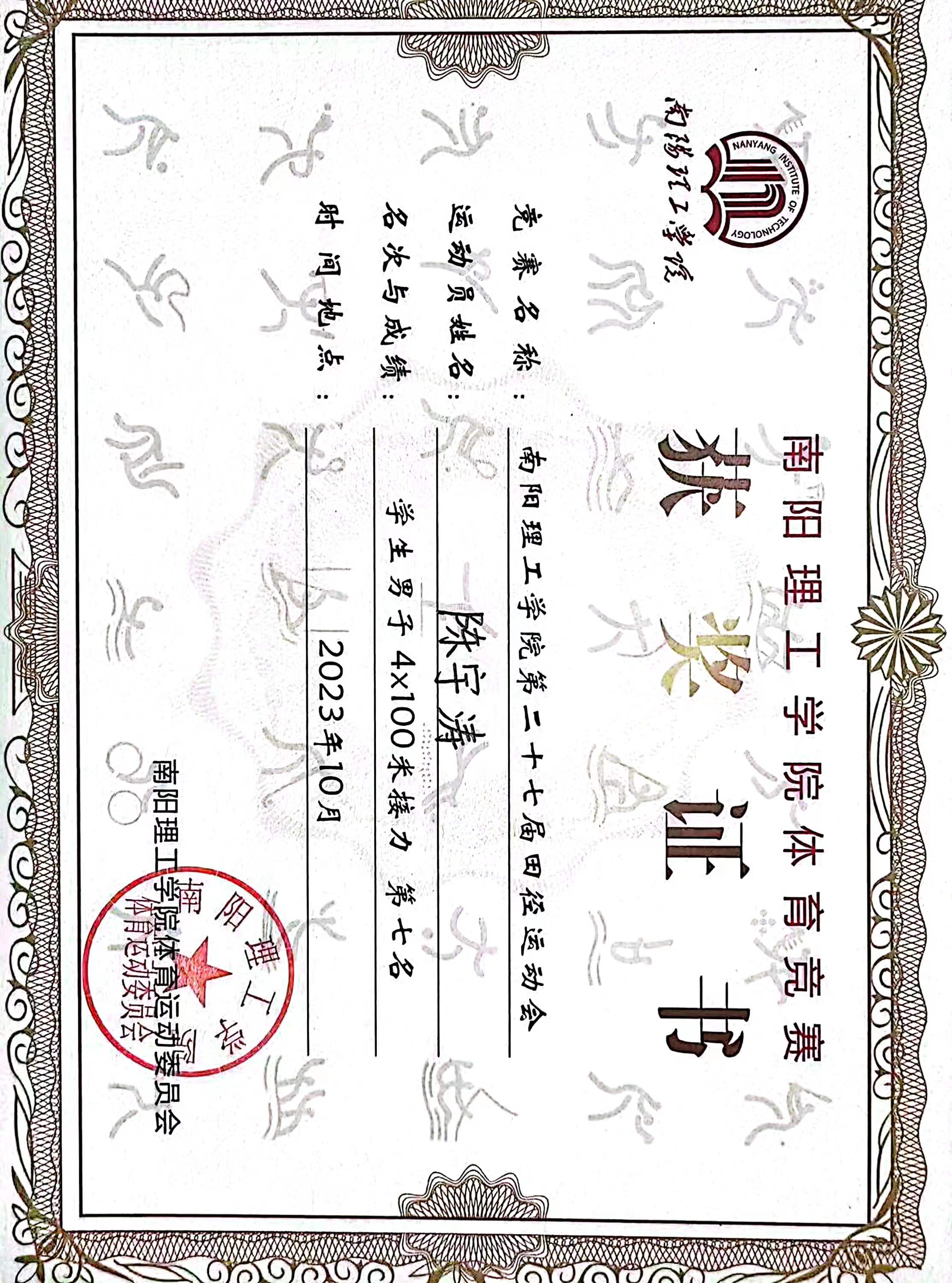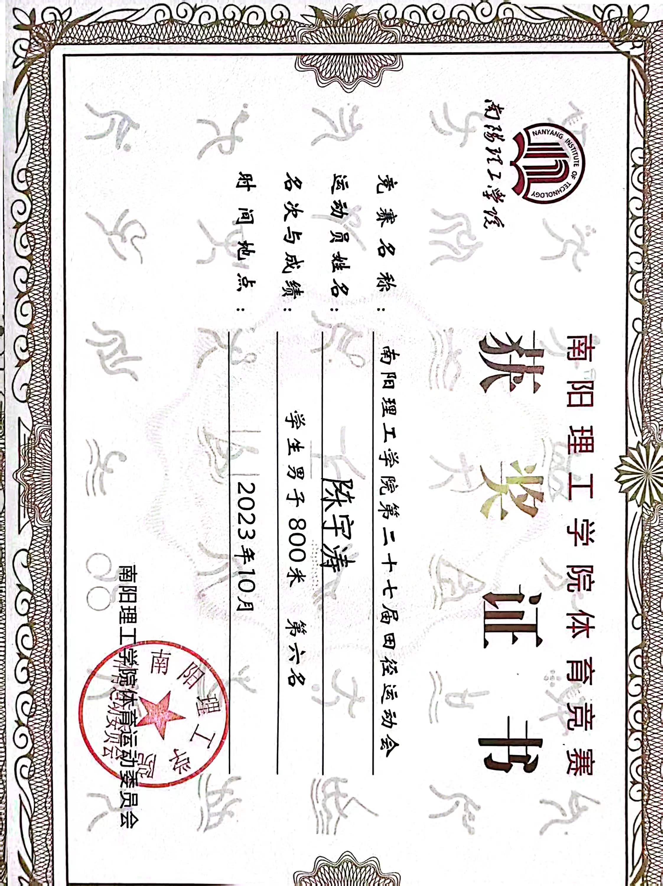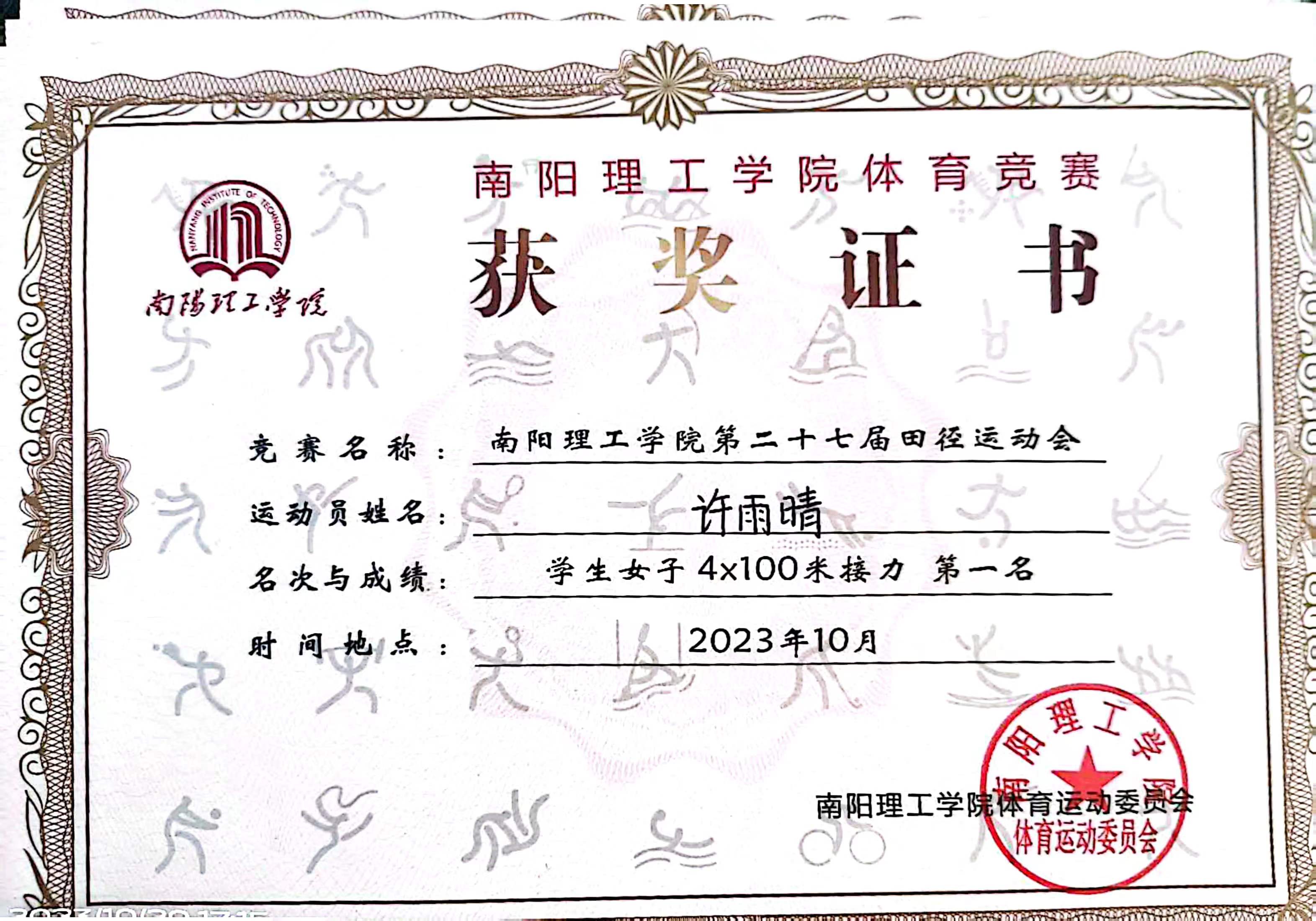 南阳理工学院第27届田径运动会6686体育获奖证书