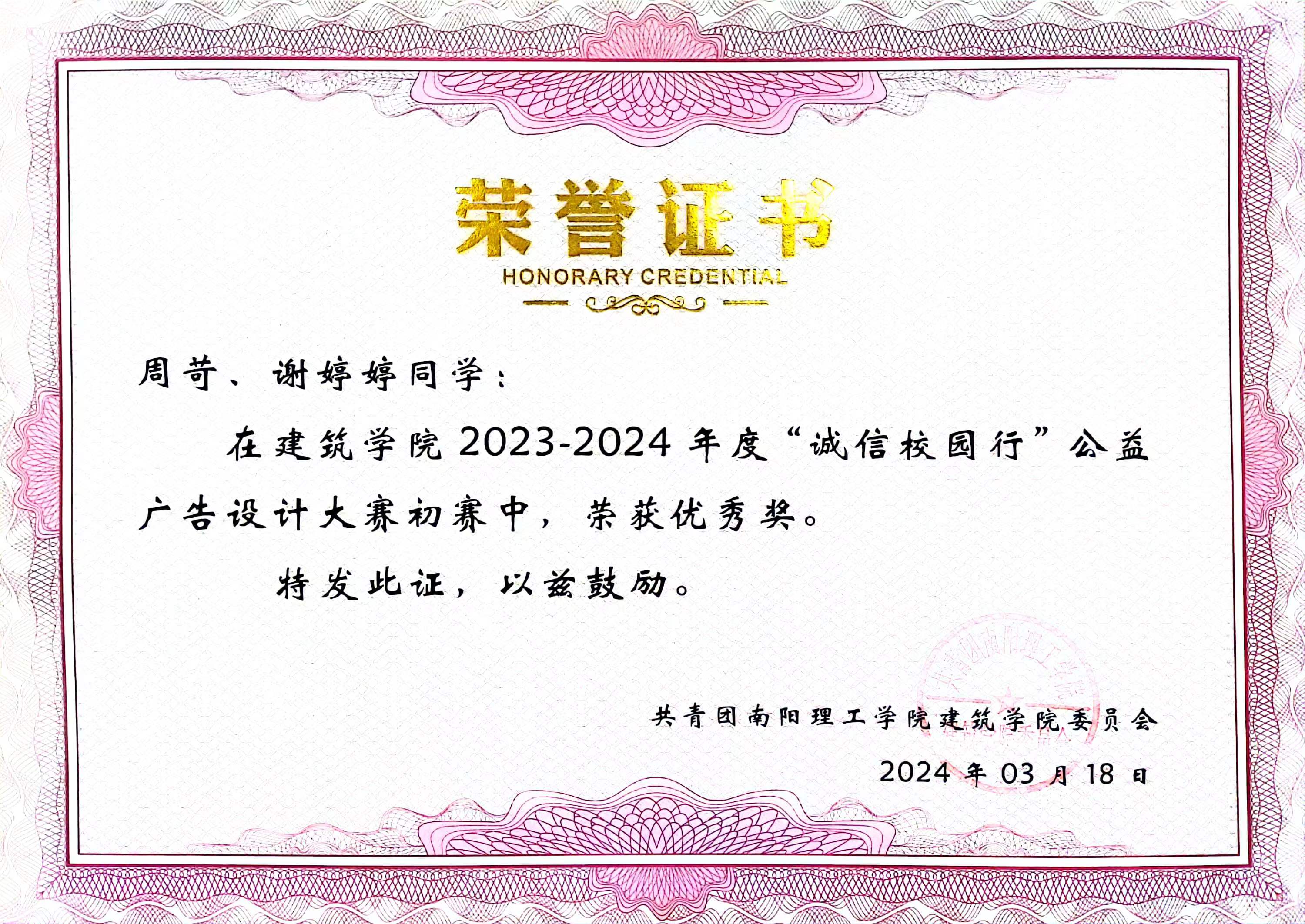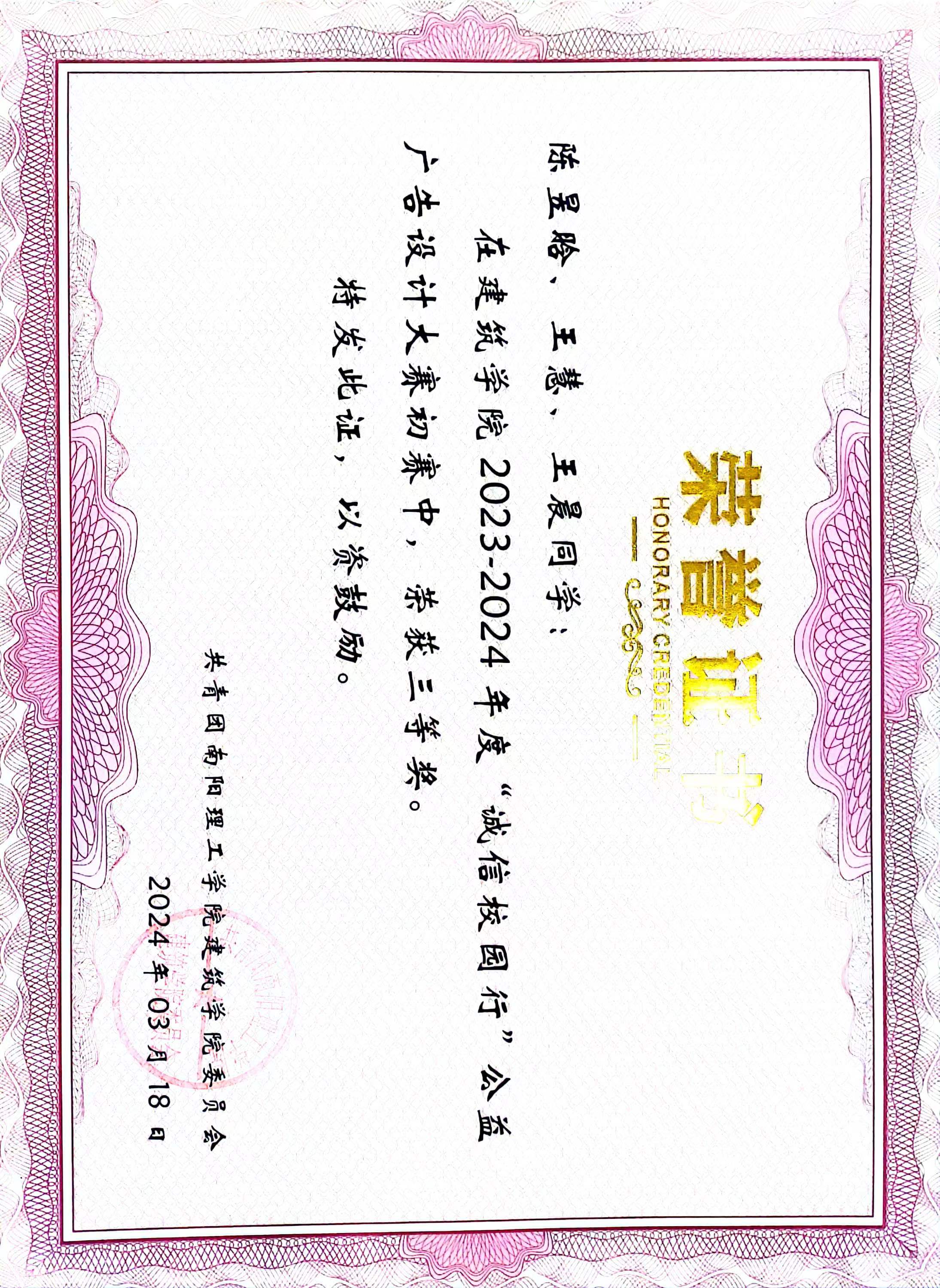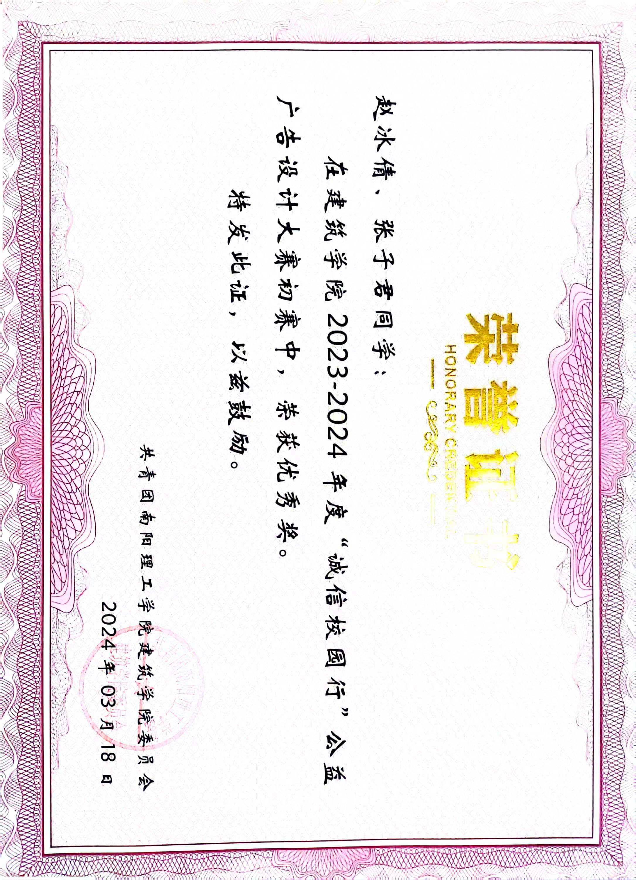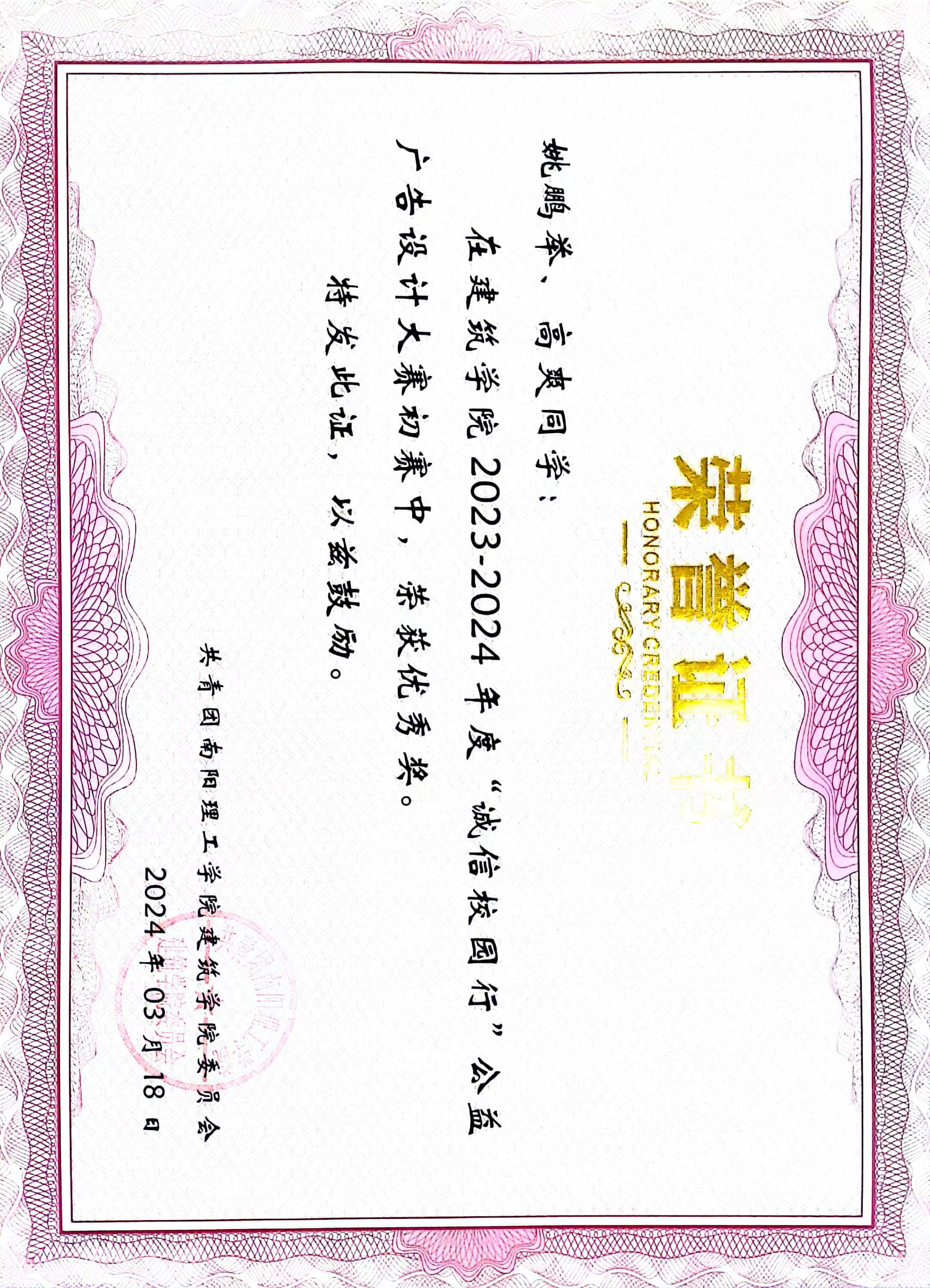 6686体育2023-2024年度“诚信校园行”公益广告设计大赛初赛获奖证书