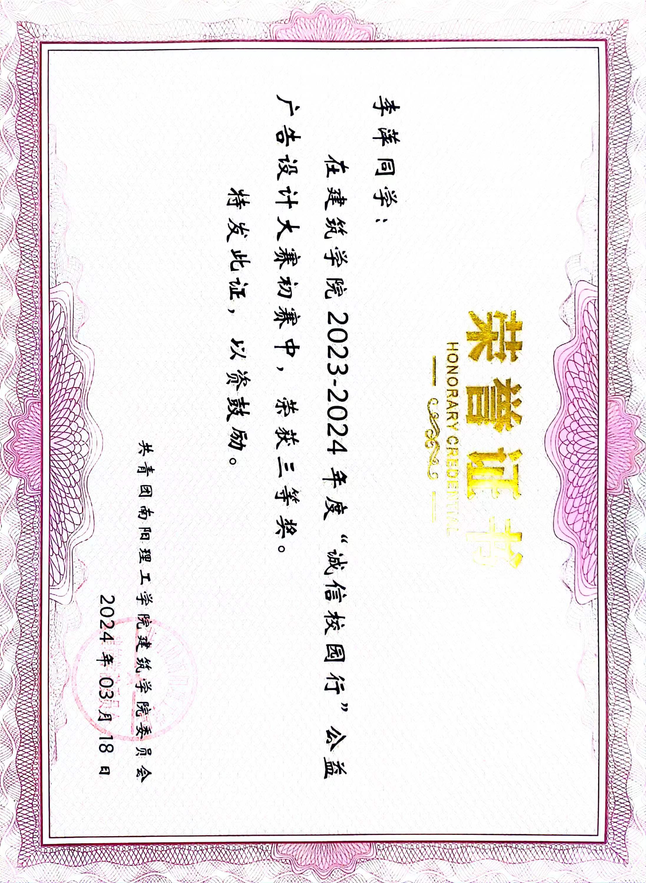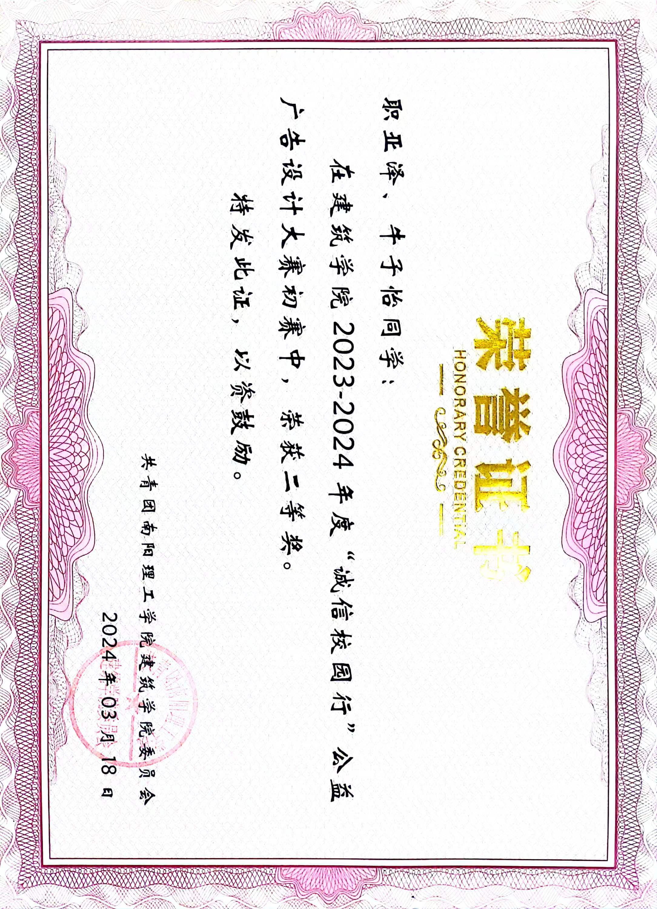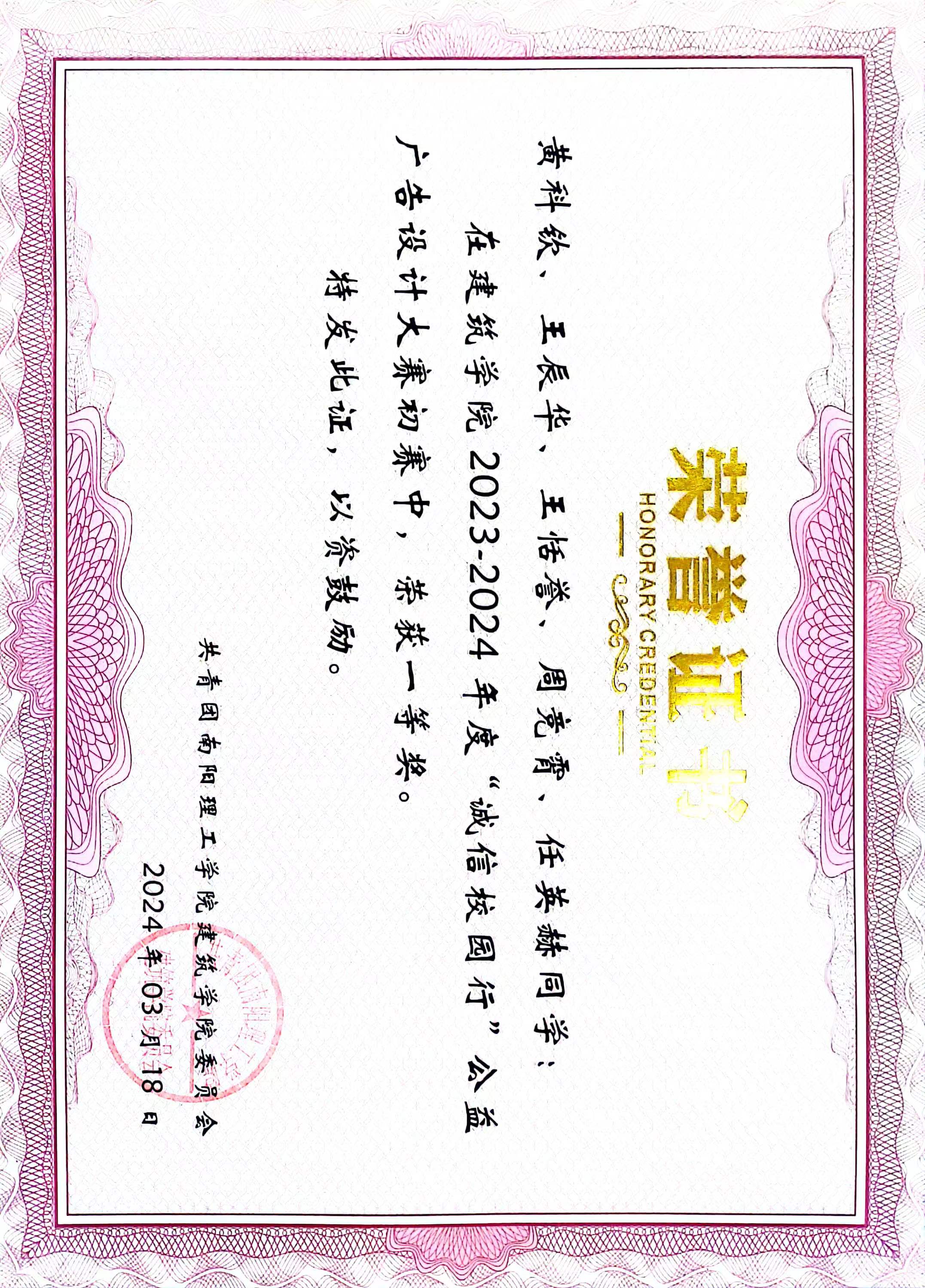 6686体育2023-2024年度“诚信校园行”公益广告设计大赛初赛获奖证书