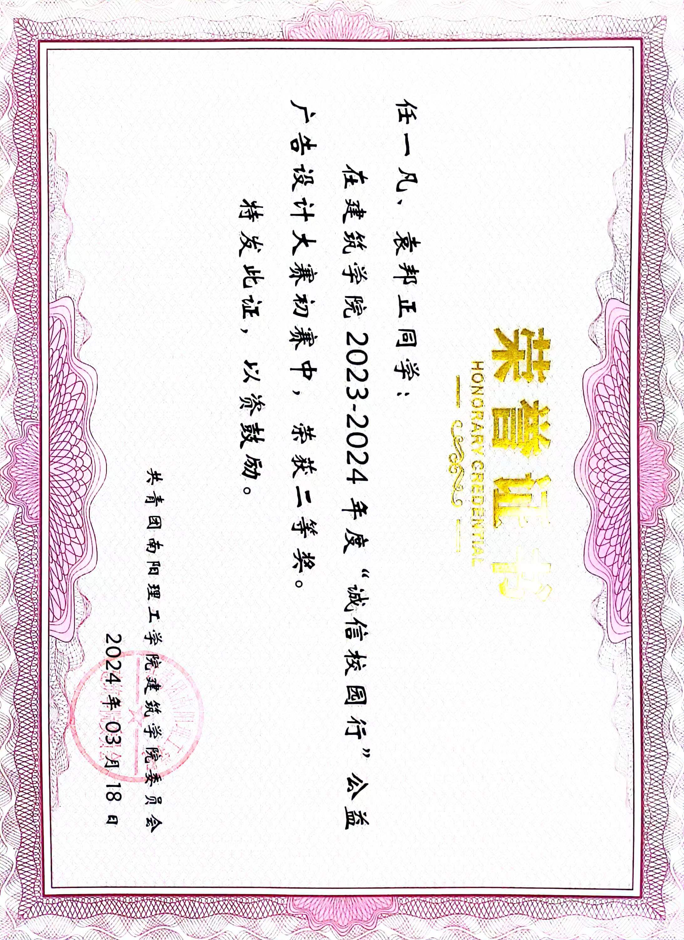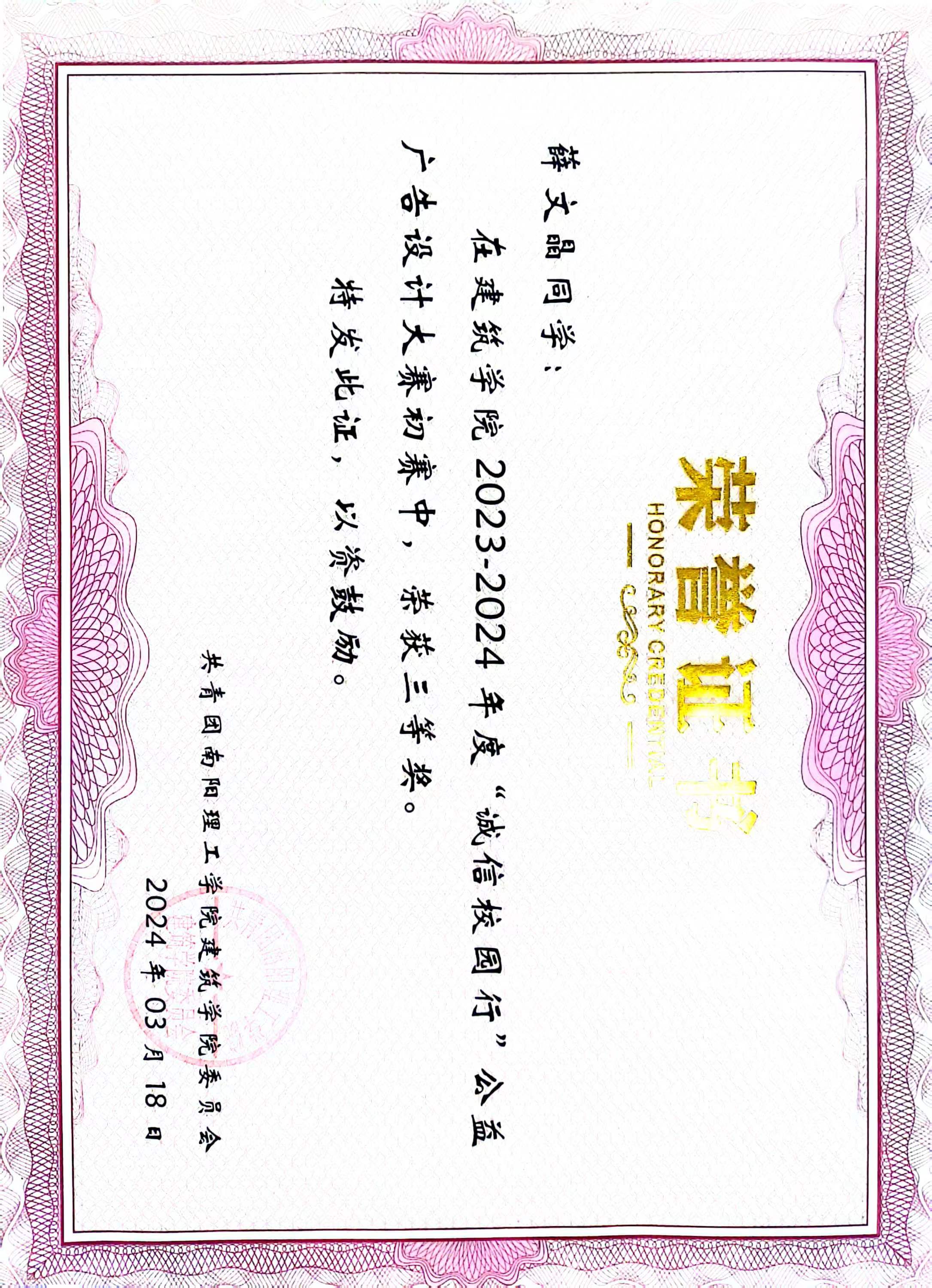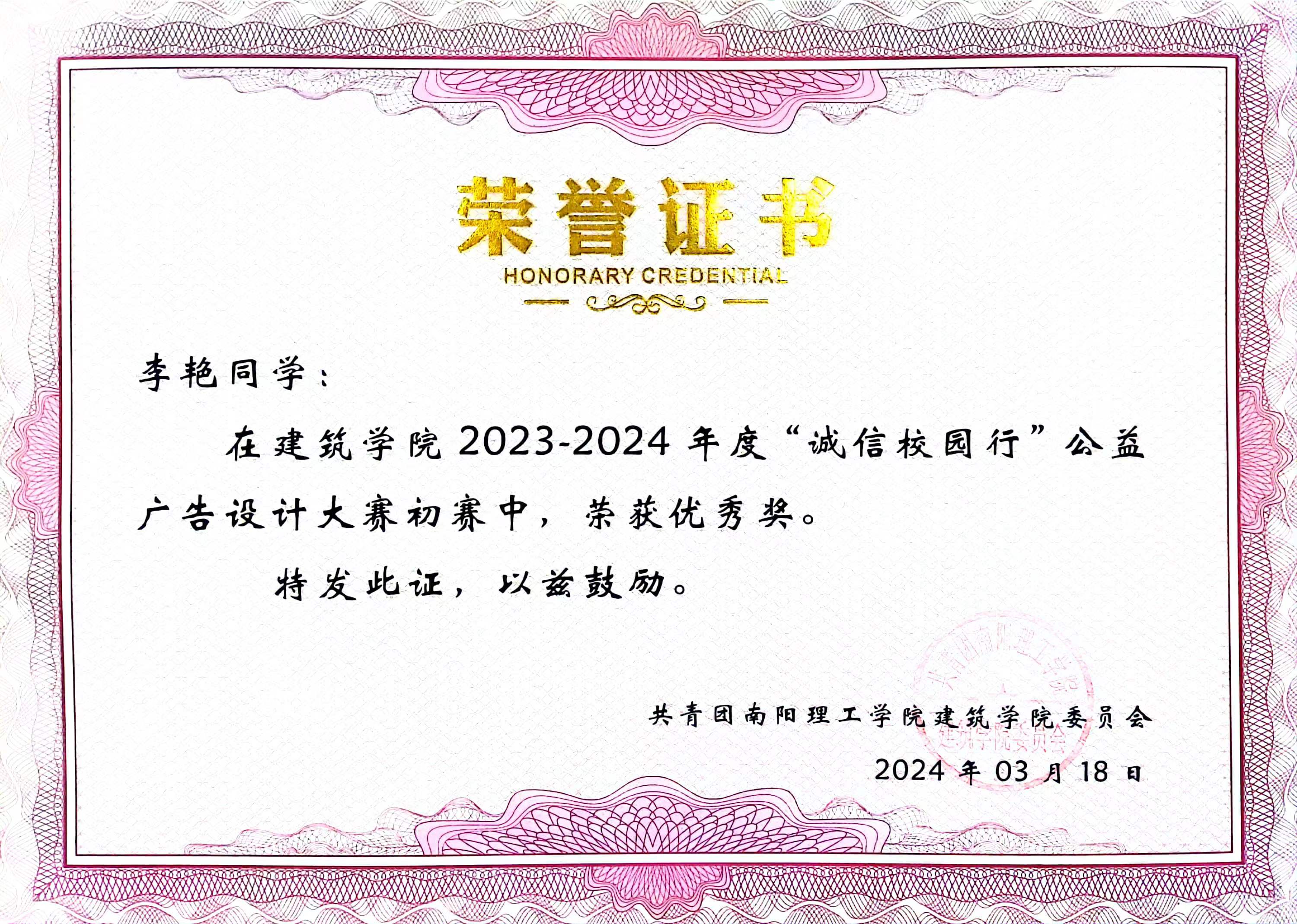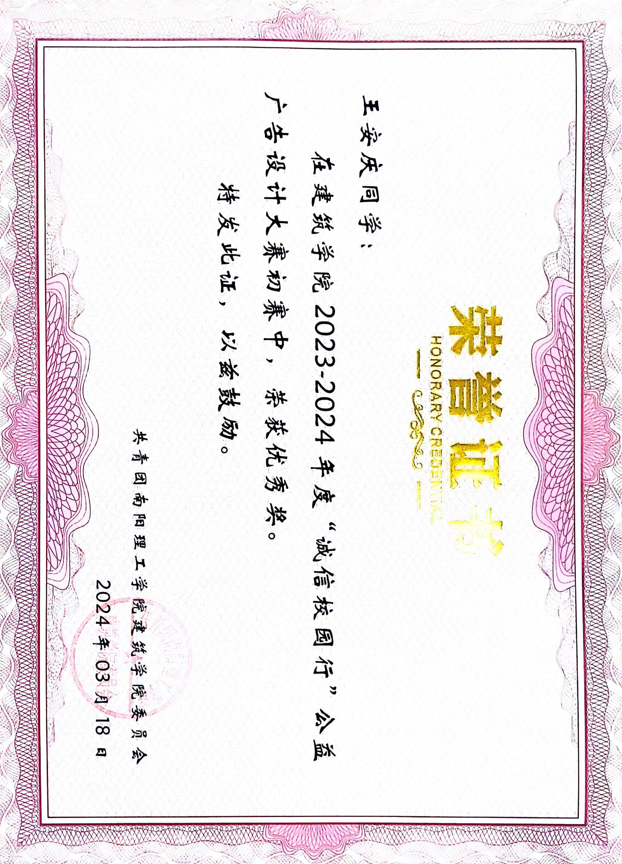 6686体育2023-2024年度“诚信校园行”公益广告设计大赛初赛获奖证书