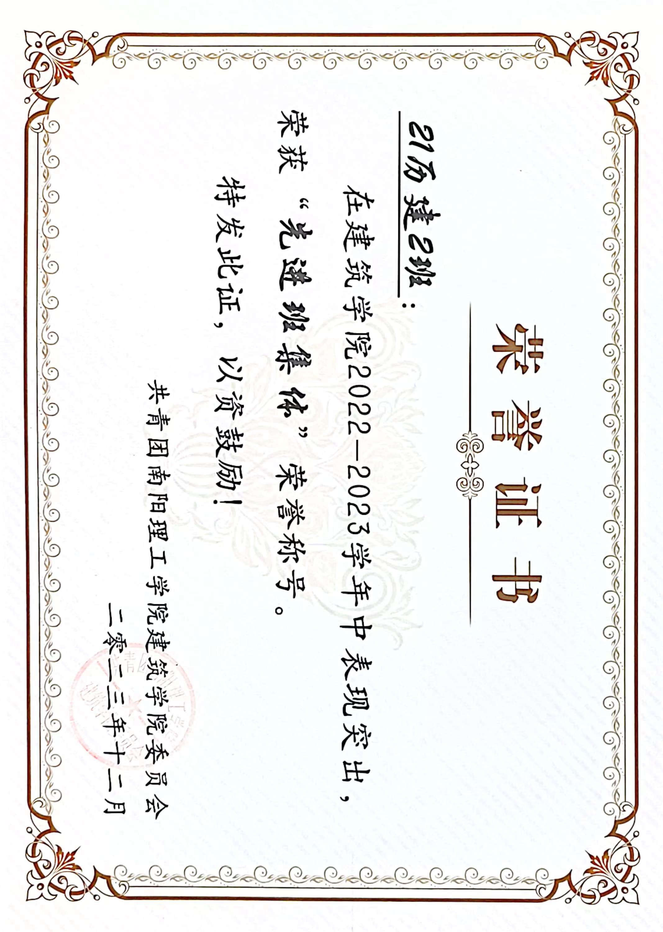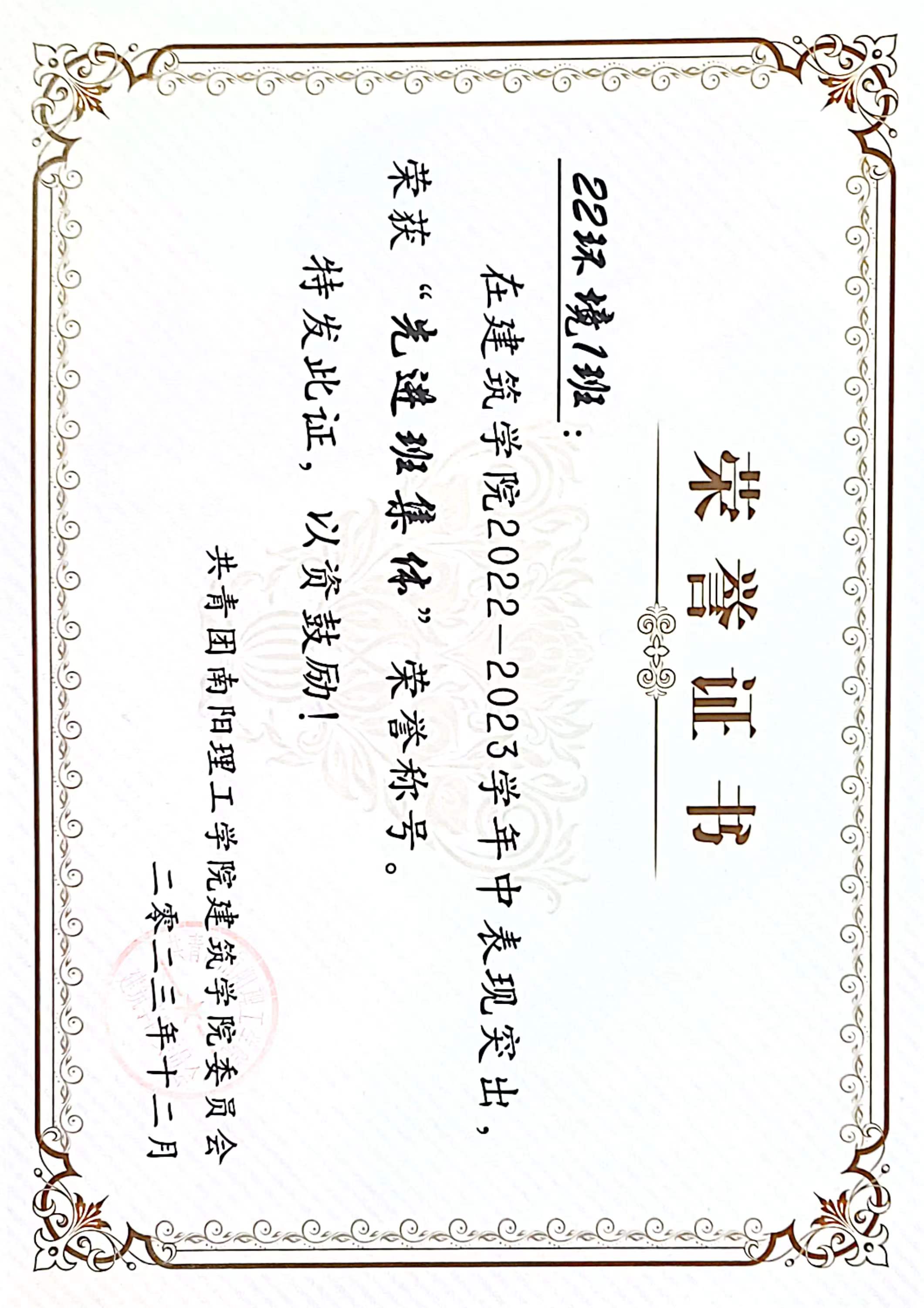 6686体育2022-2023学年“先进班集体”获奖证书