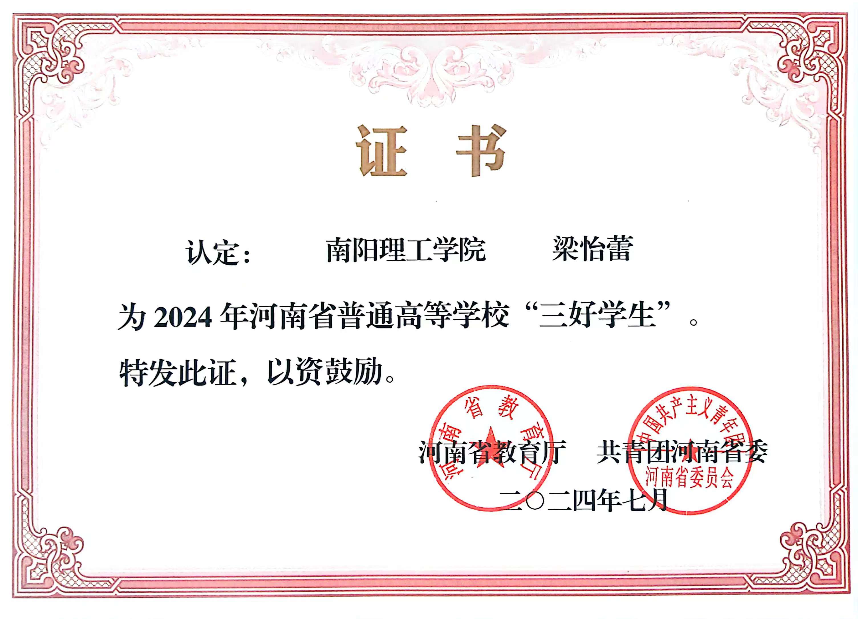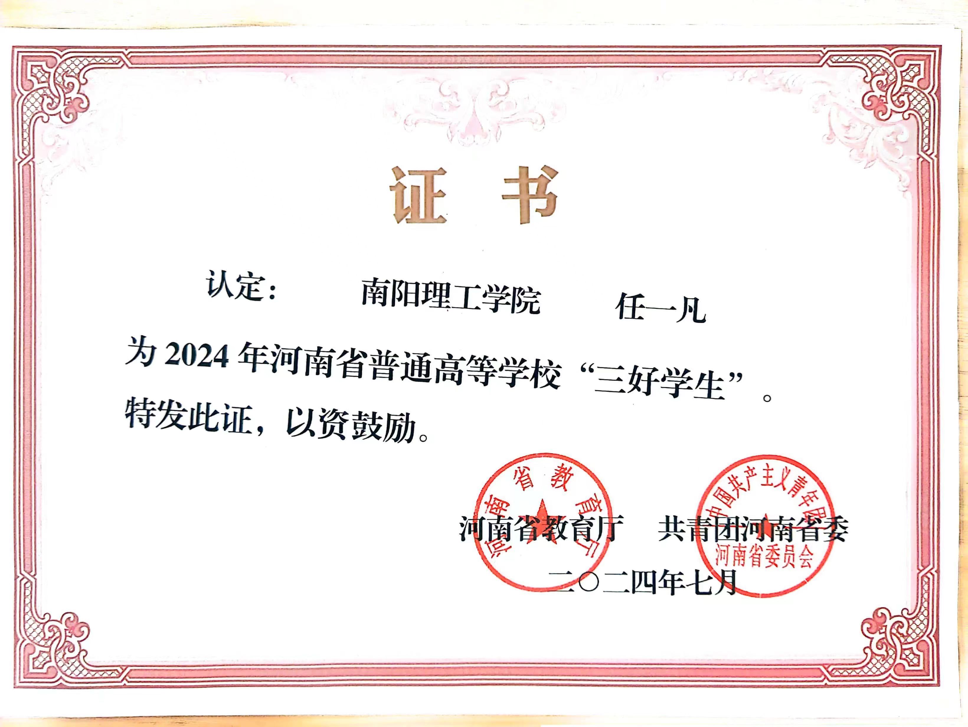 南阳理工学院2024年河南省普通高等学校“三好学生”获奖证书