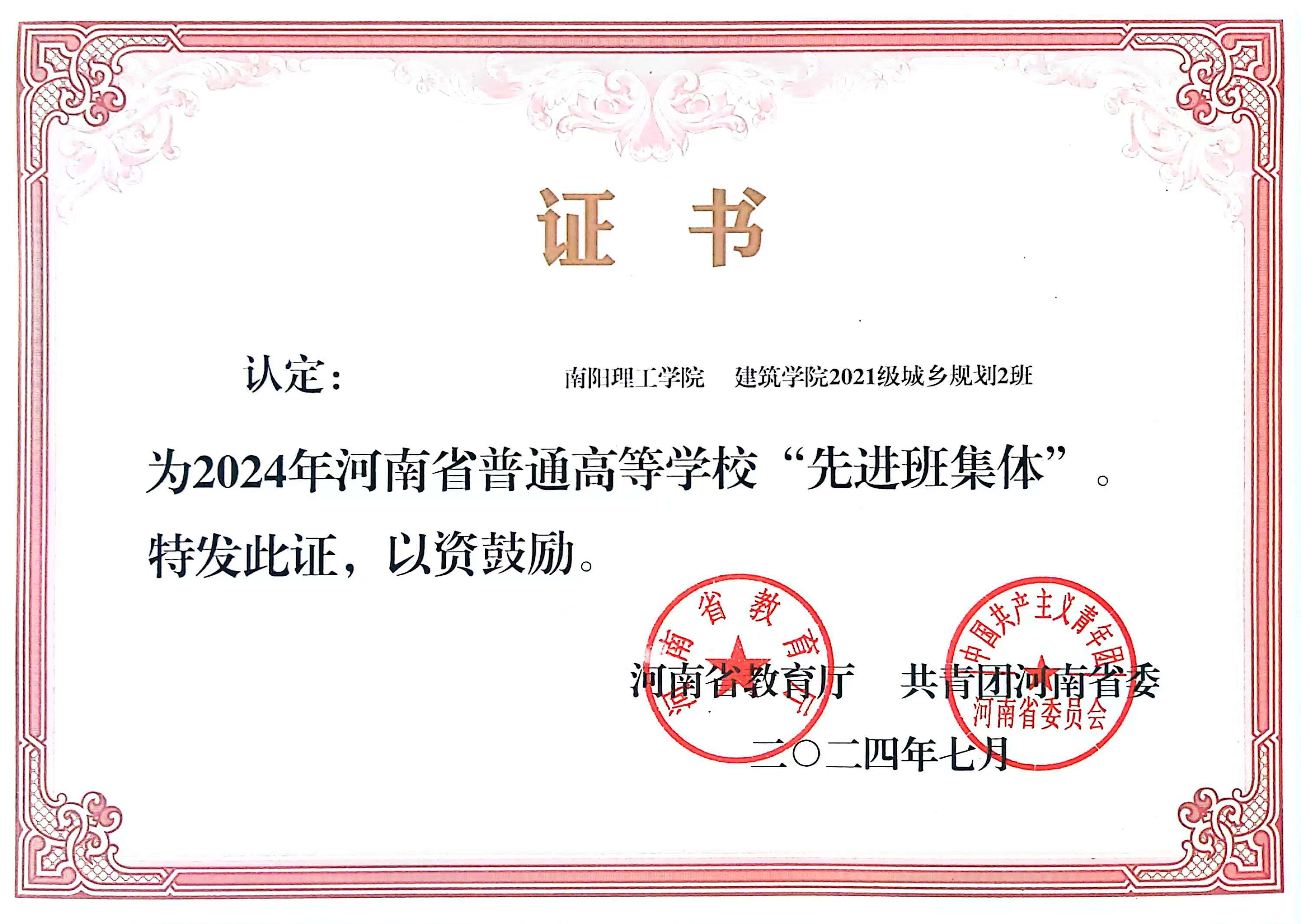 南阳理工学院2024年河南省普通高等学校“先进班集体”获奖证书